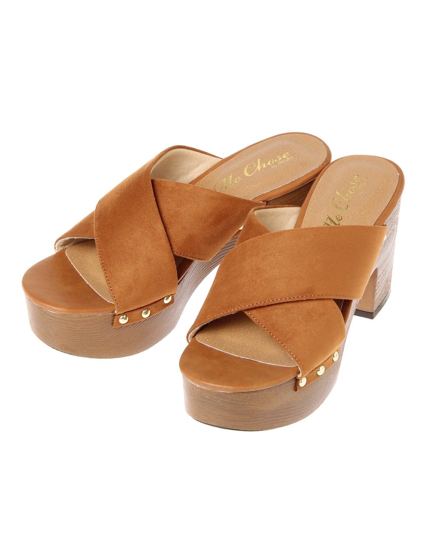 重厚感のあるシルエットとクラシカルなウッド調素材のサンダルは温かな雰囲気のある1足。クロスバンドデザインとストーム付きの高めヒールなので安定感があります。軽量で履きやすい万能アイテムはデイリーに活躍。ベーシックデザインなのでどんなスタイルにも相性抜群。肌馴染みの良いフェイクスェードはお手入れしやすいのもポイントです。
