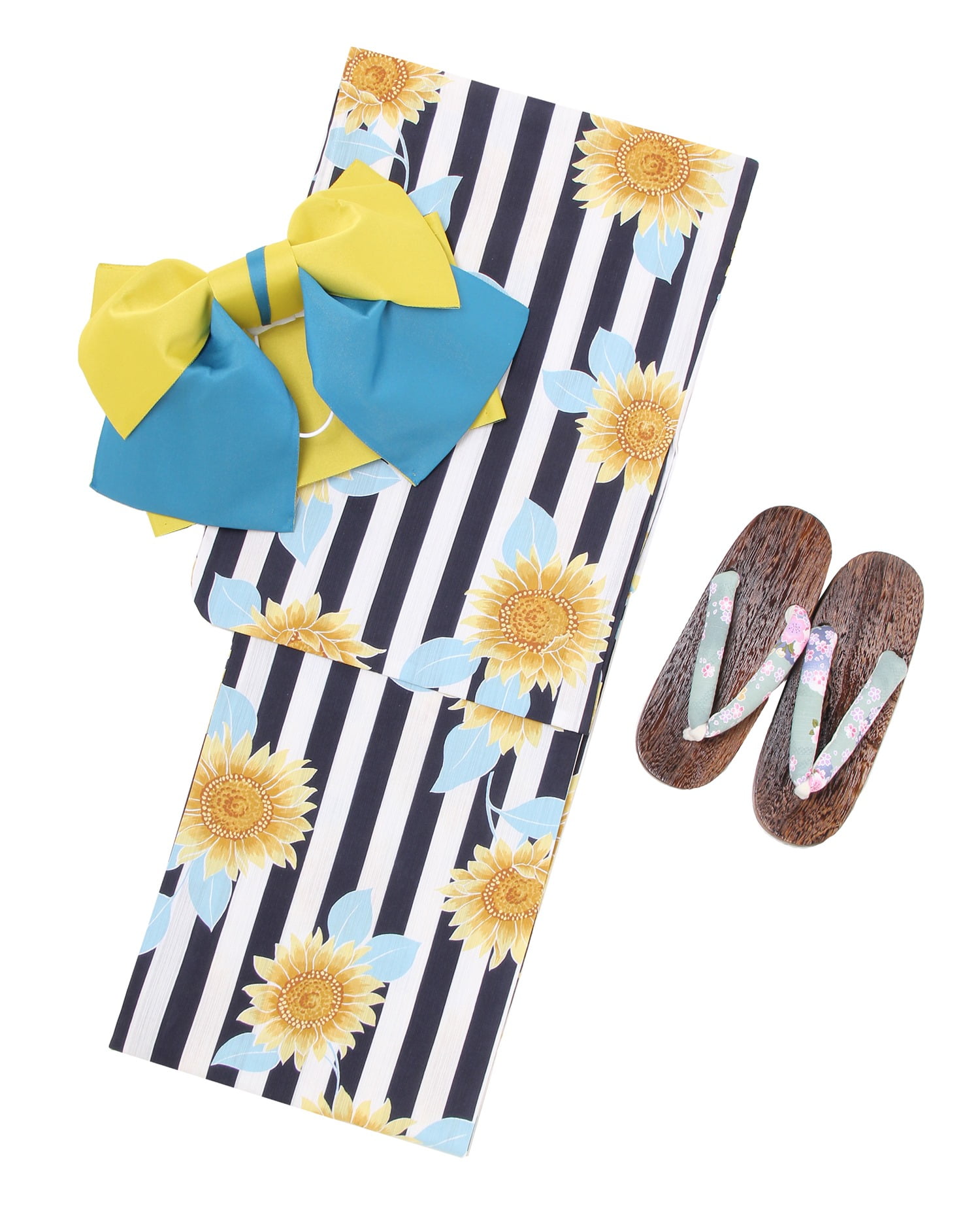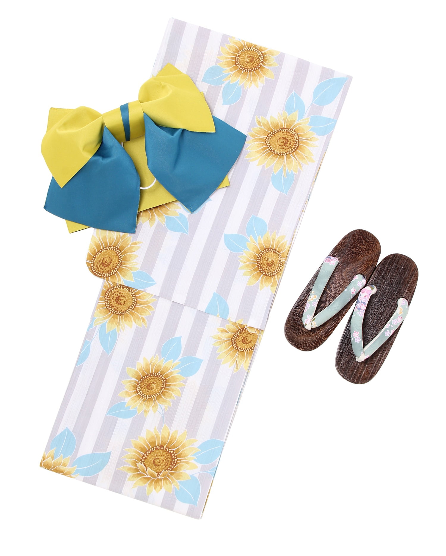 子供っぽくならずにおしゃれに着られる浴衣、帯、下駄の3点セット。着るだけで元気をもらえそうな定番の向日葵柄に、清涼感のあるブルーでアクセントをプラスしています。派手になり過ぎないペールトーンのカラーが上品。差し込み式で着付けも簡単な帯は、スタイリッシュなツートーンカラーで個性あふれる着こなしへと導きます。小花柄の鼻緒が魅力の下駄は、低めで歩きやすいのも◎。凛とした後ろ姿で颯爽と着こなして。
