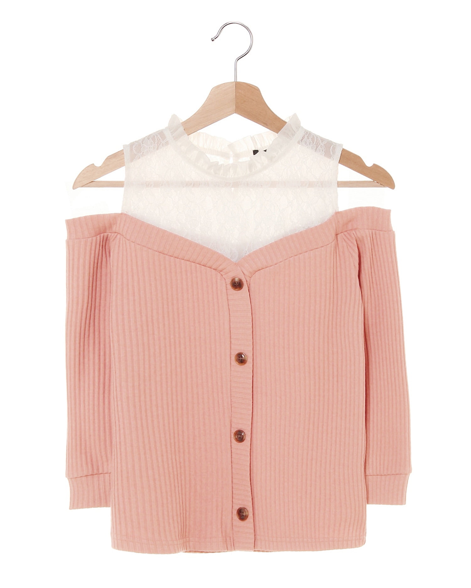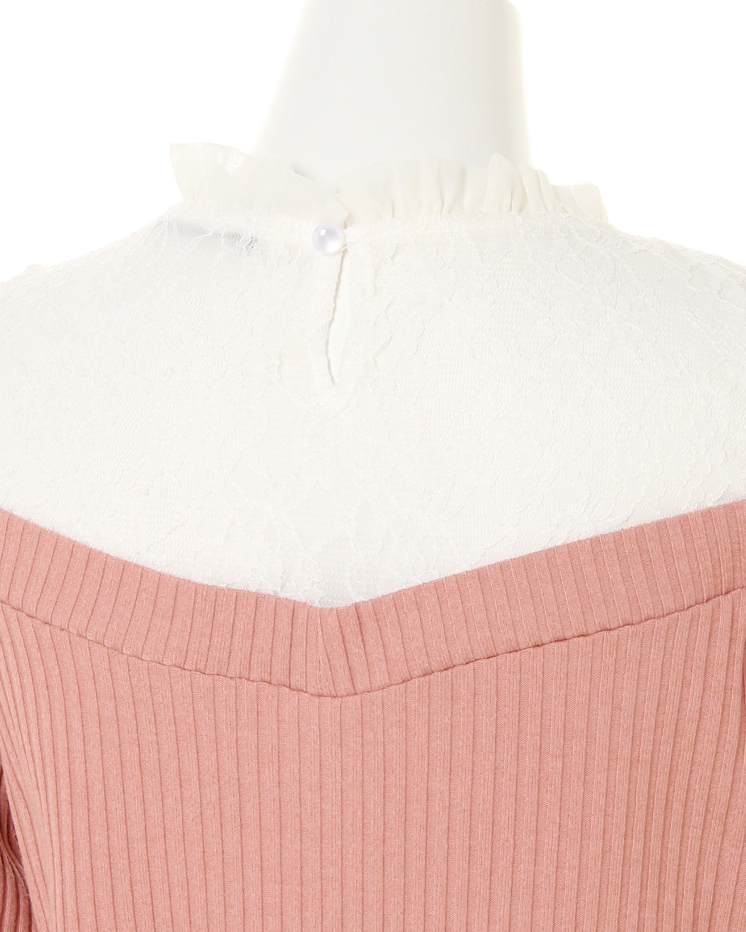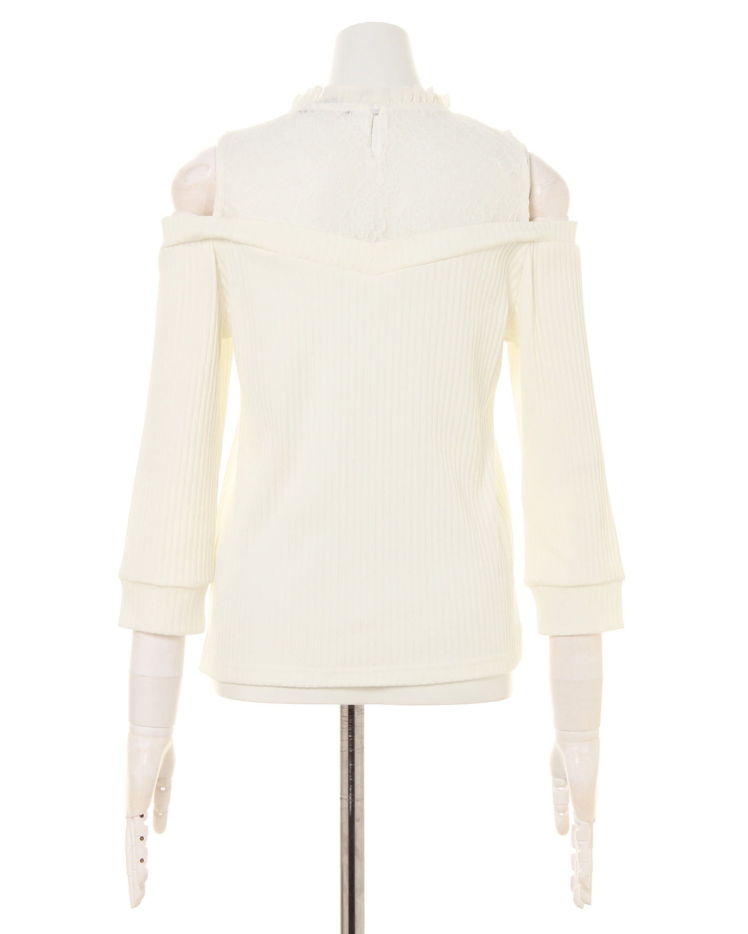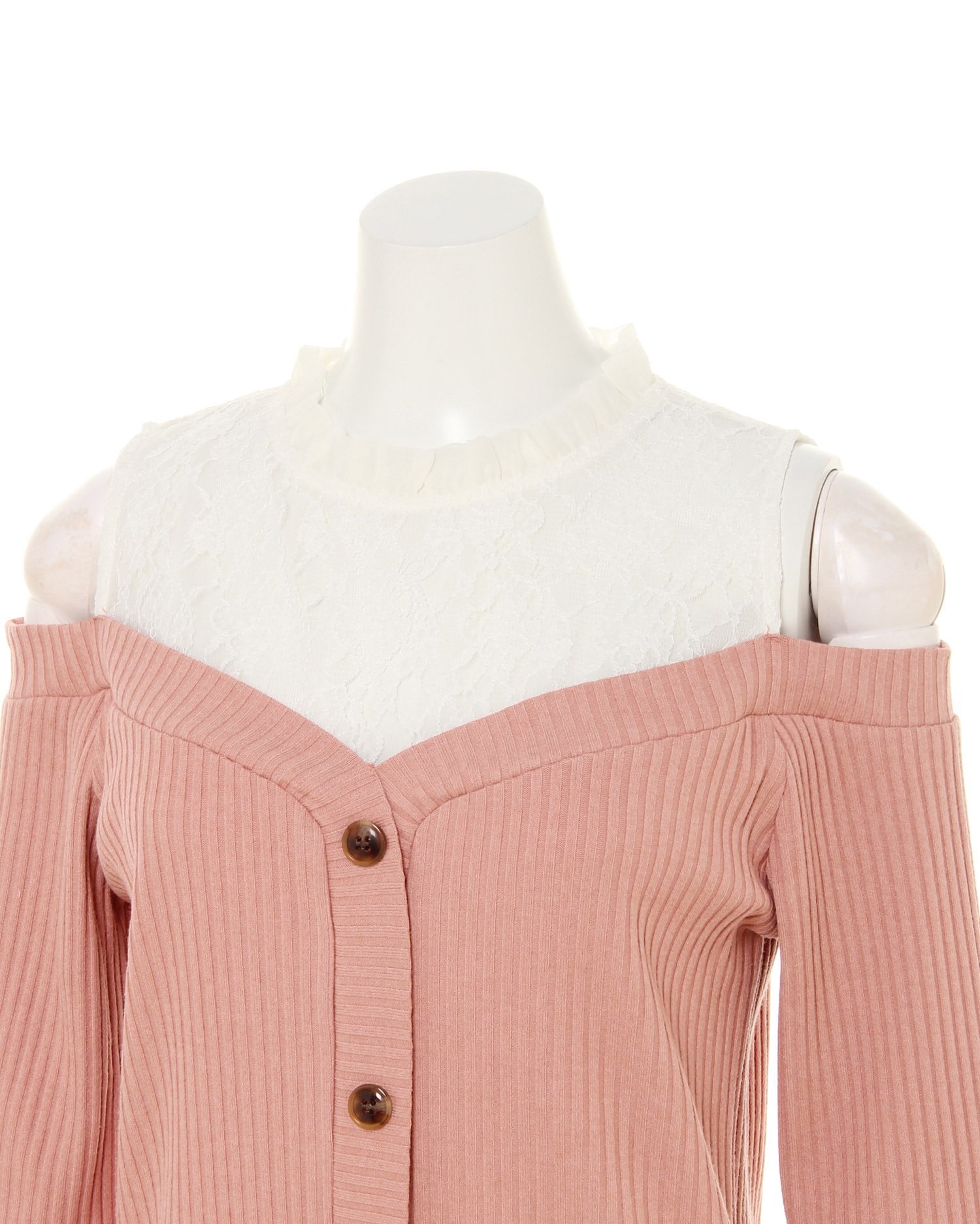 シンプル&ベーシックなリブトップスとエレガントなレースのレイヤードスタイルが1枚で楽しめるトップス。伸縮性が高い生地はハリがあり、オンオフ問わず着回しの幅が広いのも魅力的。レースからほんのり透ける肌と、オフショルで抜け感を演出します。首元にはレースをオン、顔周りを明るく彩ります。フロントの飾りボタンがアクセントに。ドッキングデザインで着崩れが少ないのも嬉しいポイントです。