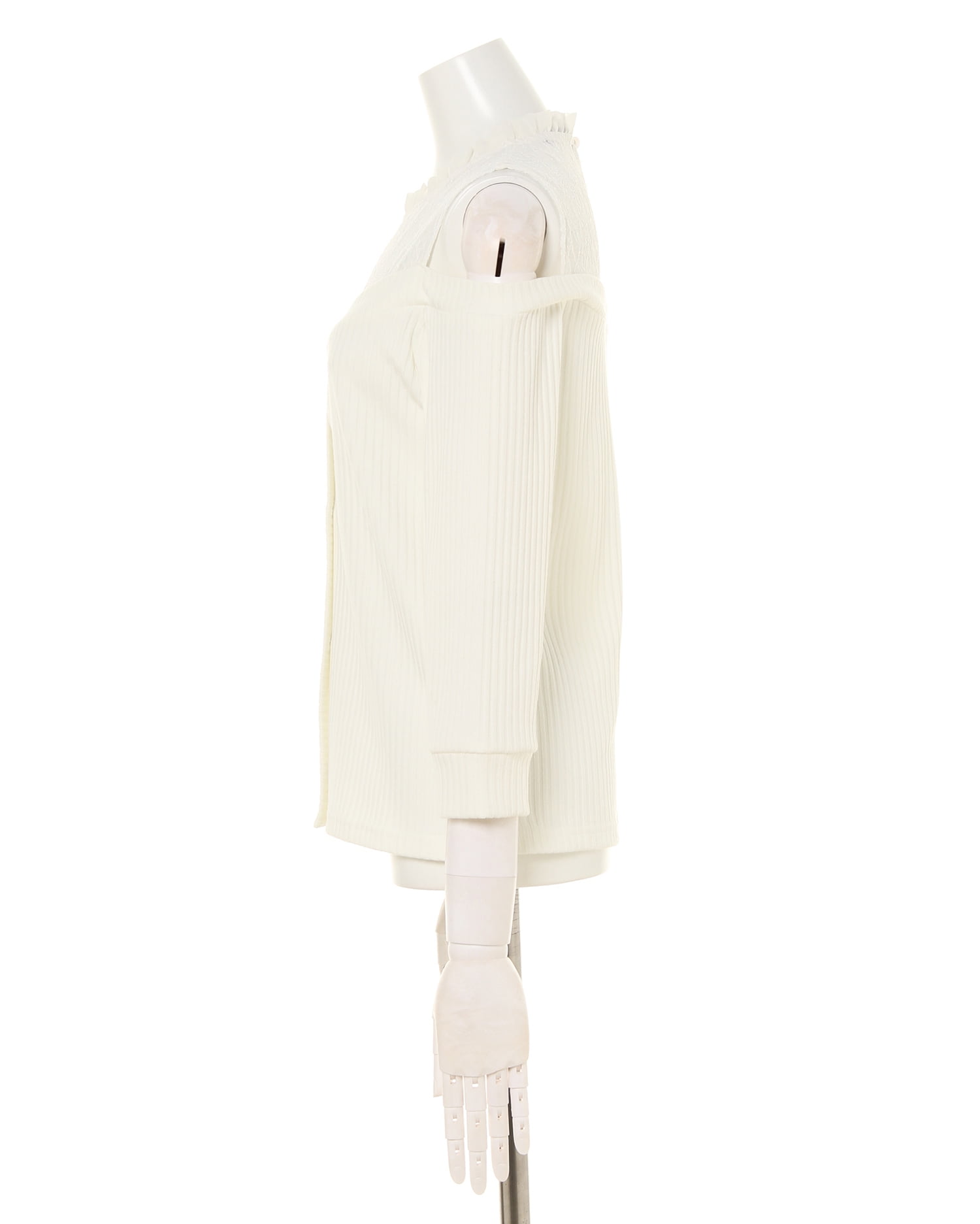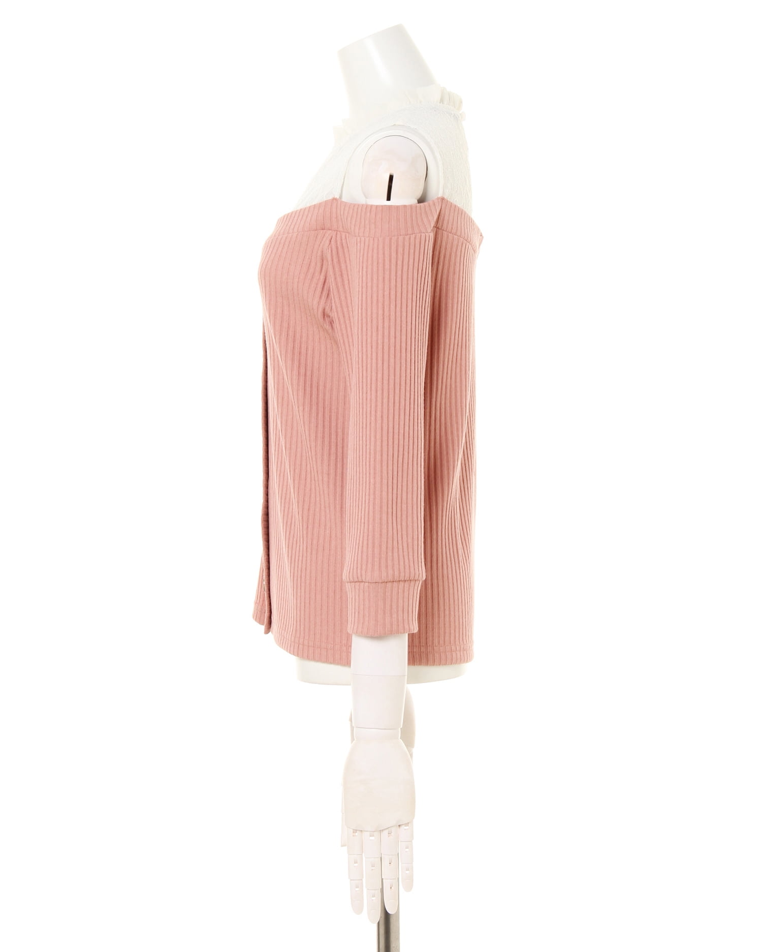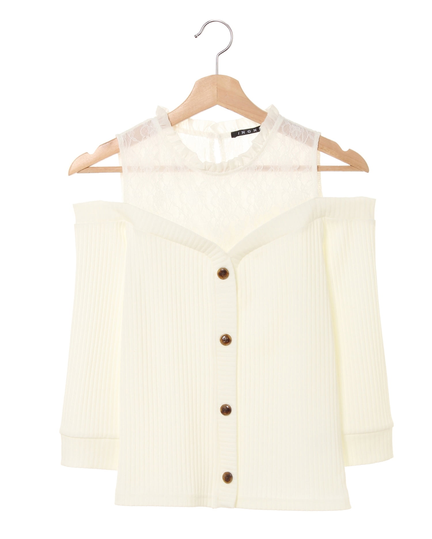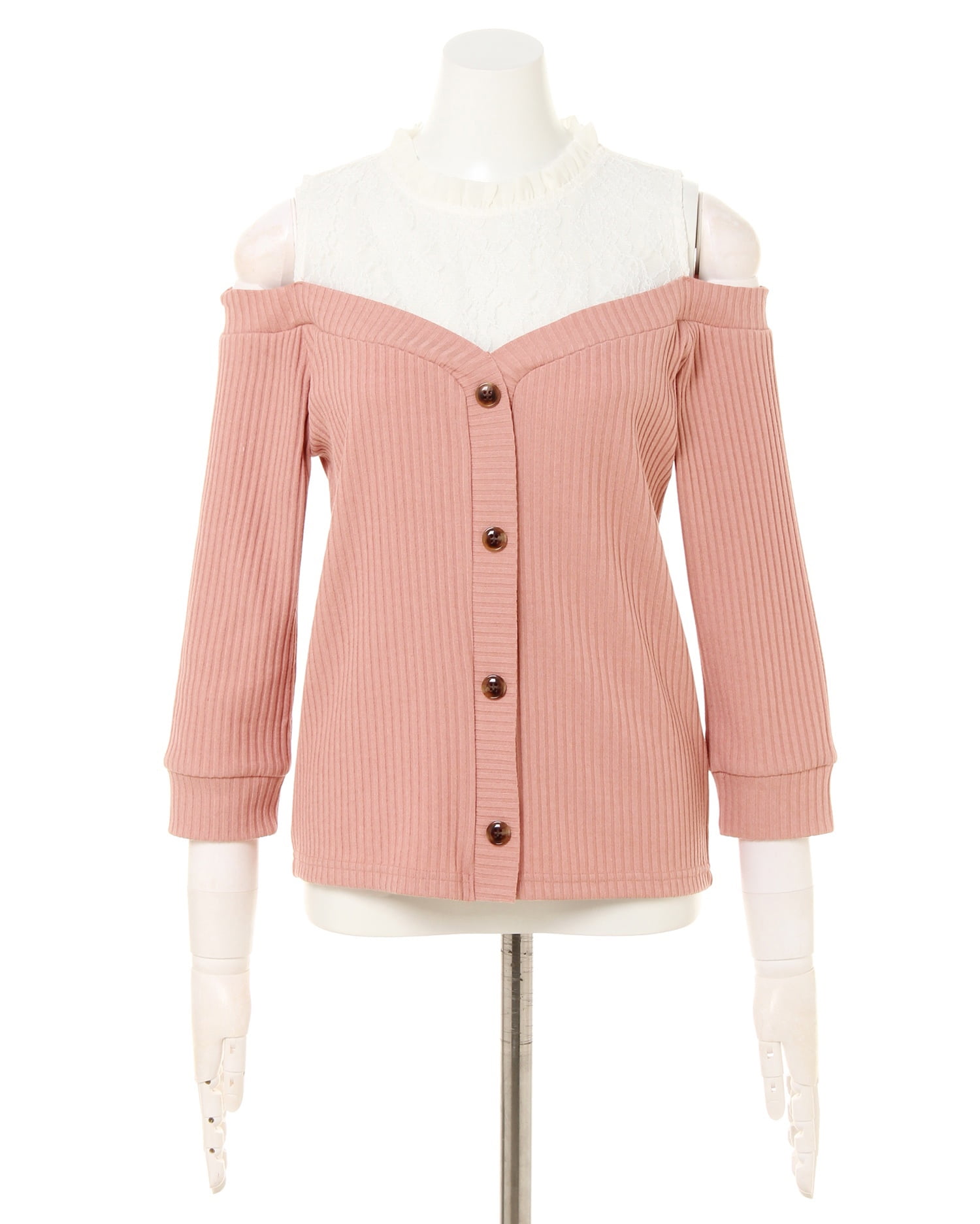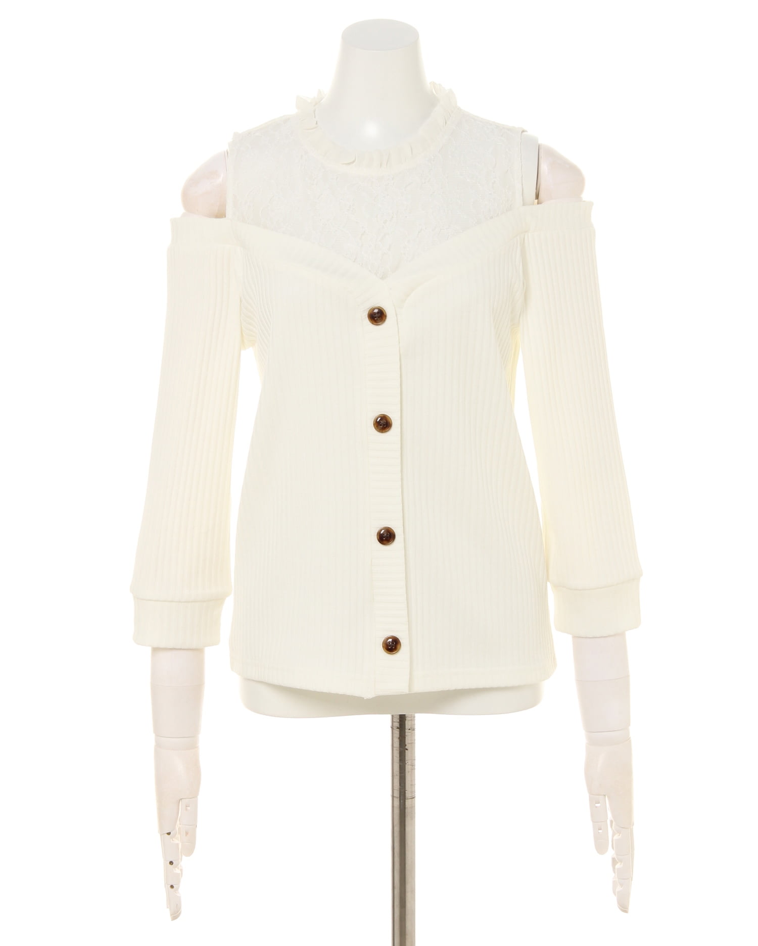 シンプル&ベーシックなリブトップスとエレガントなレースのレイヤードスタイルが1枚で楽しめるトップス。伸縮性が高い生地はハリがあり、オンオフ問わず着回しの幅が広いのも魅力的。レースからほんのり透ける肌と、オフショルで抜け感を演出します。首元にはレースをオン、顔周りを明るく彩ります。フロントの飾りボタンがアクセントに。ドッキングデザインで着崩れが少ないのも嬉しいポイントです。
