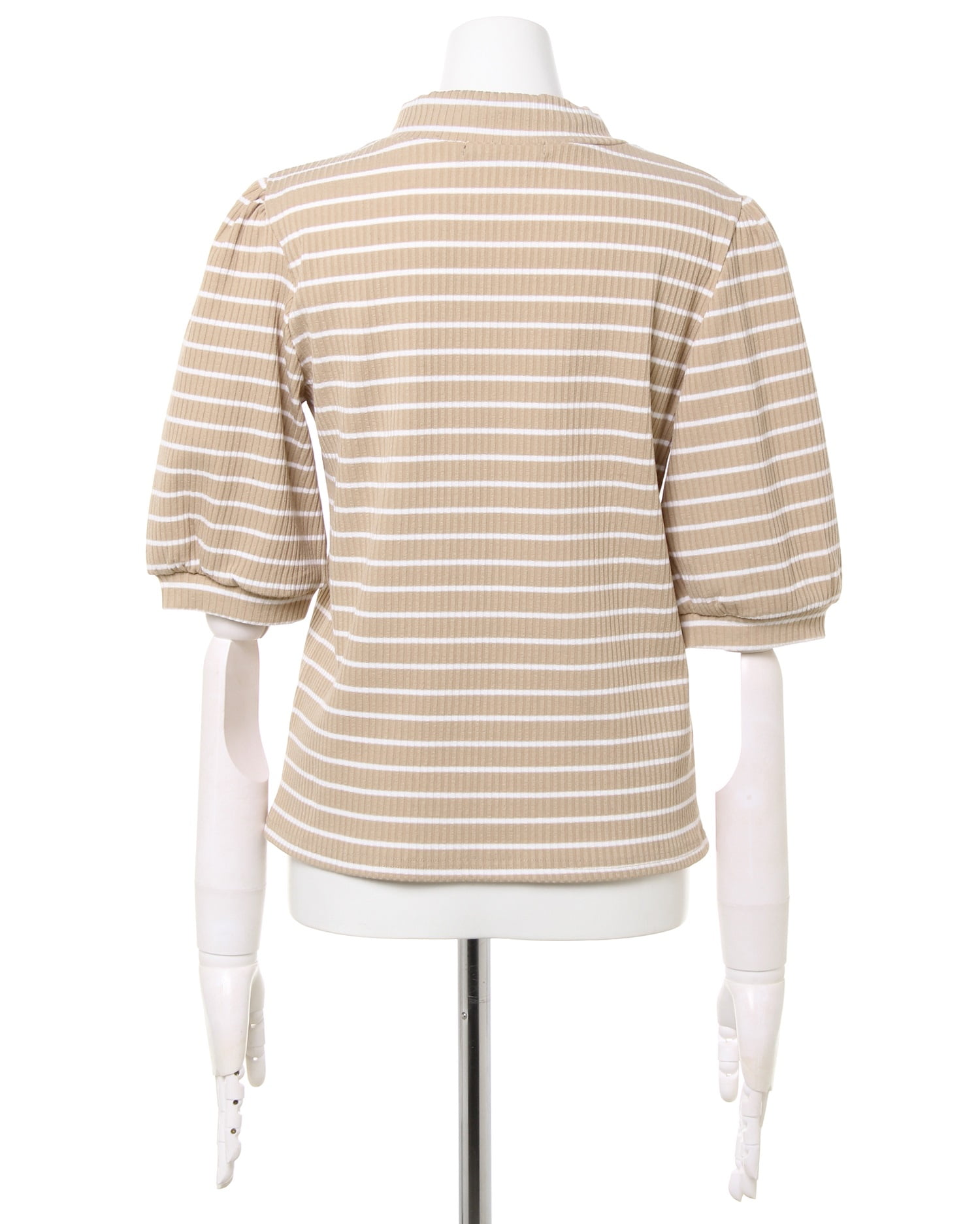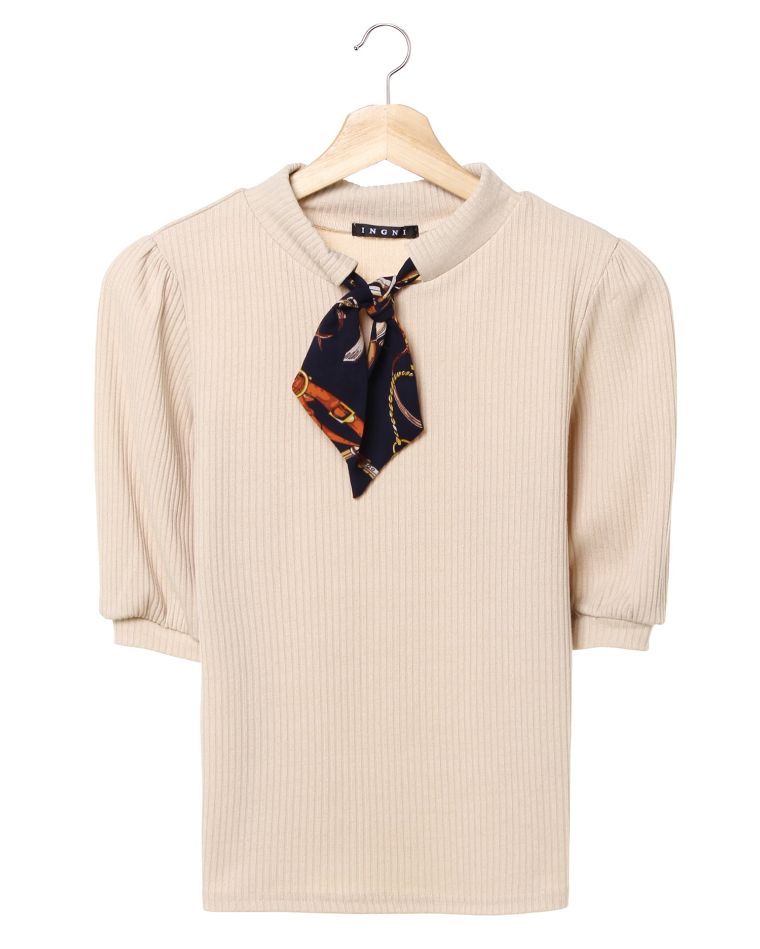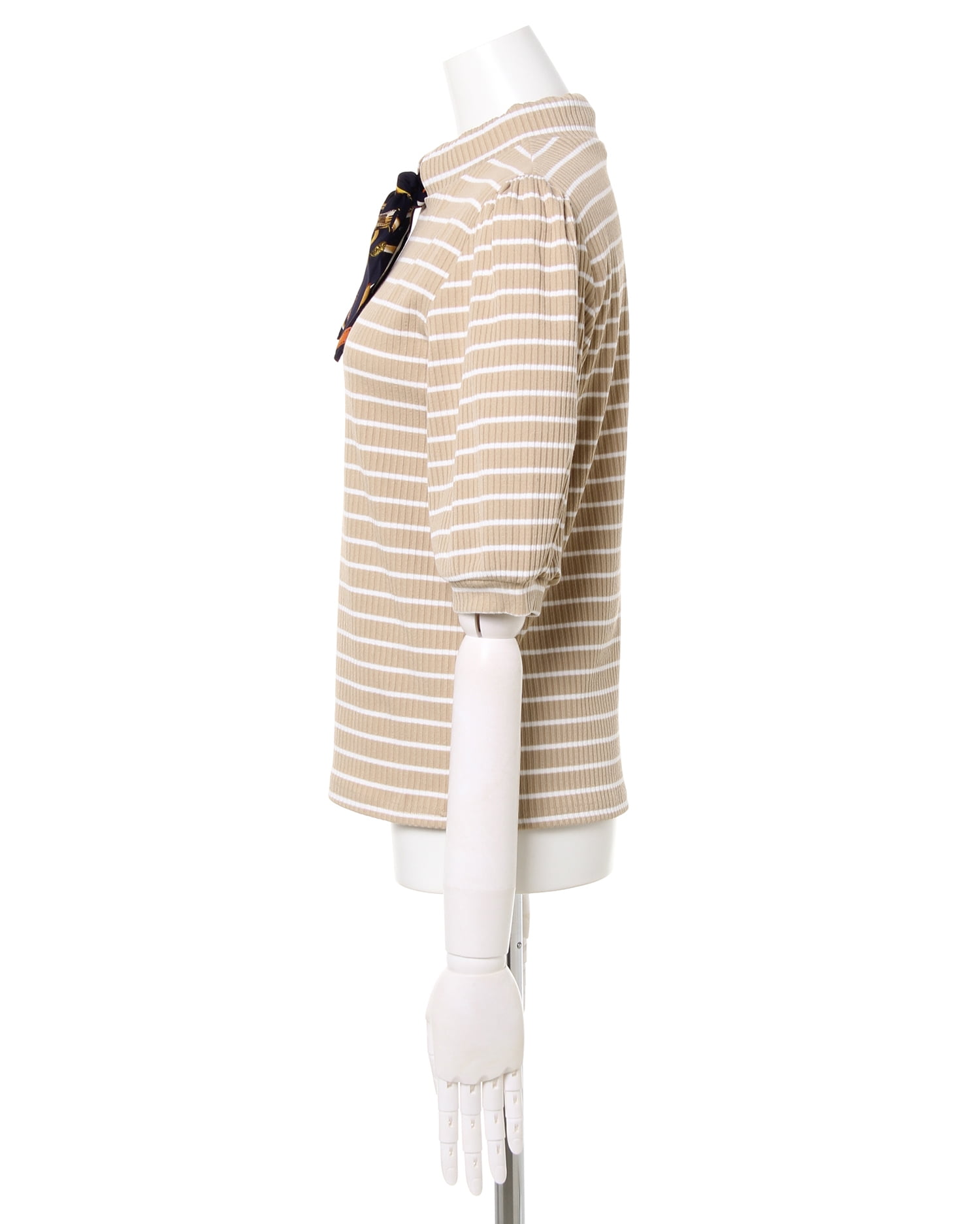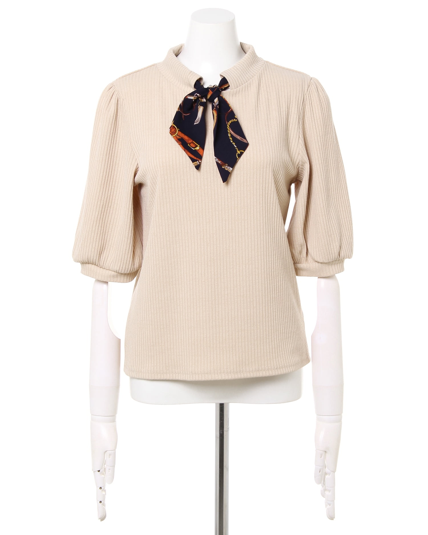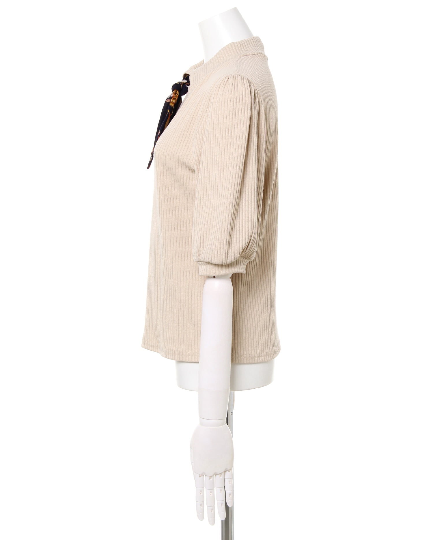 ベーシックなシルエットでどんなボトムスにも合わせやすいリブトップス。細畝のリブがボディラインに沿い、着心地も快適。ふんわりとしたスリーブでフェミニンな印象に仕上げています。長めの袖丈は気になる二の腕もすっきり見せてくれるのも◎。ネック部分にあしらったスカーフがアクセントに。きちんと感があるのでオンオフ問わずに着回せます。