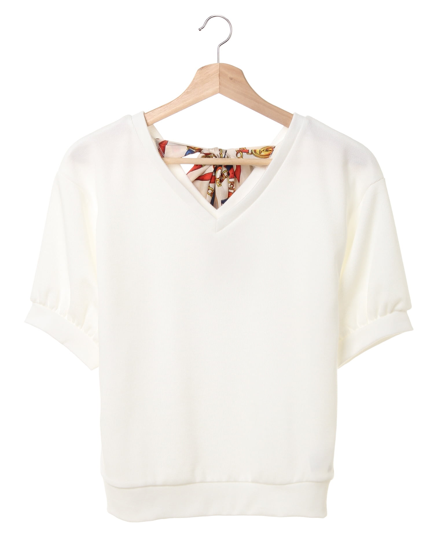 後ろ部分にあしらったスカーフがインパクト抜群の半袖トップスは柔らかで上品な素材が素敵。程よいゆとりの身幅とドロップショルダーのシルエットが今年らしい1枚。こなれた雰囲気とリラックスした着心地を実現します。ほんのりハリのある生地は、きれいなシルエットをキープしてくれるのも魅力的。きちんと感があるので、オフィスカジュアルスタイルにもオススメです。