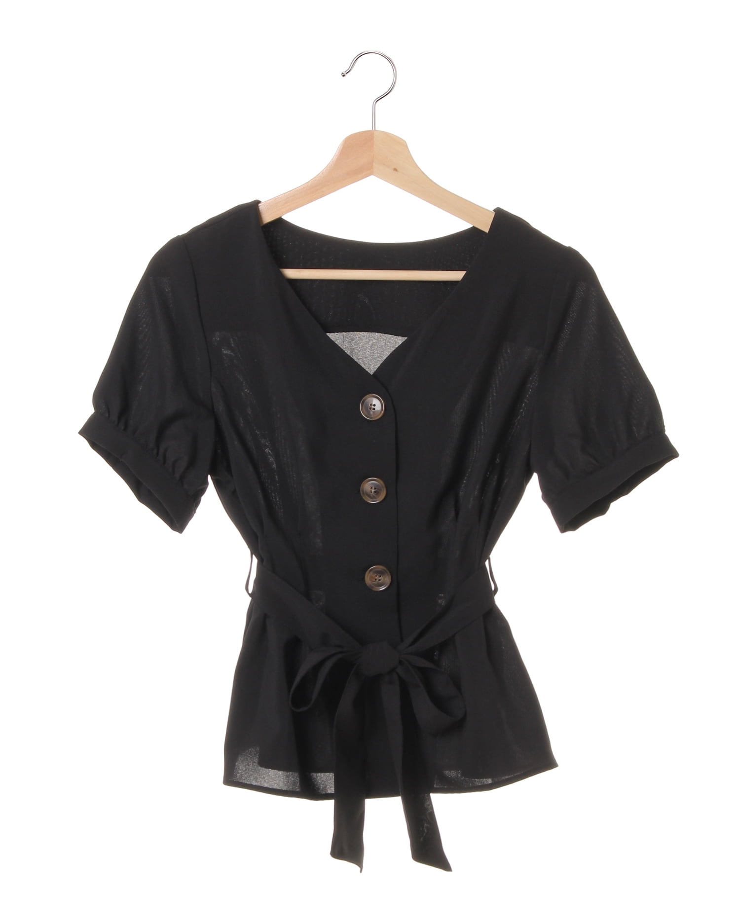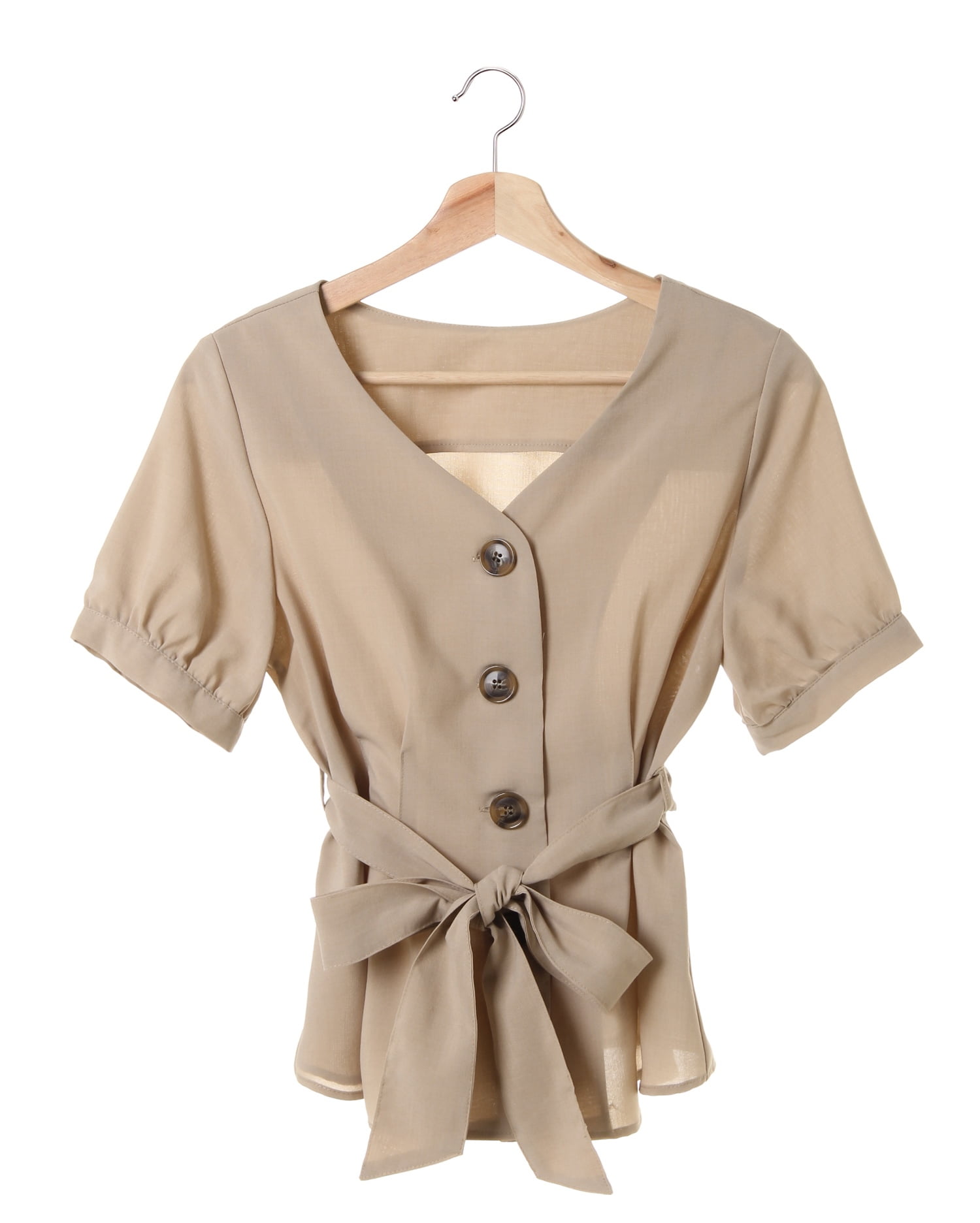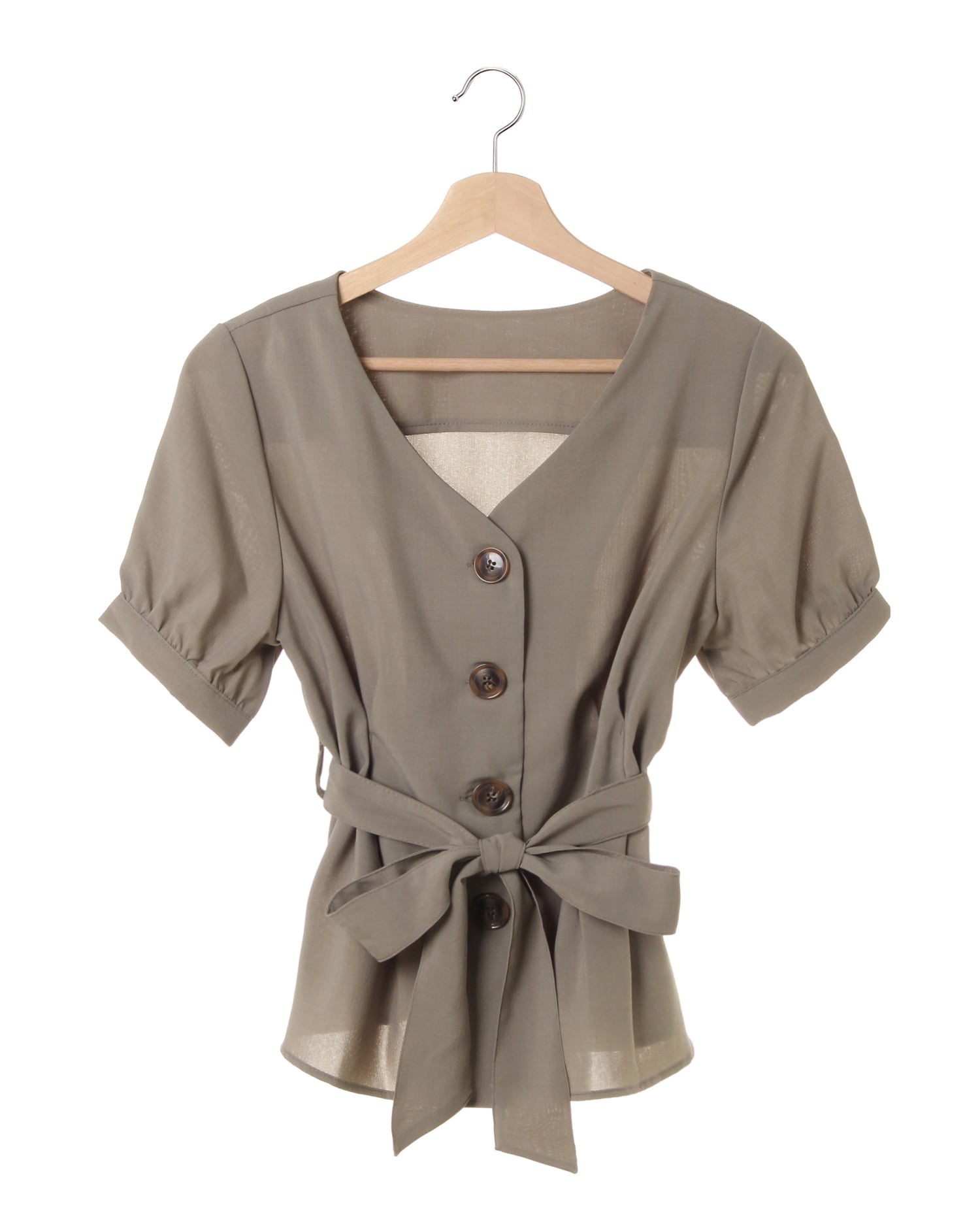 オンオフ問わずに着回せるトップスは羽織りとしても着られるデザインが魅力。さらりとしたリネン調素材でこれからの季節にオススメです。すっきり開いたVネックにボリュームスリーブを組み合わせ、メリハリのあるシルエットに。大きめのフロントボタンがアクセントになっています。ウエストマークに便利なサッシュベルト付き。タイトスカートと合わせた大人な着こなしを楽しみたい1枚です。