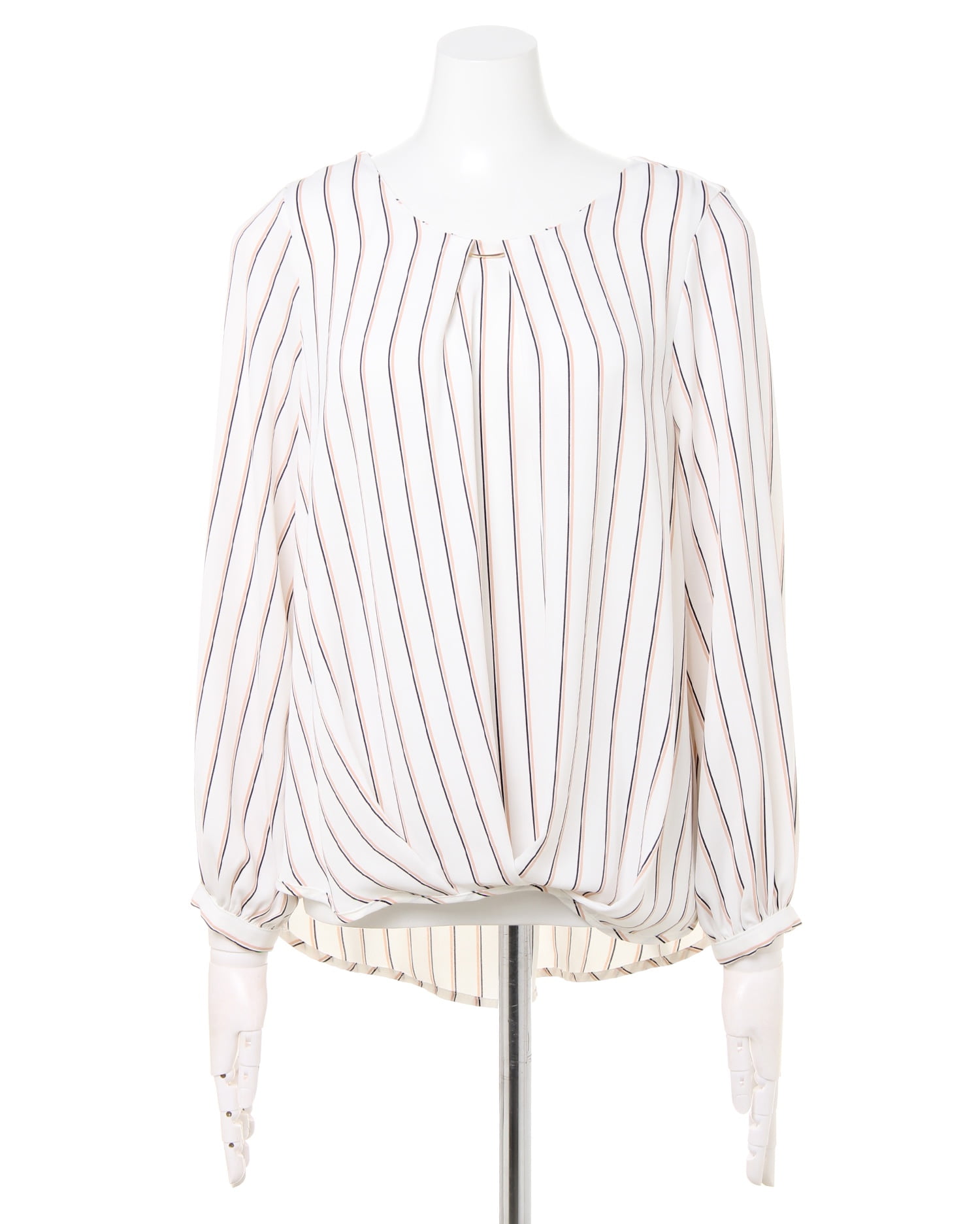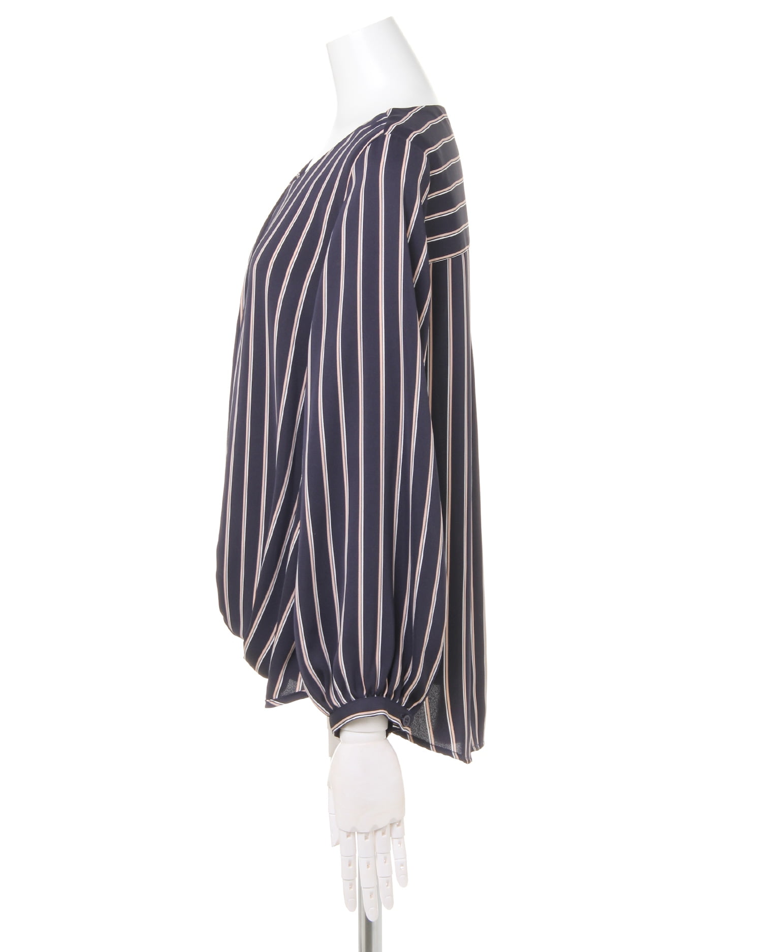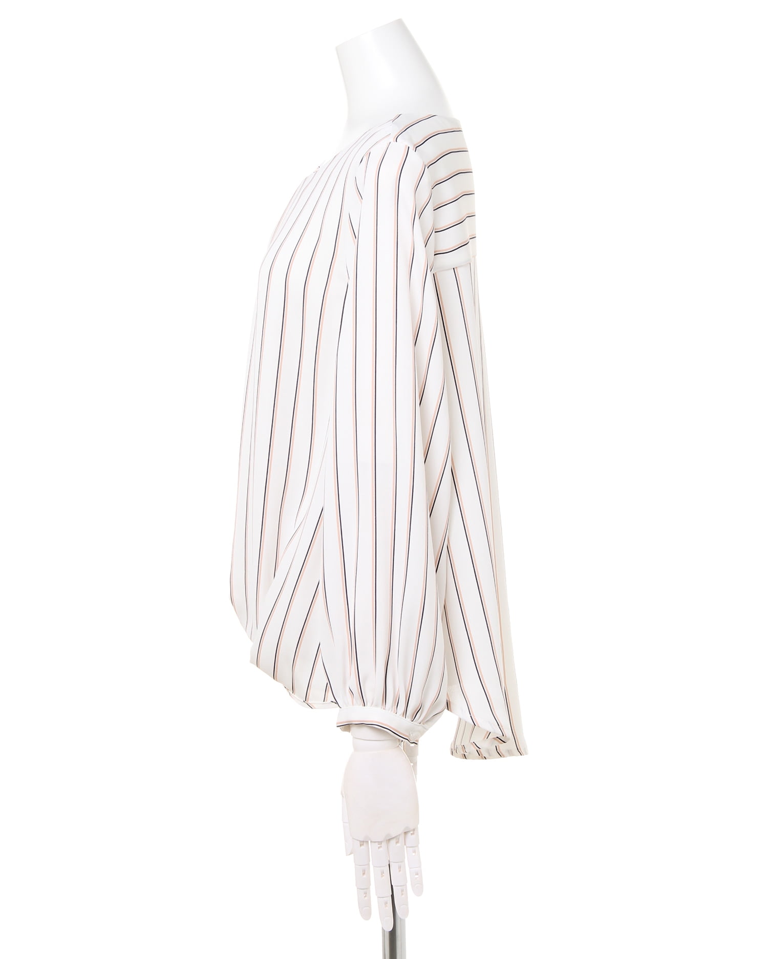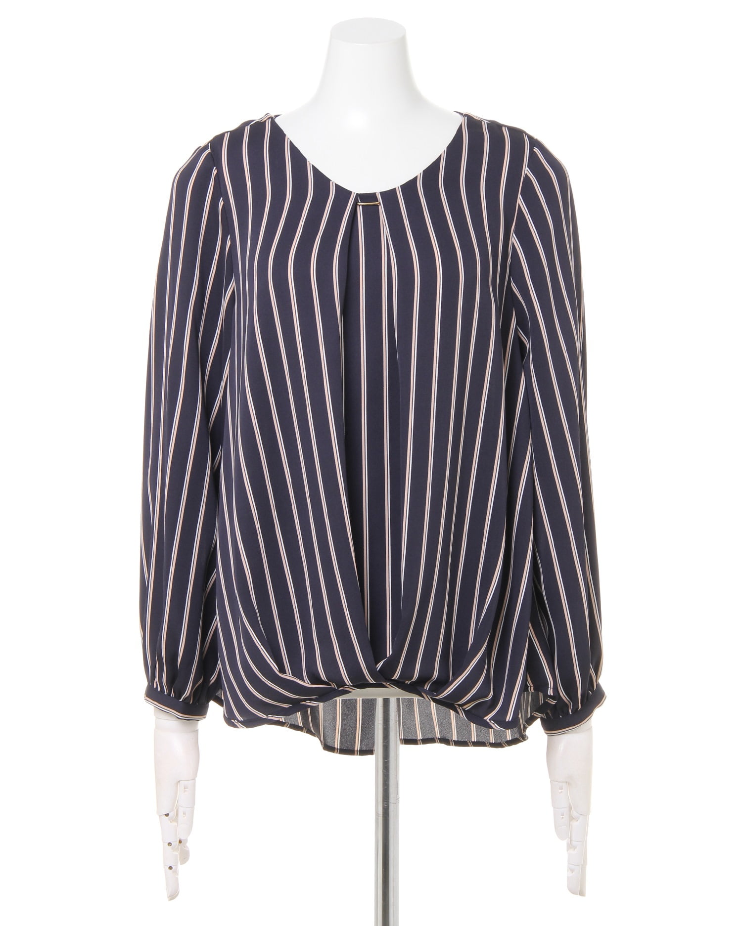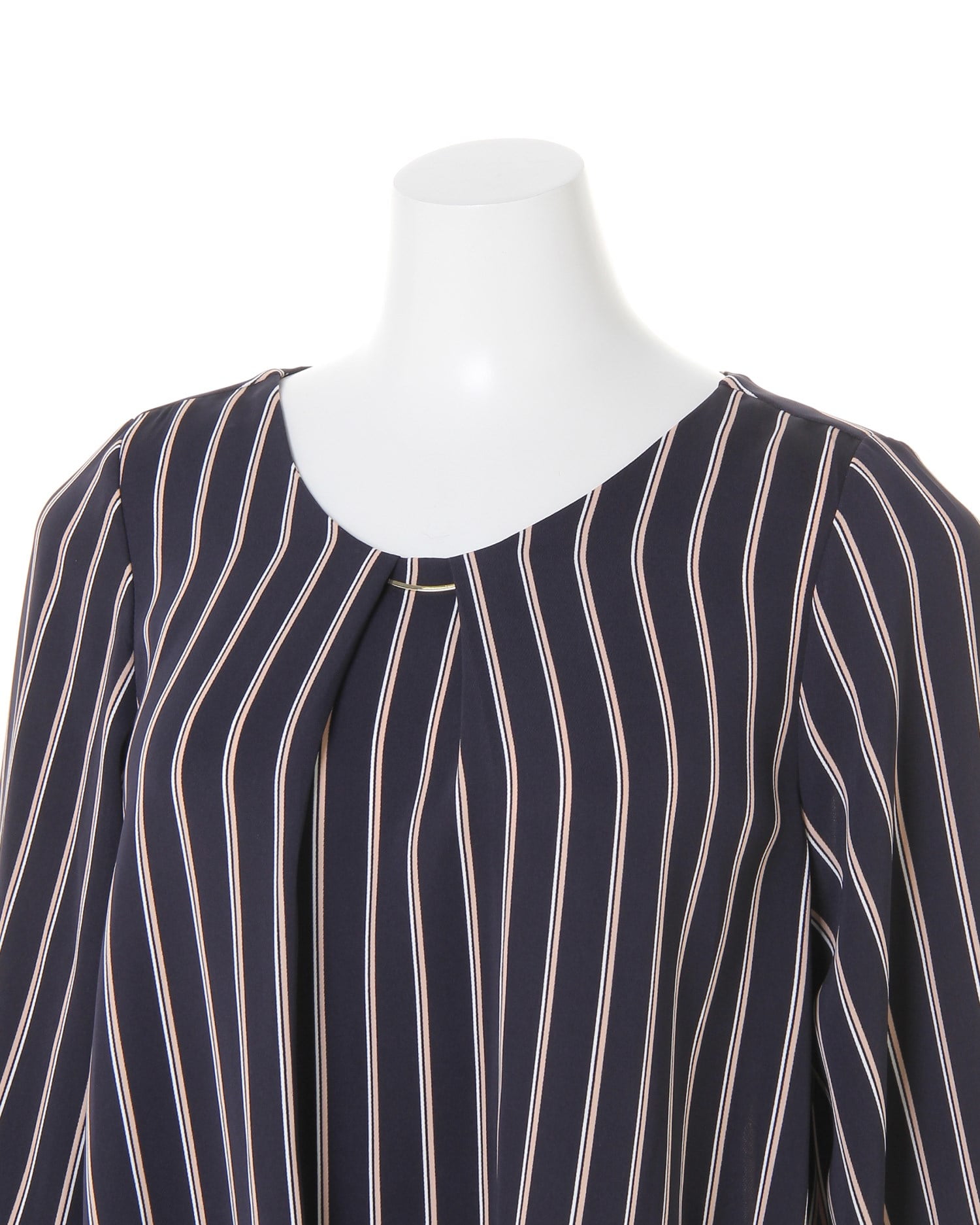 しなやかでストレッチ性のある生地で仕立てたシャツはストライプがマニッシュな雰囲気。ゆったりめのシルエットとの組み合わせで着心地は快適です。タックを入れたネック部分にはリュクスなバーをプラス。顔周りを華やかに彩ってくれます。裾部分のふんわりとしたタックデザインが、気になるお腹周りもカバー。スカートにもパンツにも合わせやすい丈感で着回し力抜群です。