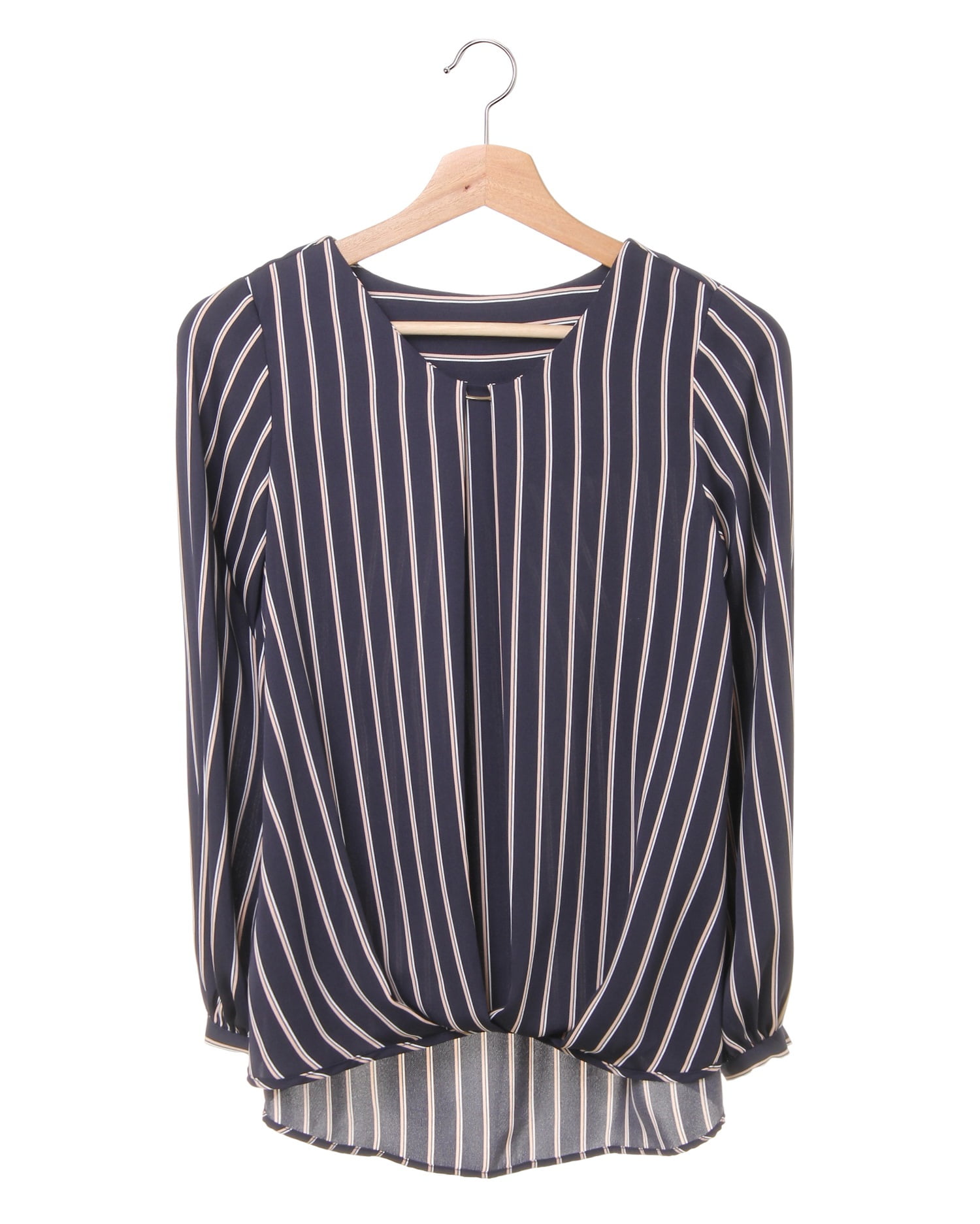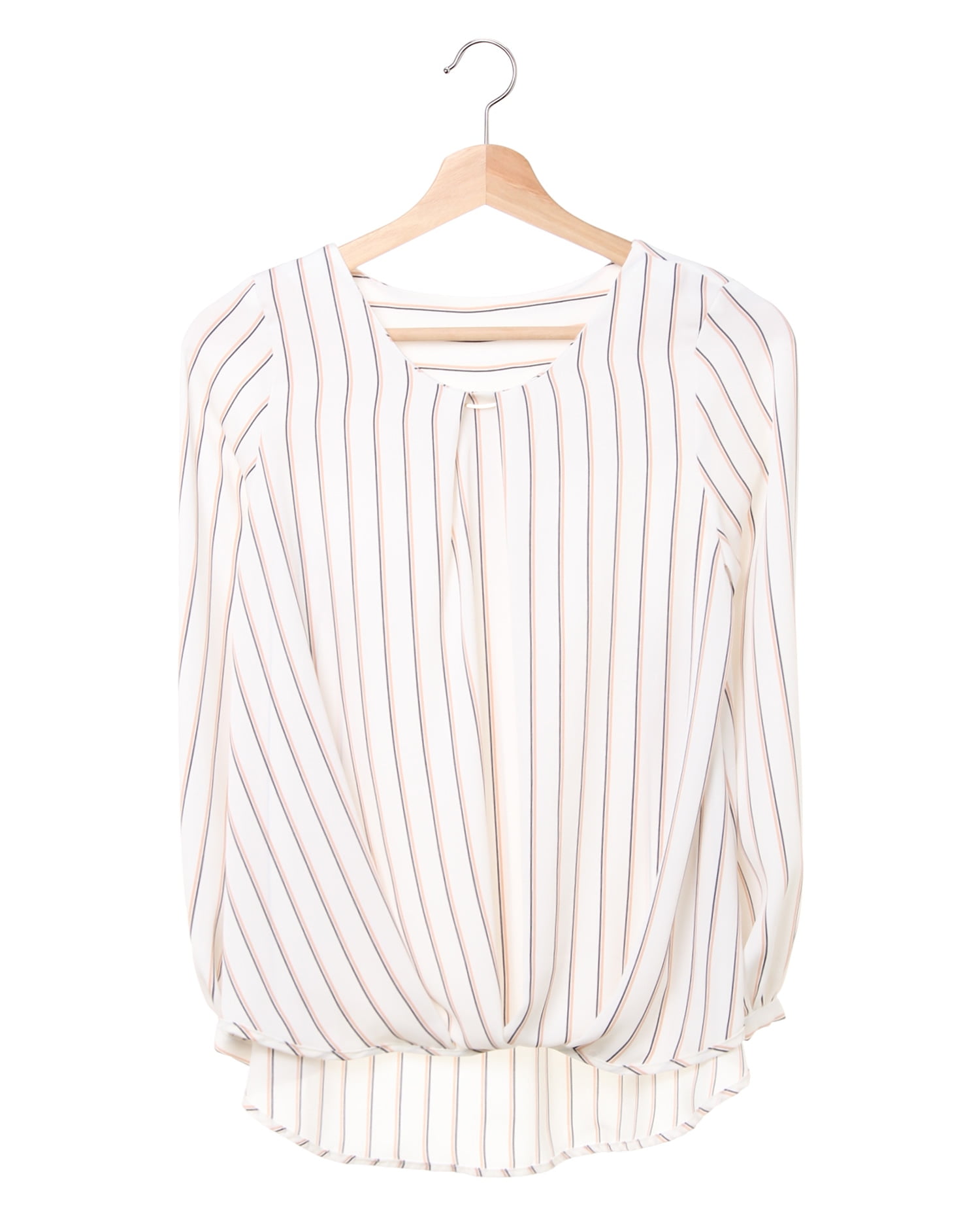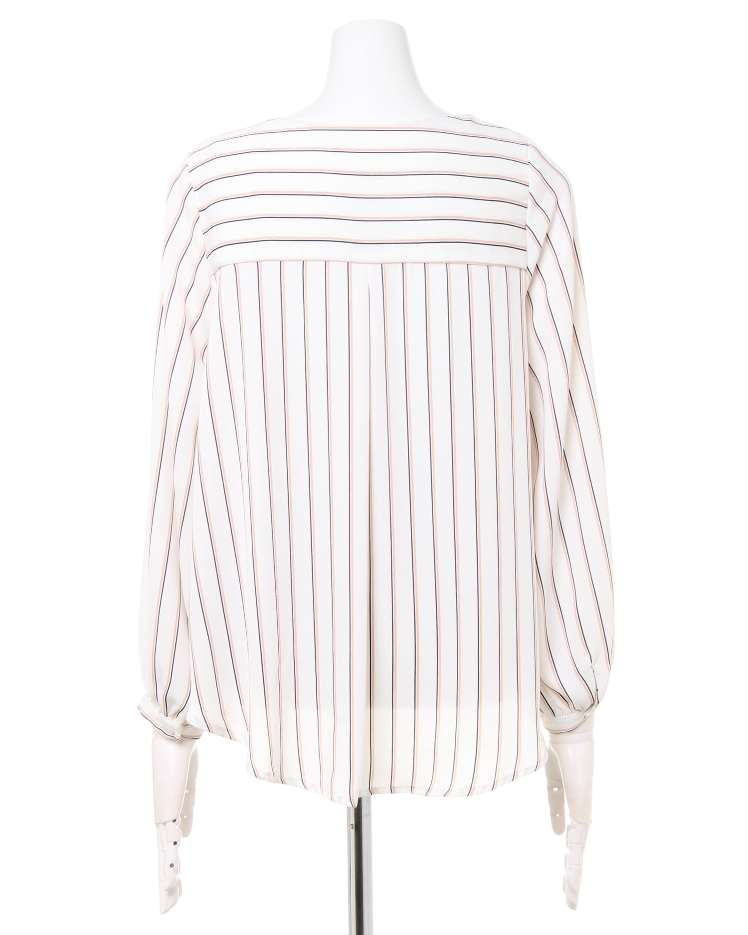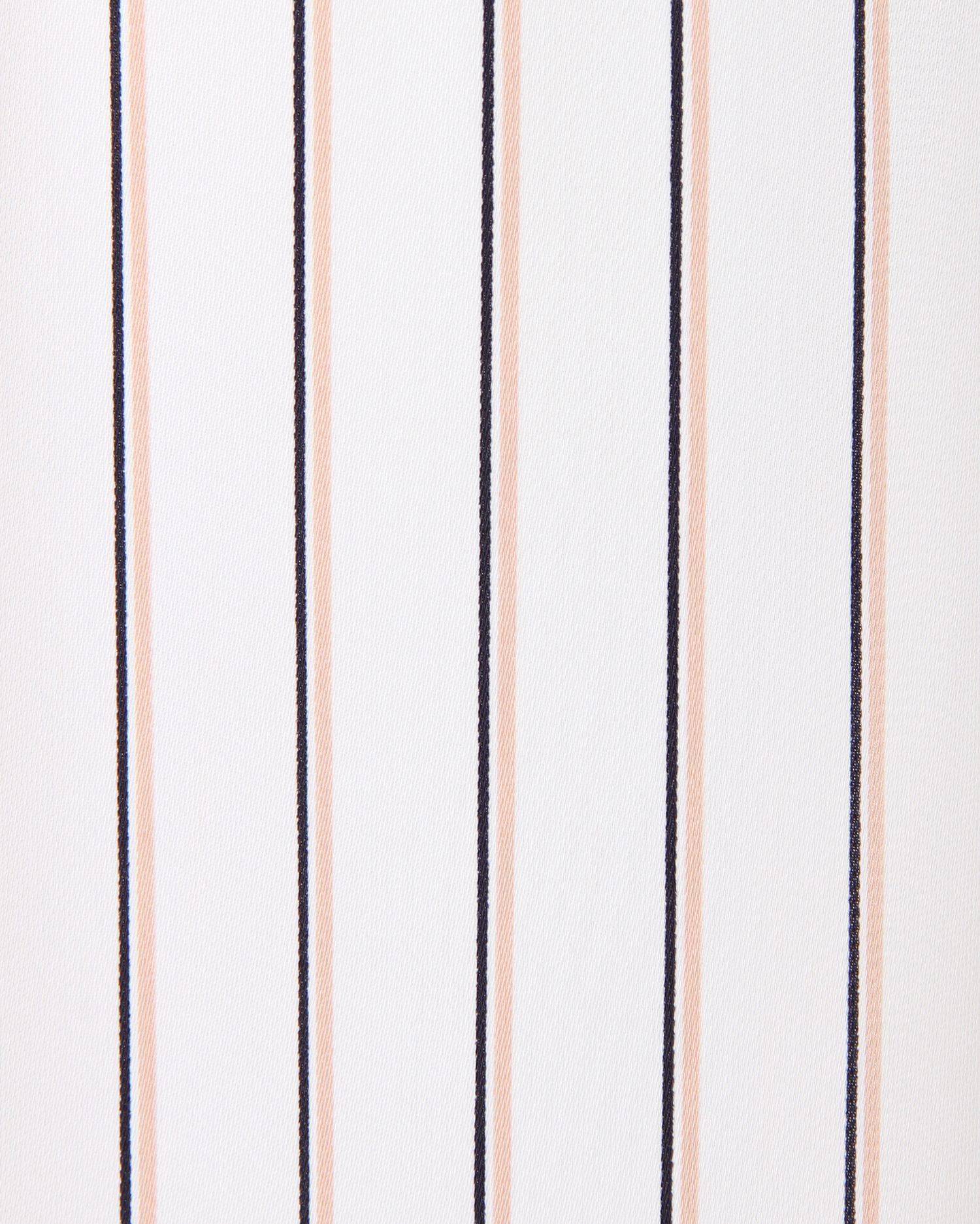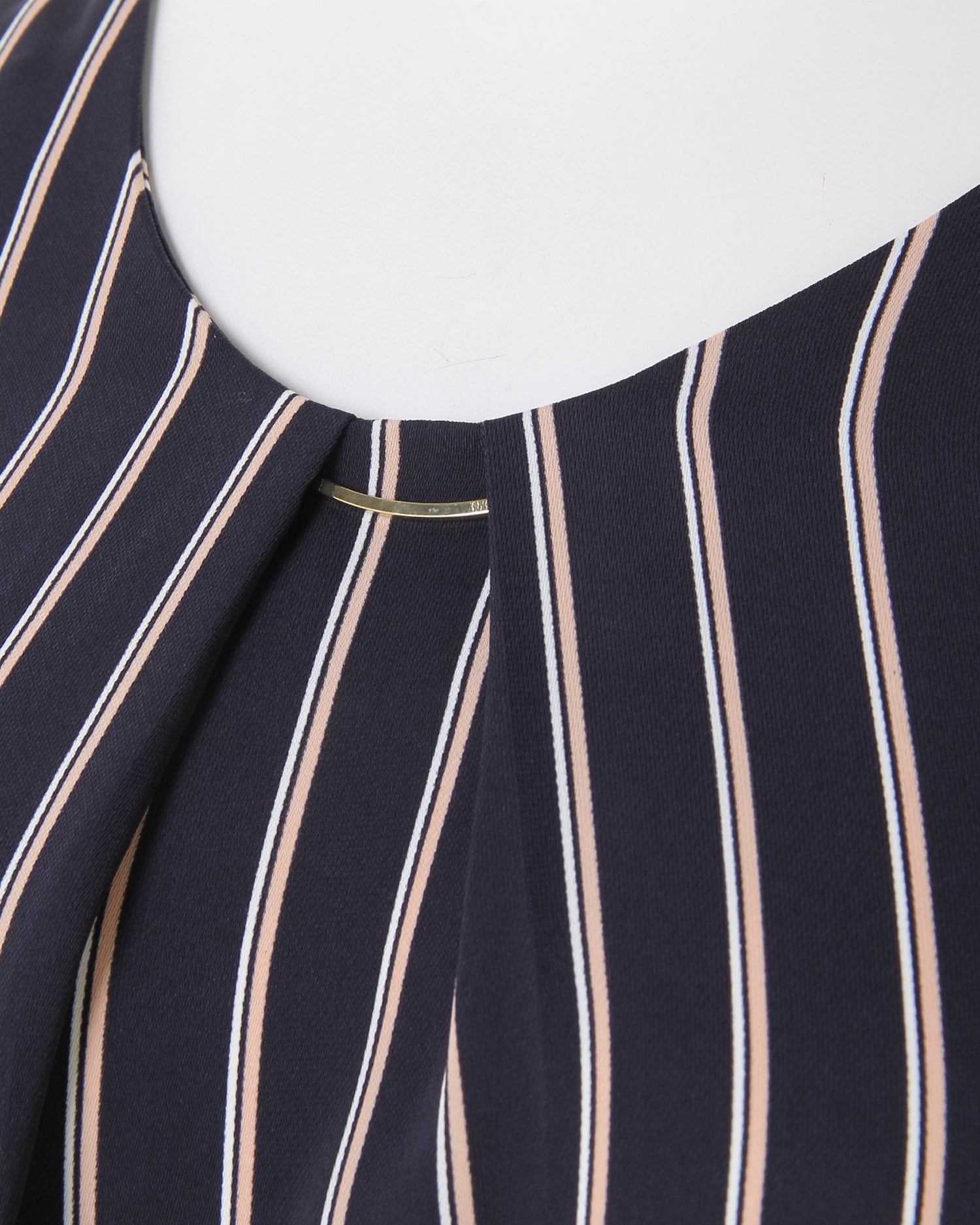 しなやかでストレッチ性のある生地で仕立てたシャツはストライプがマニッシュな雰囲気。ゆったりめのシルエットとの組み合わせで着心地は快適です。タックを入れたネック部分にはリュクスなバーをプラス。顔周りを華やかに彩ってくれます。裾部分のふんわりとしたタックデザインが、気になるお腹周りもカバー。スカートにもパンツにも合わせやすい丈感で着回し力抜群です。