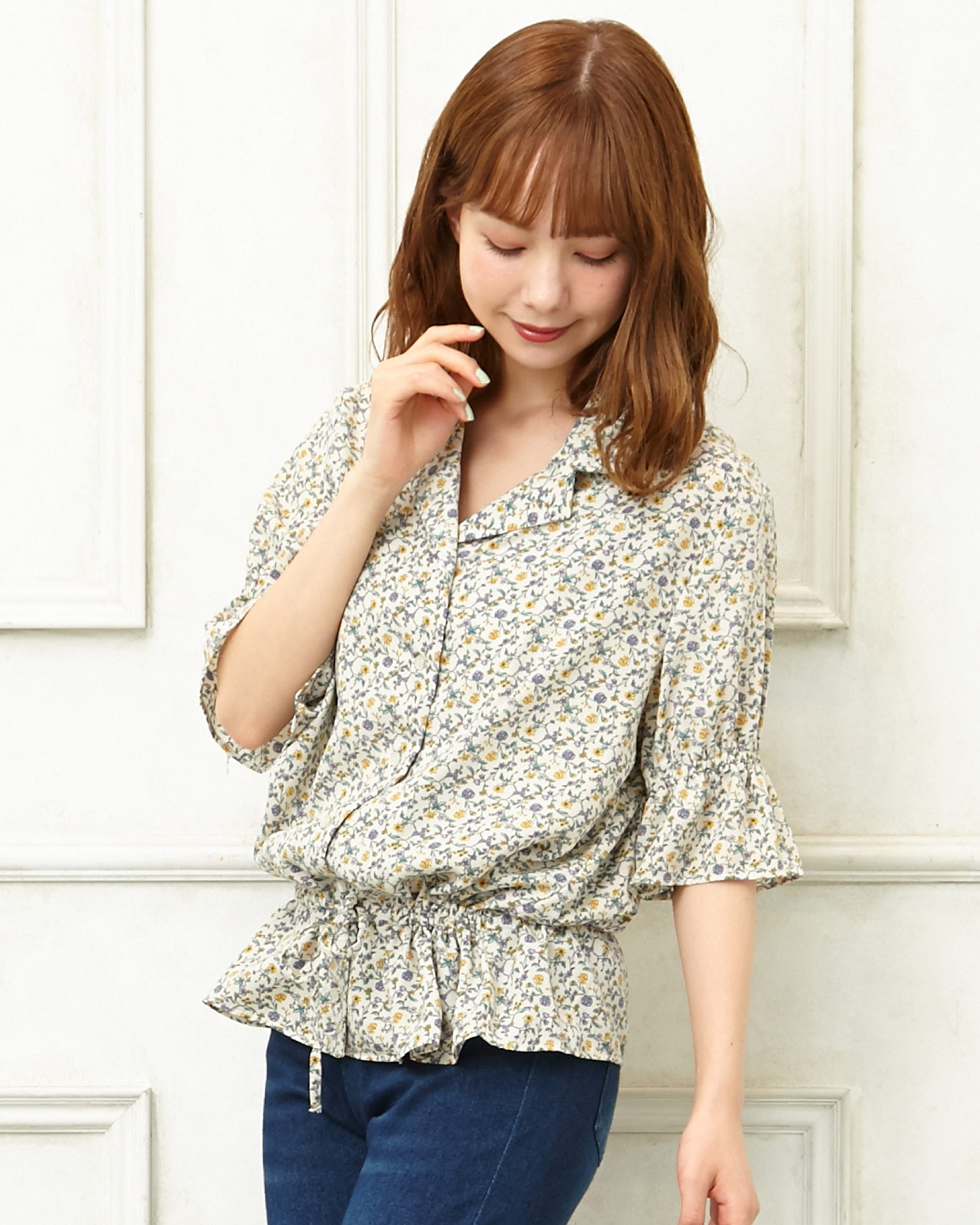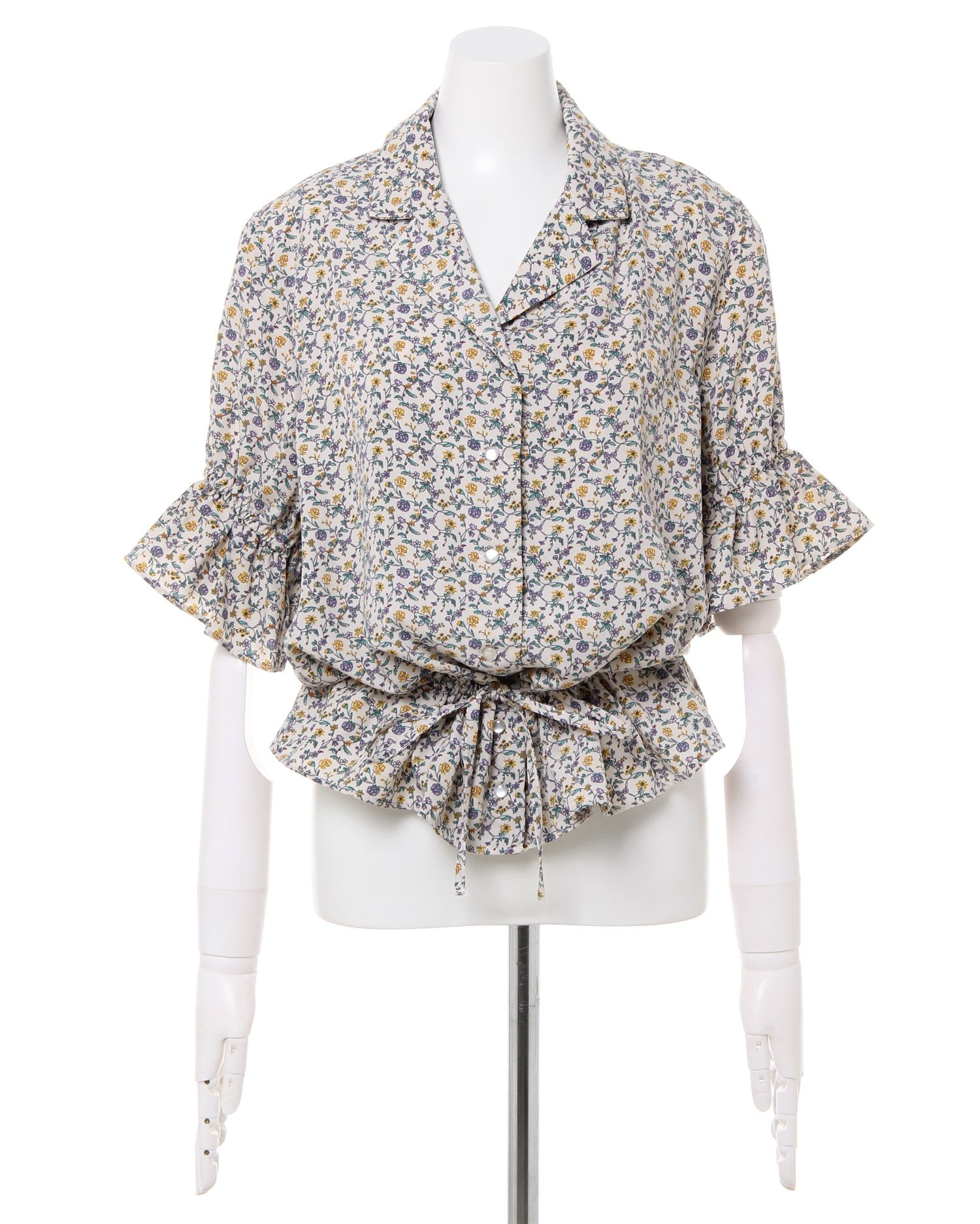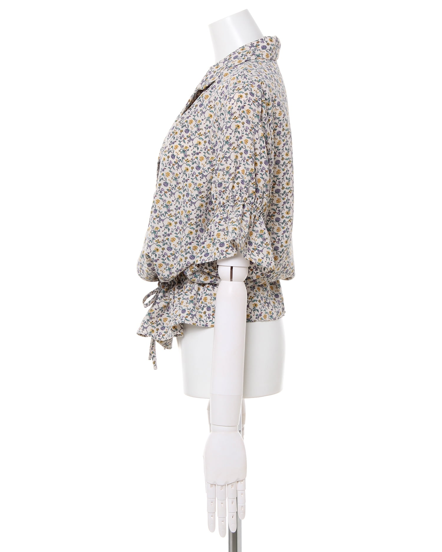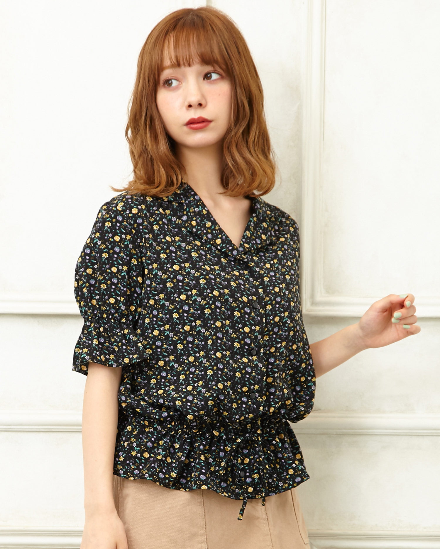 フェミニンなフラワープリントが着こなしのアクセントになるブラウス。小さめのフラワーと落ち着いたカラー使いで大人っぽく着こなせます。デコルテラインをきれいに彩る開襟デザインも◎。ウエスト部分にはドローストリングをあしらい、絞ることでメリハリのあるスタイルが完成します。フロントのボタンは全て開くので、羽織りとしても着回せる優秀アイテムです。