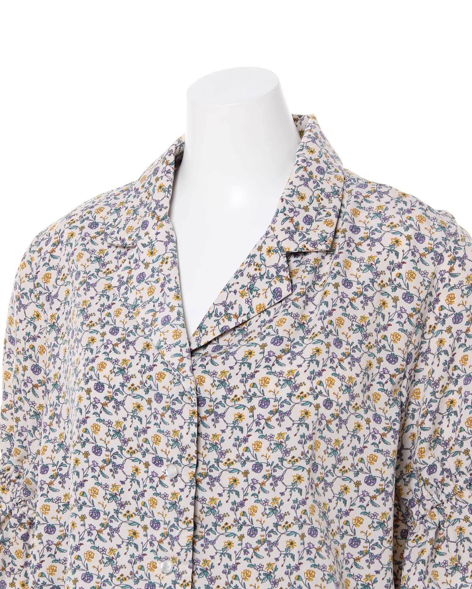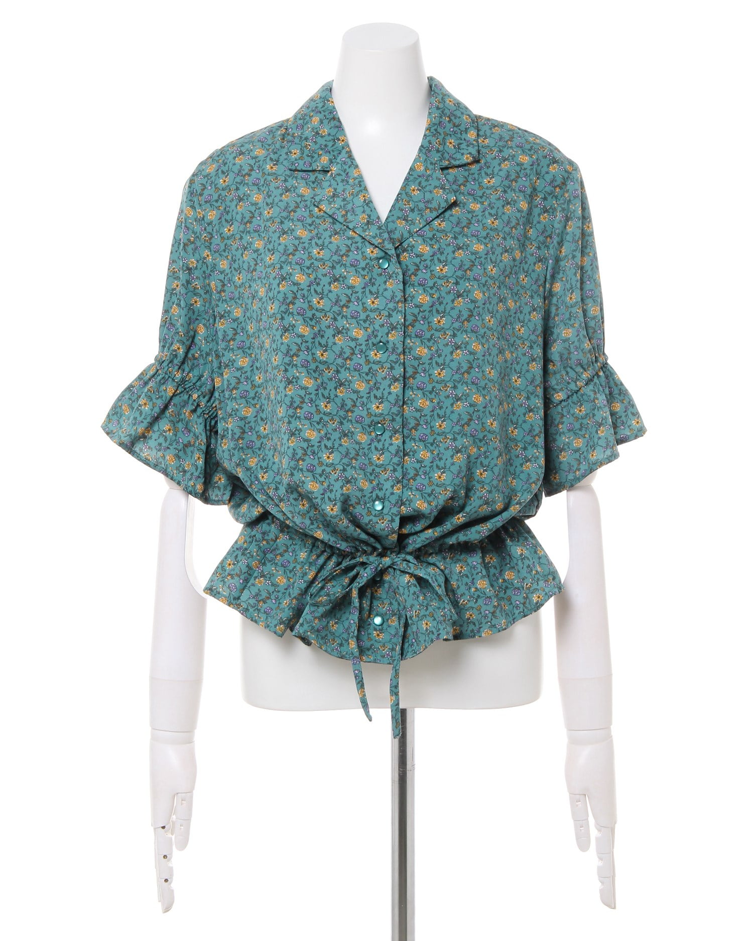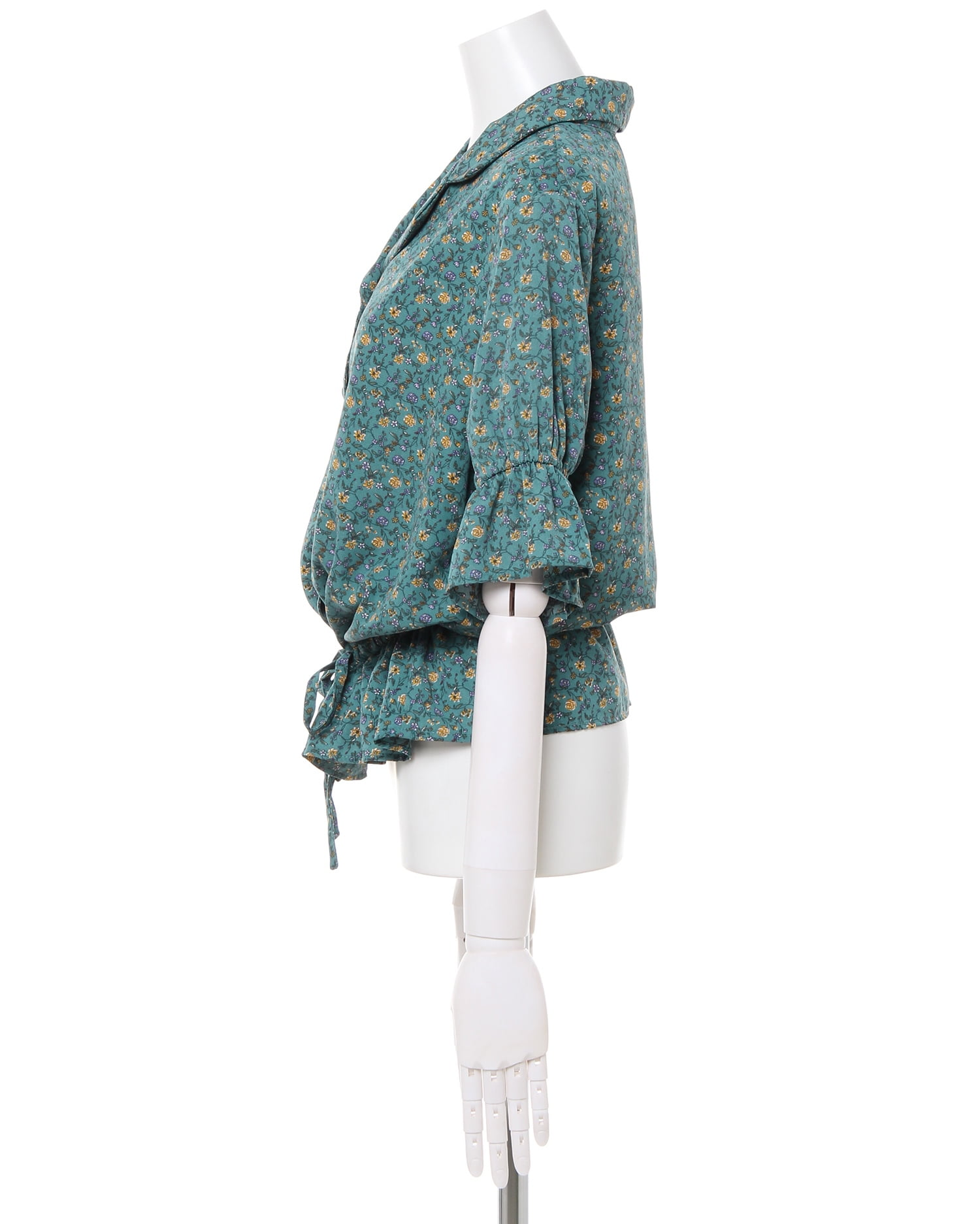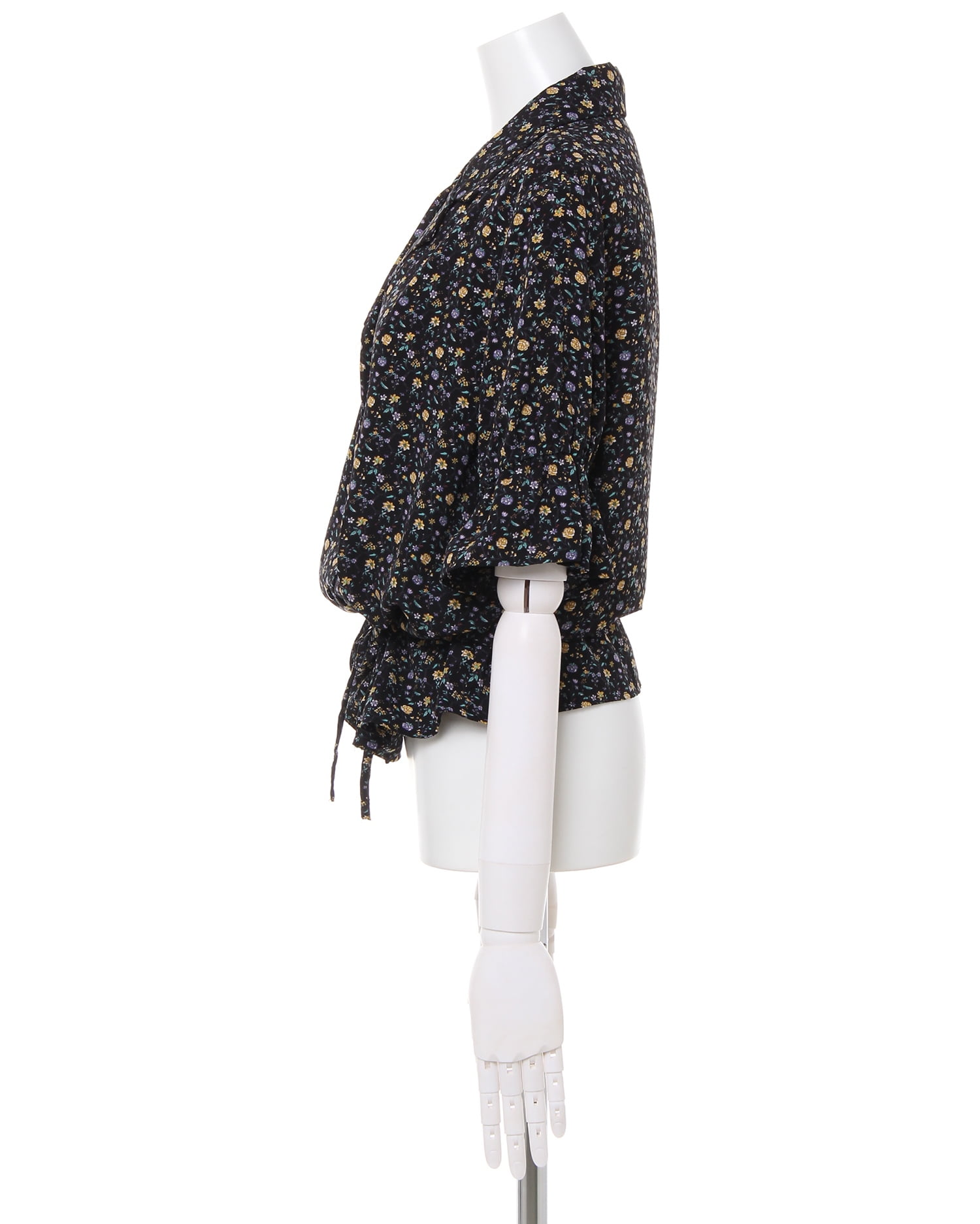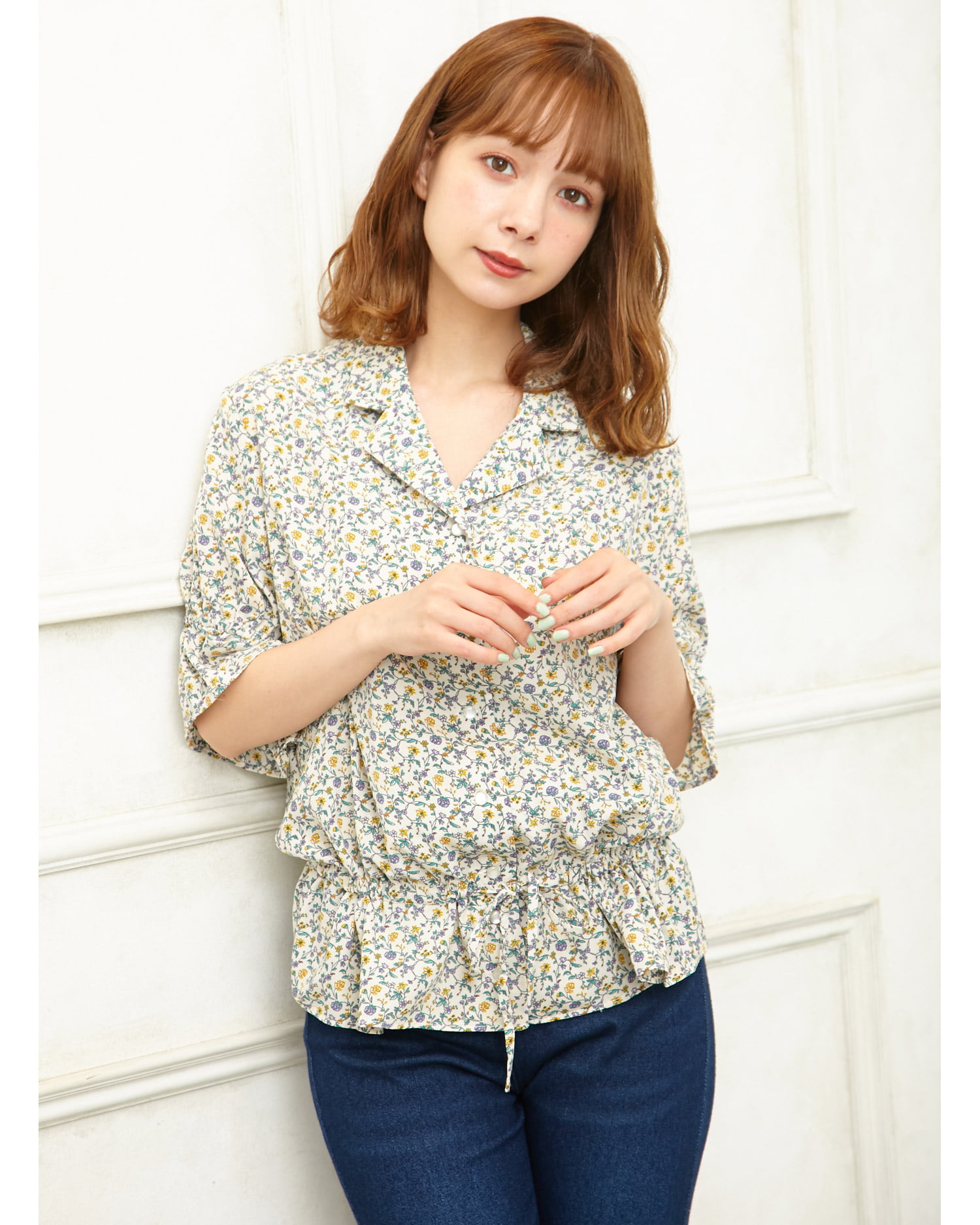 フェミニンなフラワープリントが着こなしのアクセントになるブラウス。小さめのフラワーと落ち着いたカラー使いで大人っぽく着こなせます。デコルテラインをきれいに彩る開襟デザインも◎。ウエスト部分にはドローストリングをあしらい、絞ることでメリハリのあるスタイルが完成します。フロントのボタンは全て開くので、羽織りとしても着回せる優秀アイテムです。