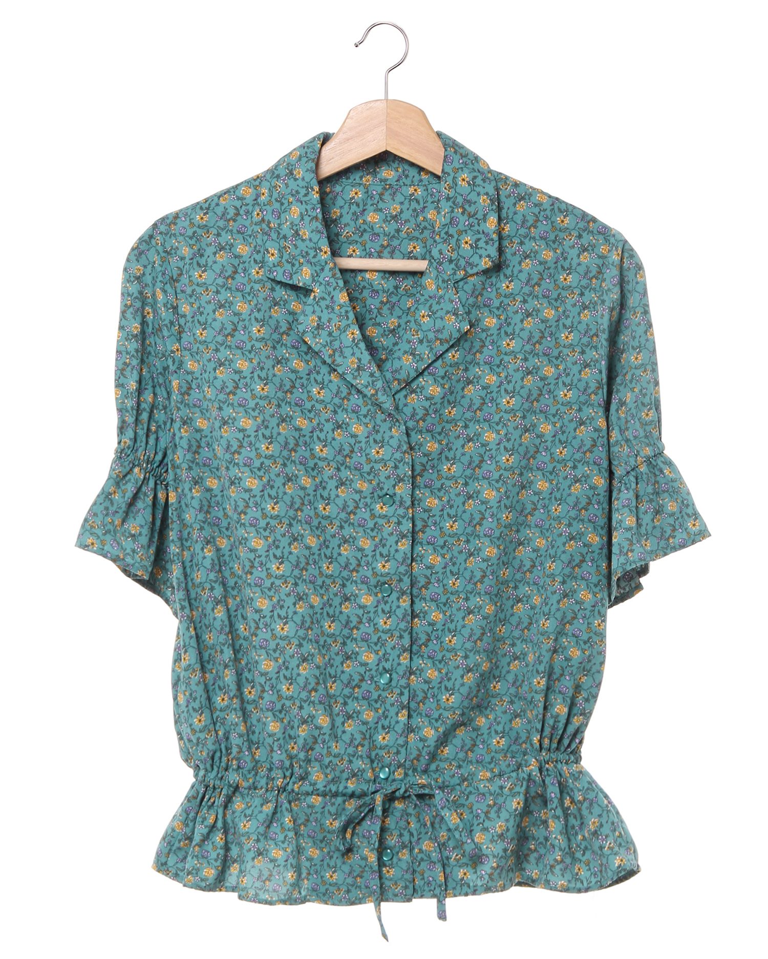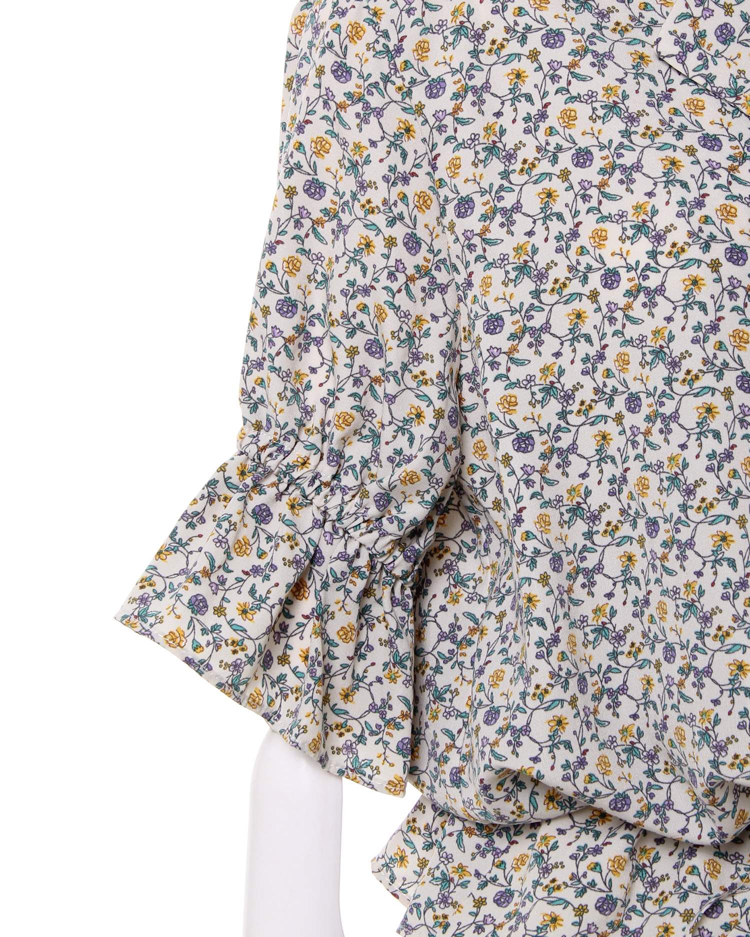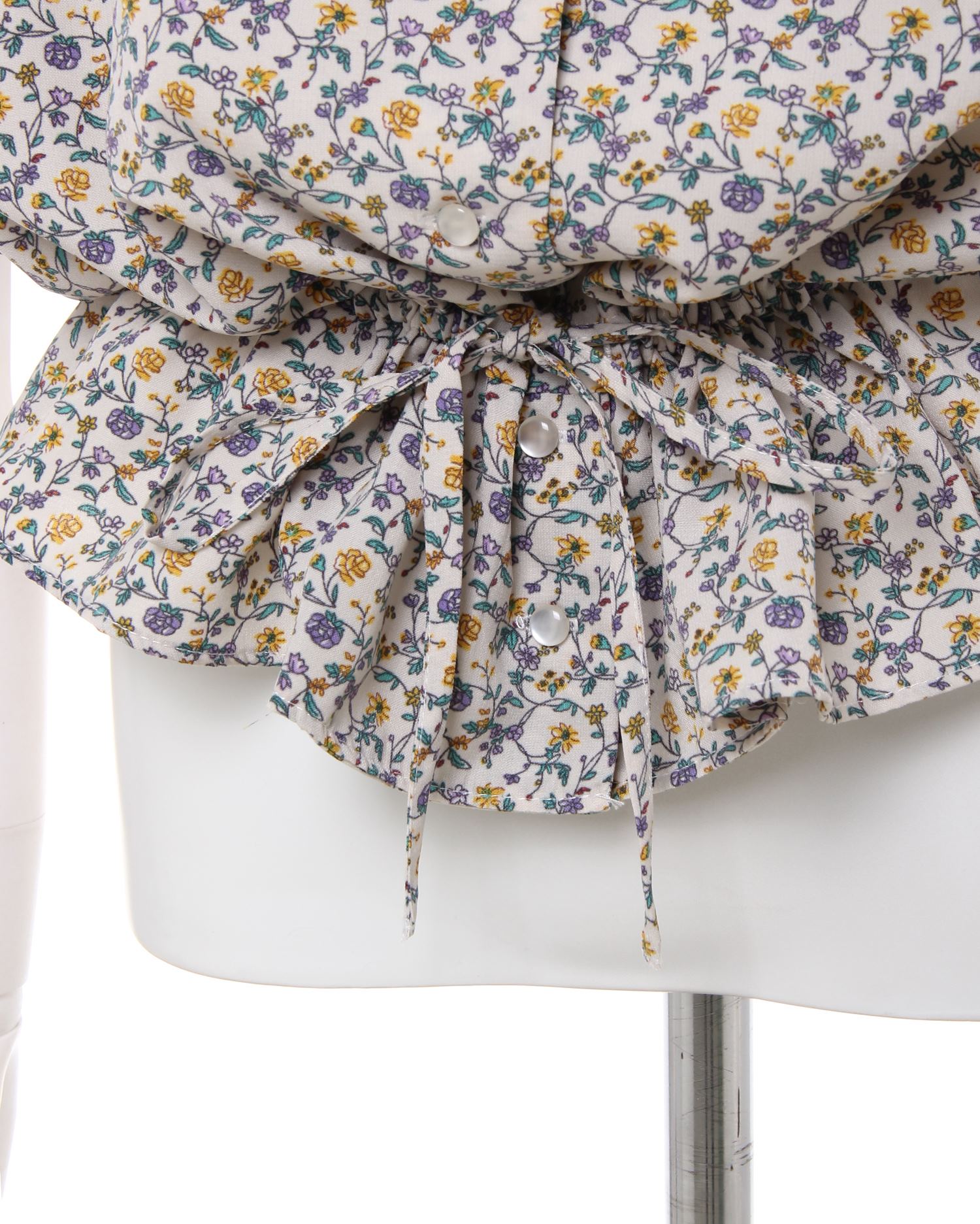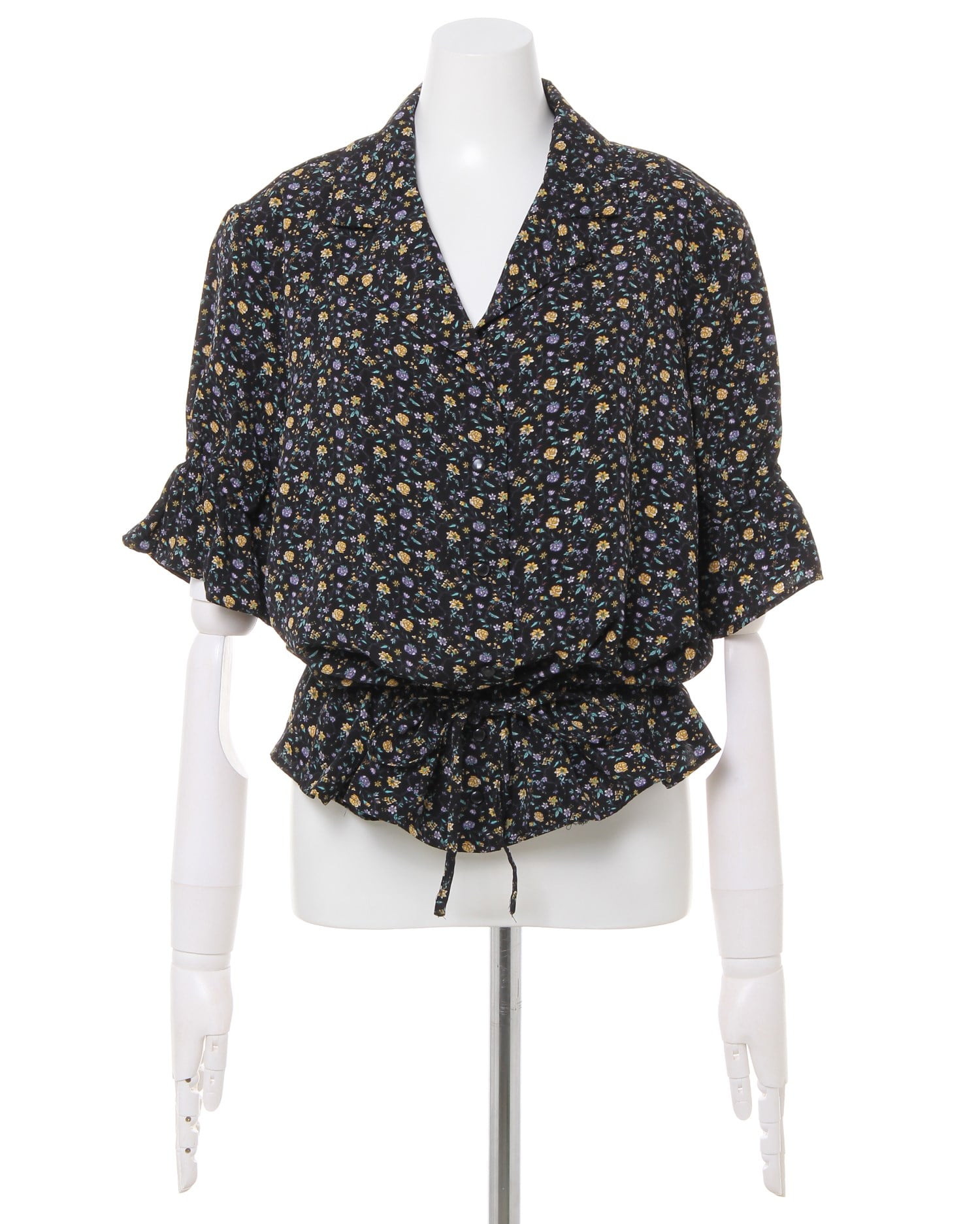 フェミニンなフラワープリントが着こなしのアクセントになるブラウス。小さめのフラワーと落ち着いたカラー使いで大人っぽく着こなせます。デコルテラインをきれいに彩る開襟デザインも◎。ウエスト部分にはドローストリングをあしらい、絞ることでメリハリのあるスタイルが完成します。フロントのボタンは全て開くので、羽織りとしても着回せる優秀アイテムです。