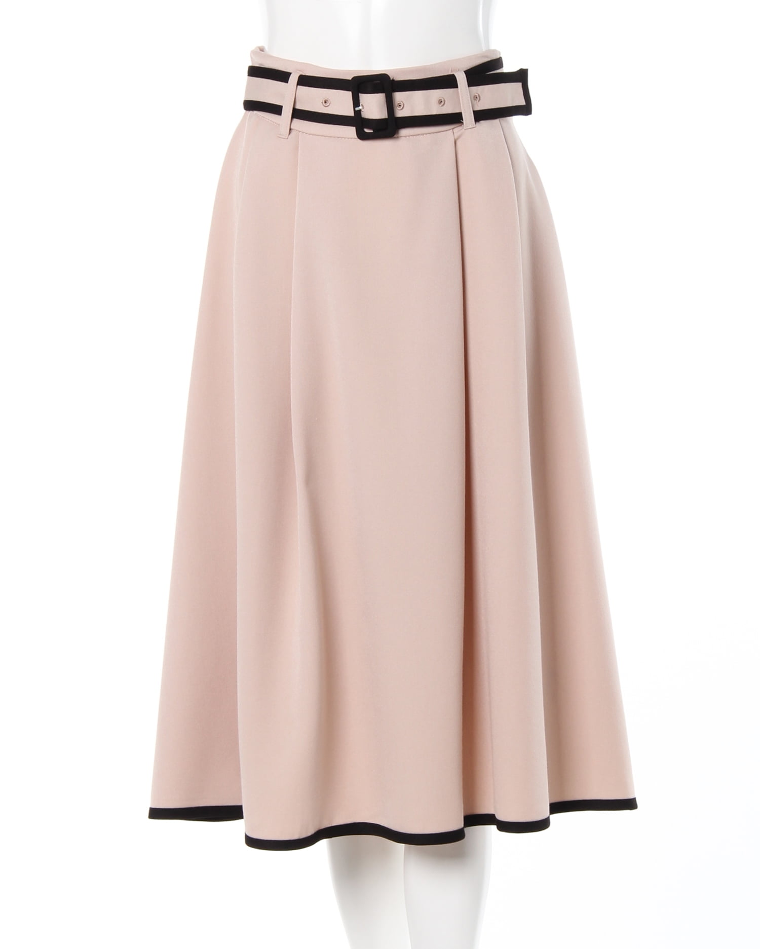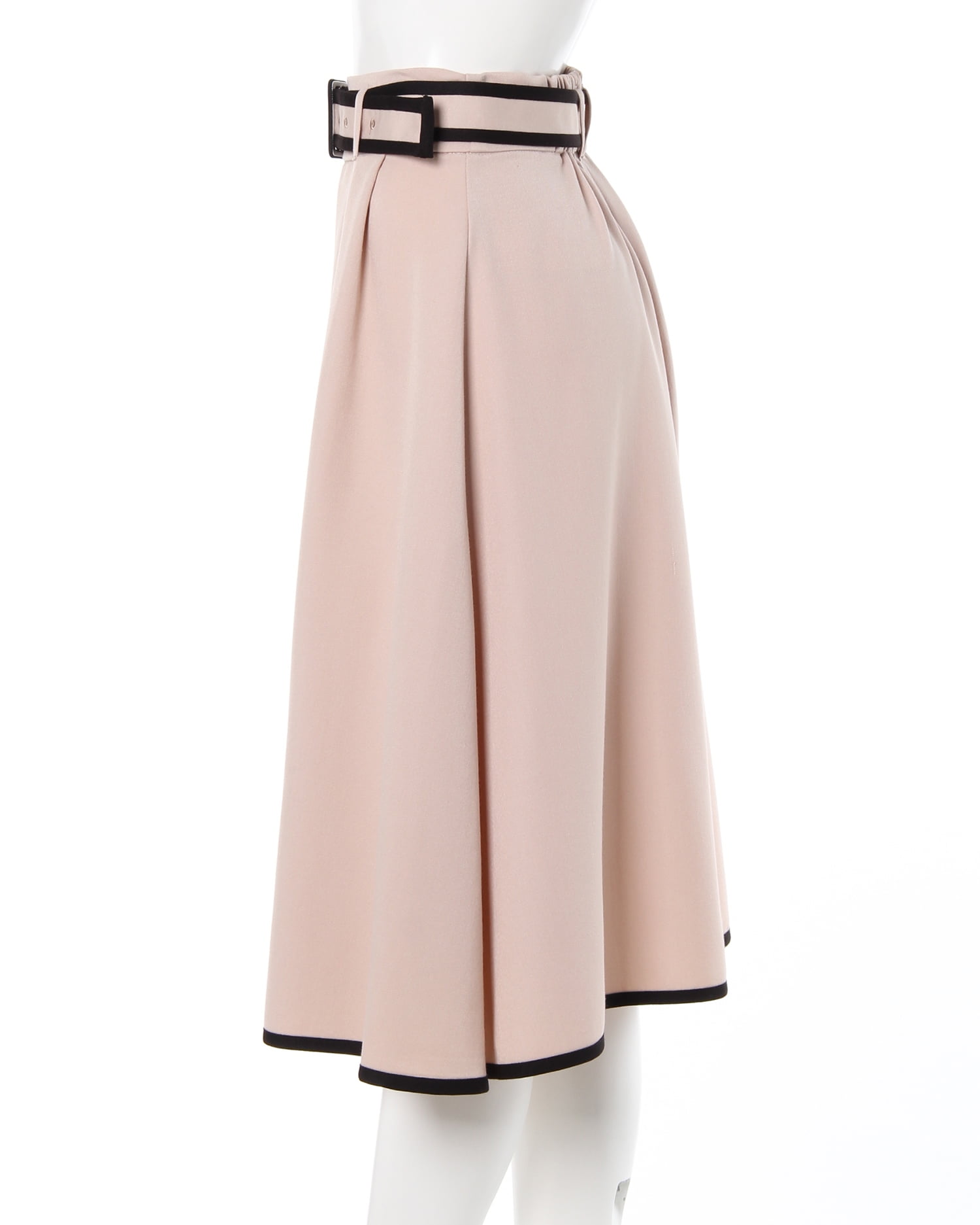 裾へ向かってふわりと広がるフレアシルエットでフェミニンな着こなしを叶えるスカートです。ミディ丈で大人っぽく着こなせるオススメの1枚。しなやかな素材は伸縮性も抜群。バックウエストはゴムになっているので、脱ぎ穿きも楽チンです。裾部分とベルトにはパイピングを施し、引き締まった印象をプラスしています。ベーシックなカラーからアクセントになるカラーまで揃っているので、自分らしい1枚を見つけて。