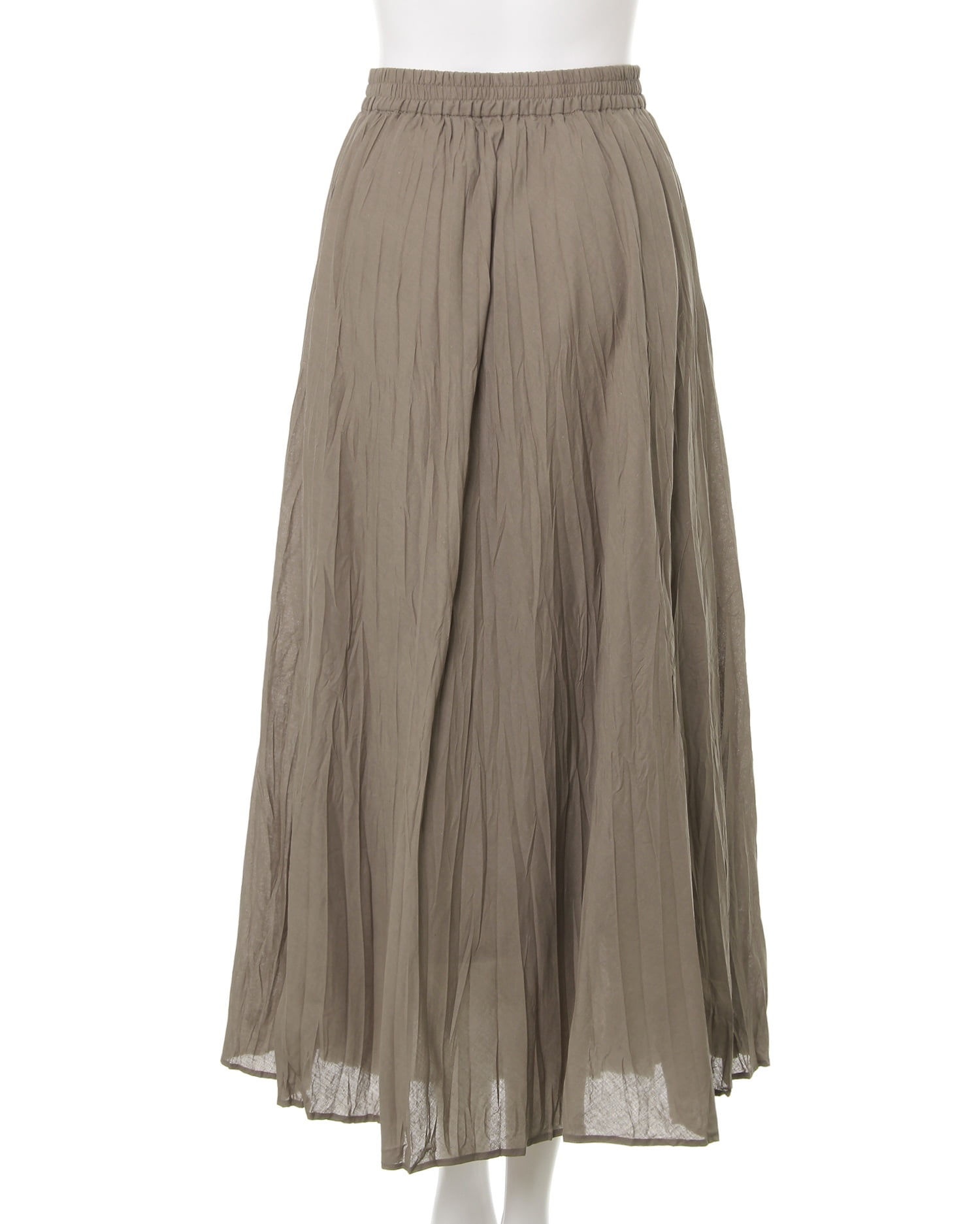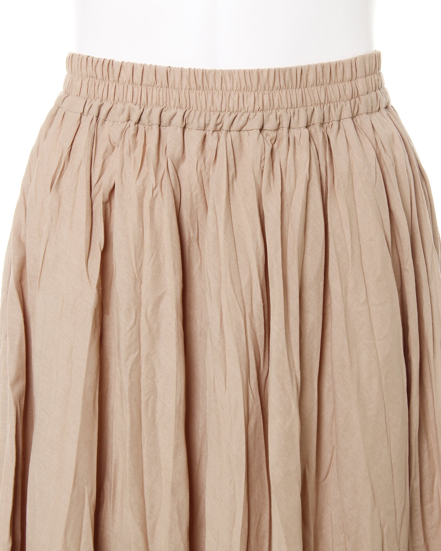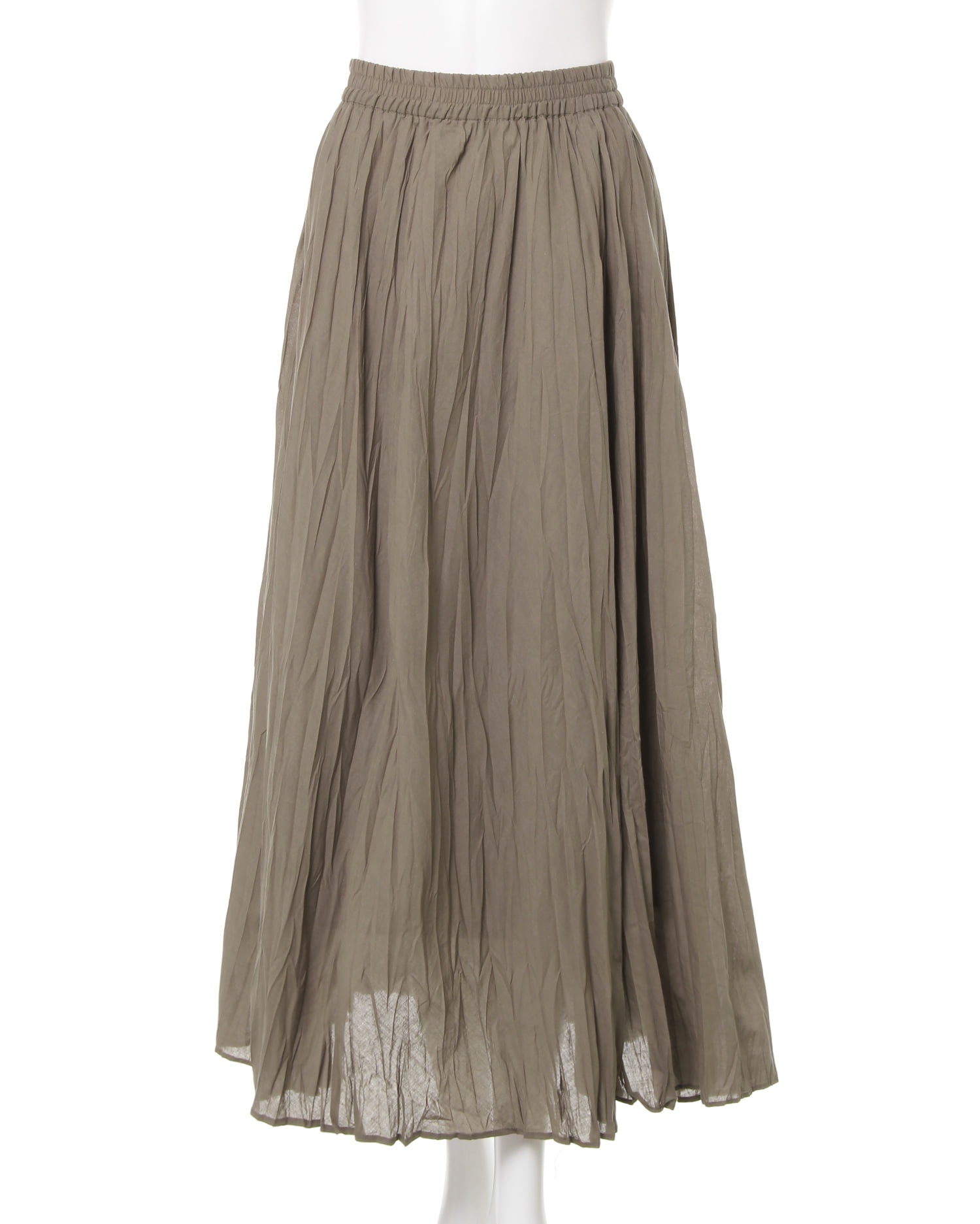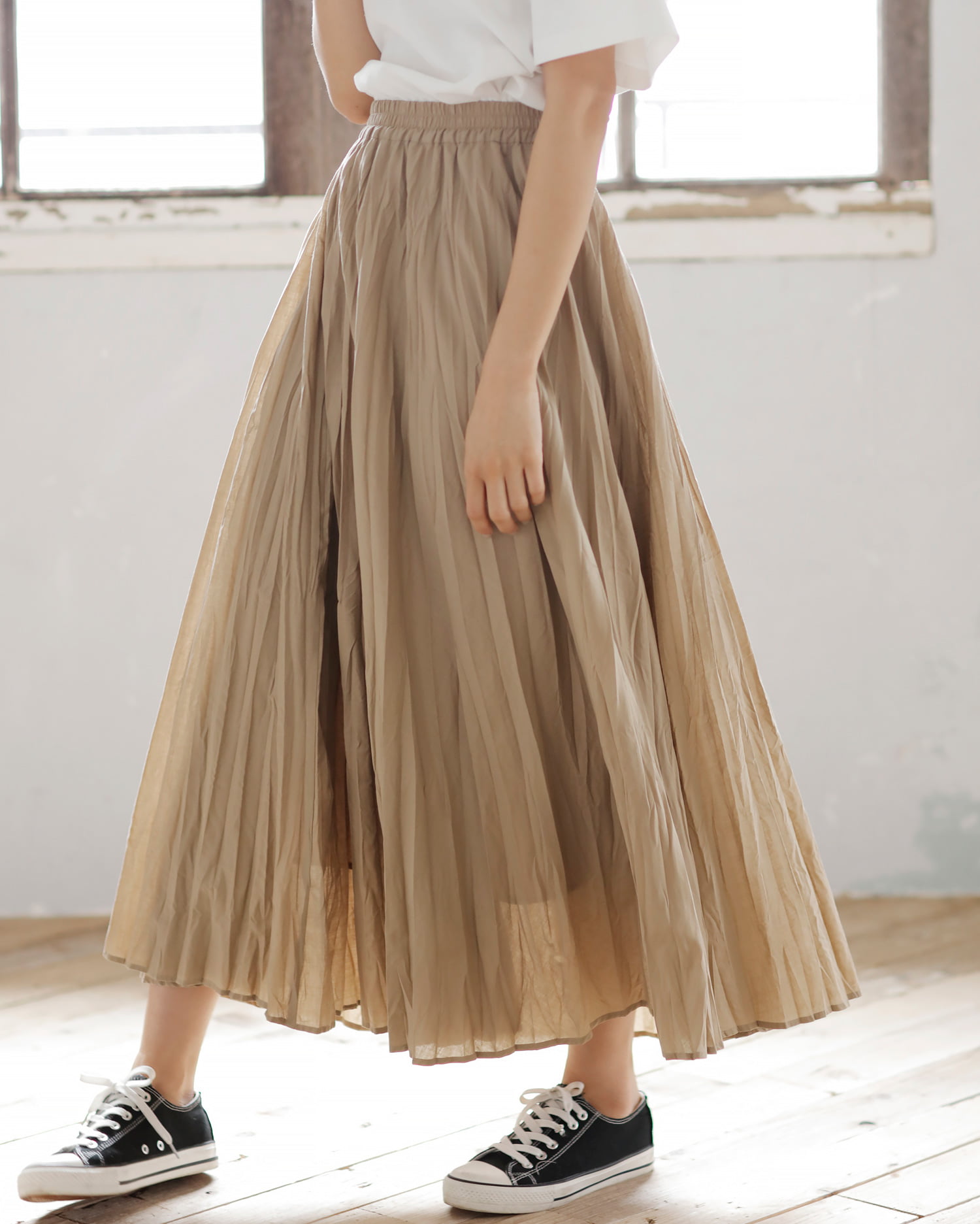 洗いざらしたような雰囲気のワッシャー加工を施したロング丈のスカート。たっぷり入れたドレープが歩くたびにふわりと揺れ、フェミニンな着こなしを叶えます。ウエスト部分はゴムになっているので穿き心地も快適。薄手の清涼感ある生地には裏地付きで、1枚でも安心して着られます。人気のショート丈のトップスを合わせてバランス良く着こなすのも◎。