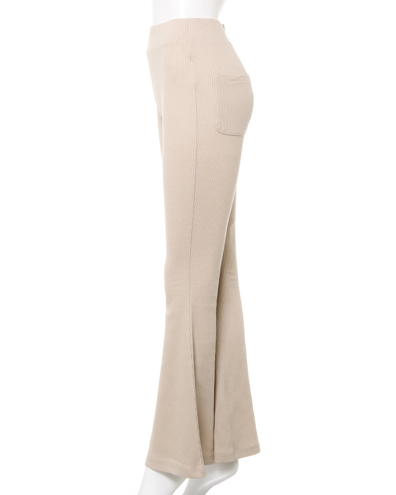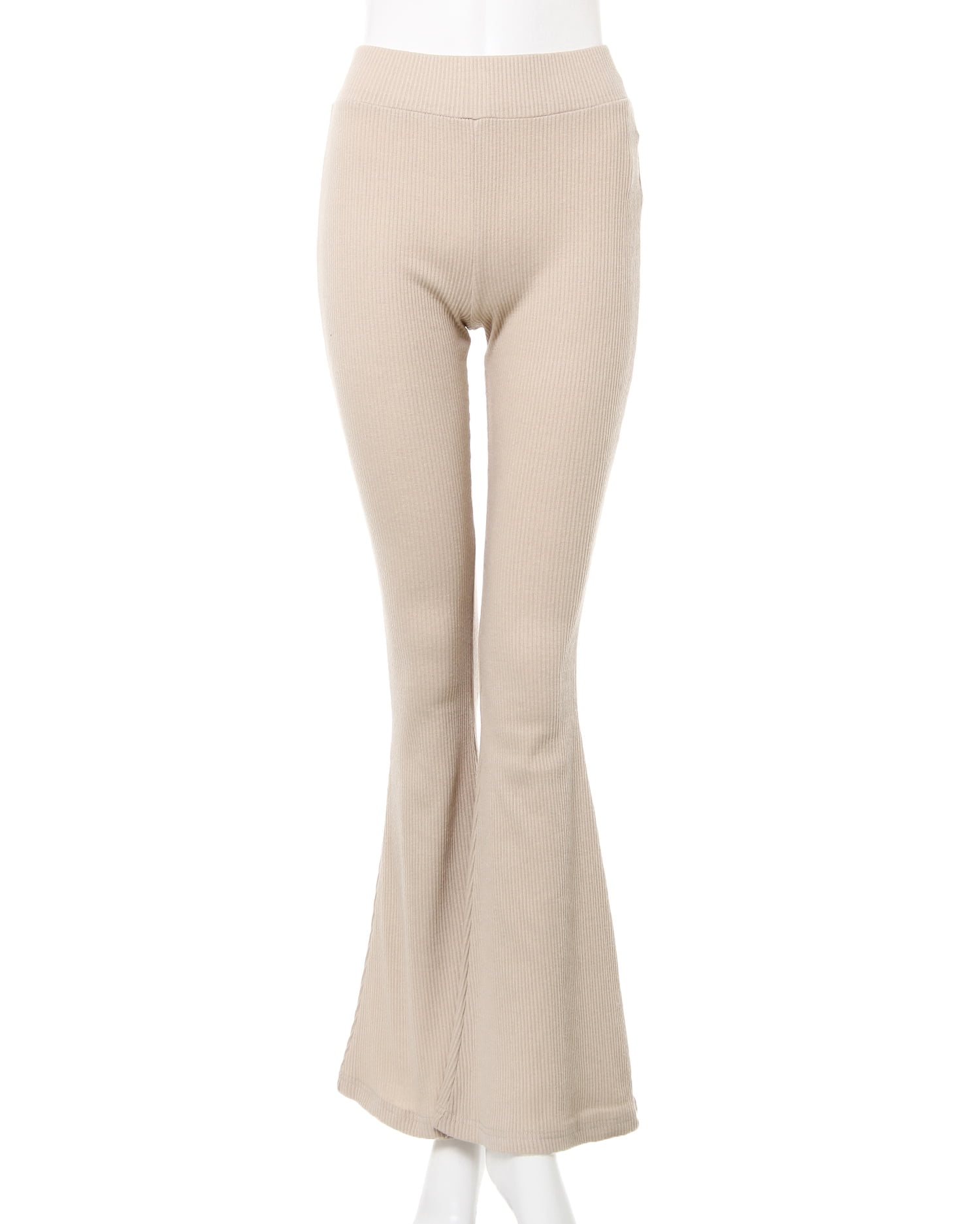 美シルエットでスタイルアップを叶えるフレアシルエットのパンツです。伸縮性抜群の生地はリブ入りなので、すっきりとした印象で穿けるのも◎。ウエスト部分は太めのゴムでフィット感があります。程よい厚みの生地は、スイッチ期からシーズン長く着回せるのもポイント。バックには便利なポケット付きです。ボリュームトップスと合わせてバランス良く着こなしたい1本。