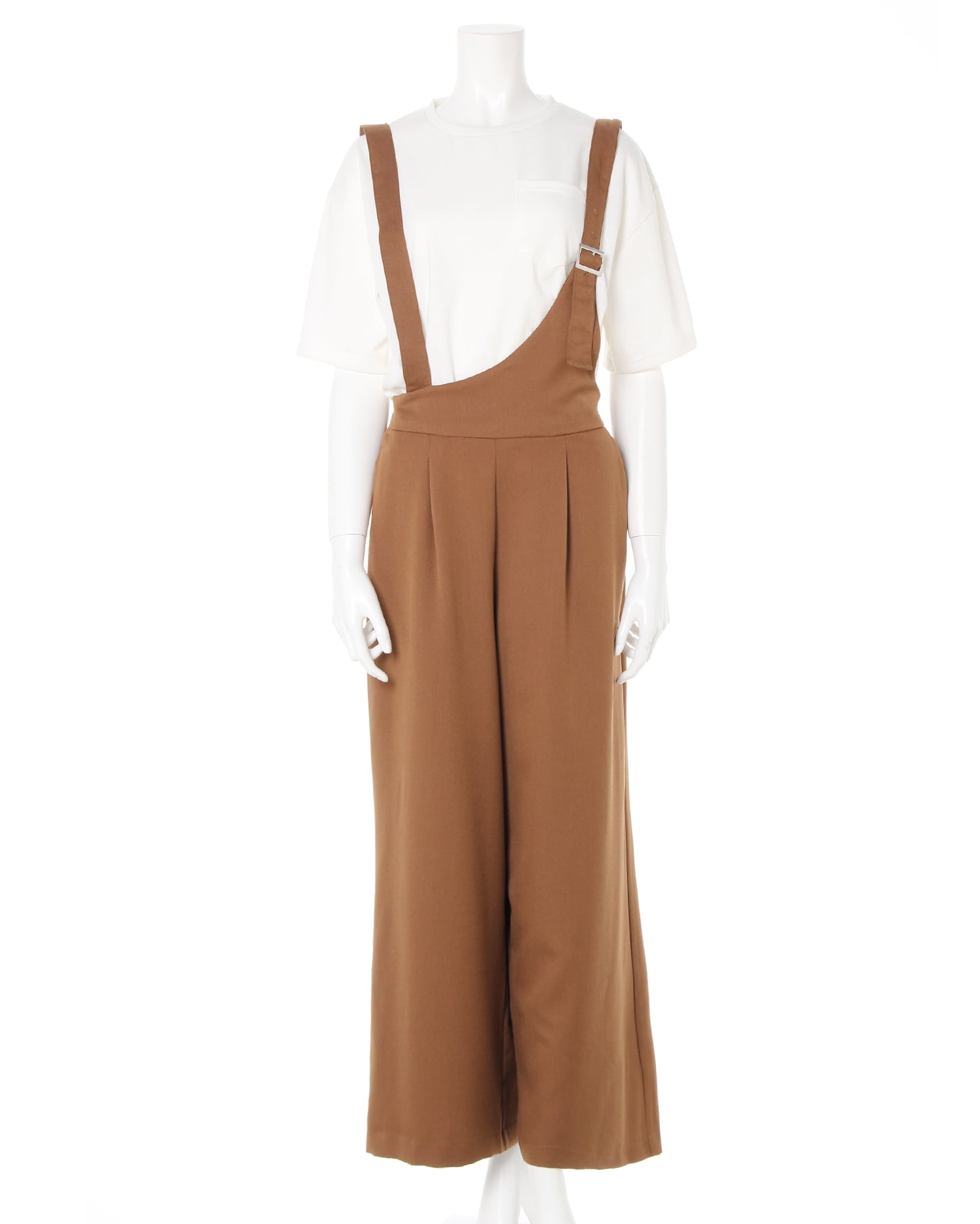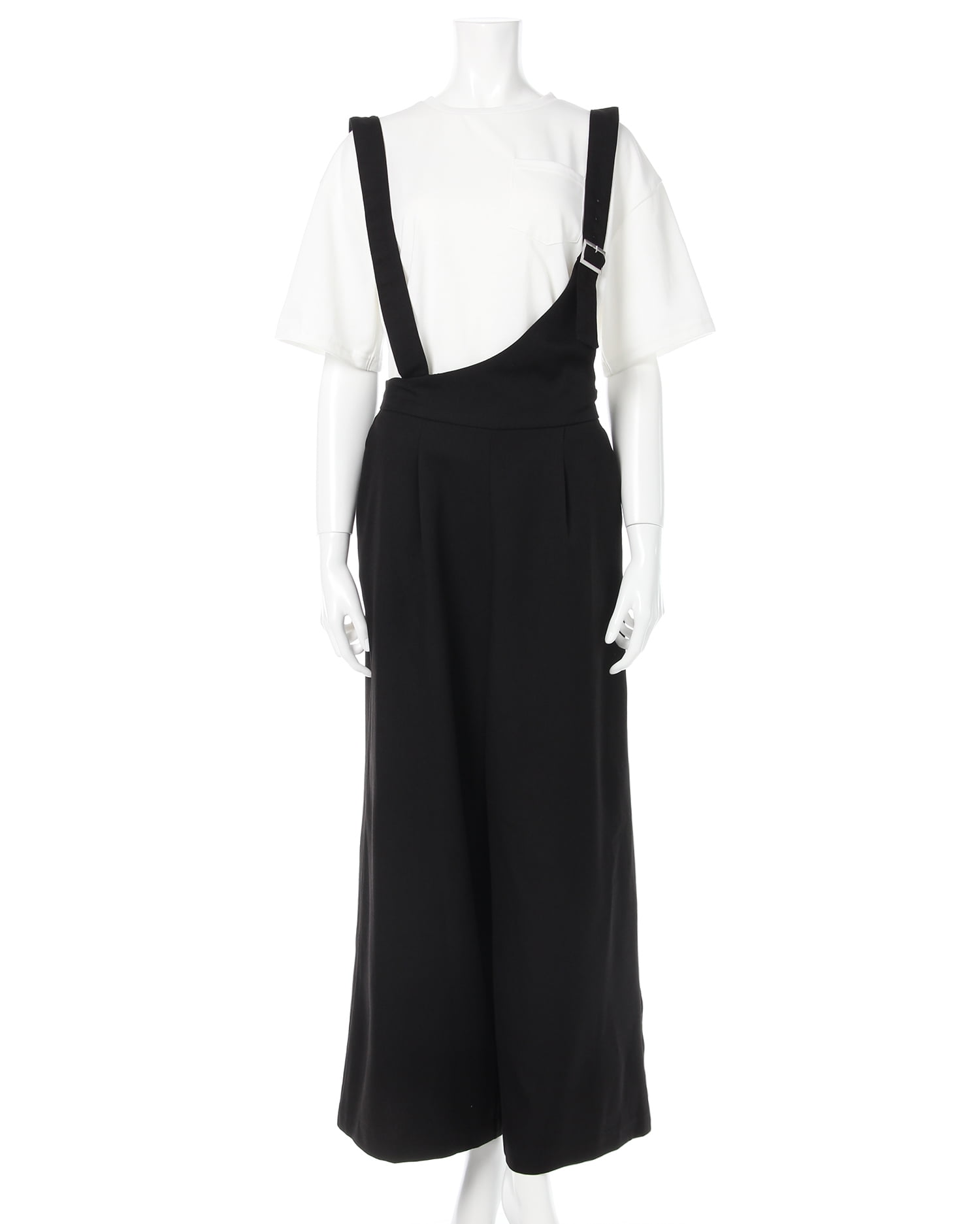 1枚でこなれ感のあるスタイルが完成するサロペットはワードローブの必須アイテム。合わせるインナー次第で色々な着こなしを楽しめます。ワンショルダーデザインでトレンドをキャッチ。伸縮性のある素材で快適な着心地になっています。太めのショルダーストラップにスクエアバックルがアクセント。パンツはワイドなシルエットで美脚を叶えます。