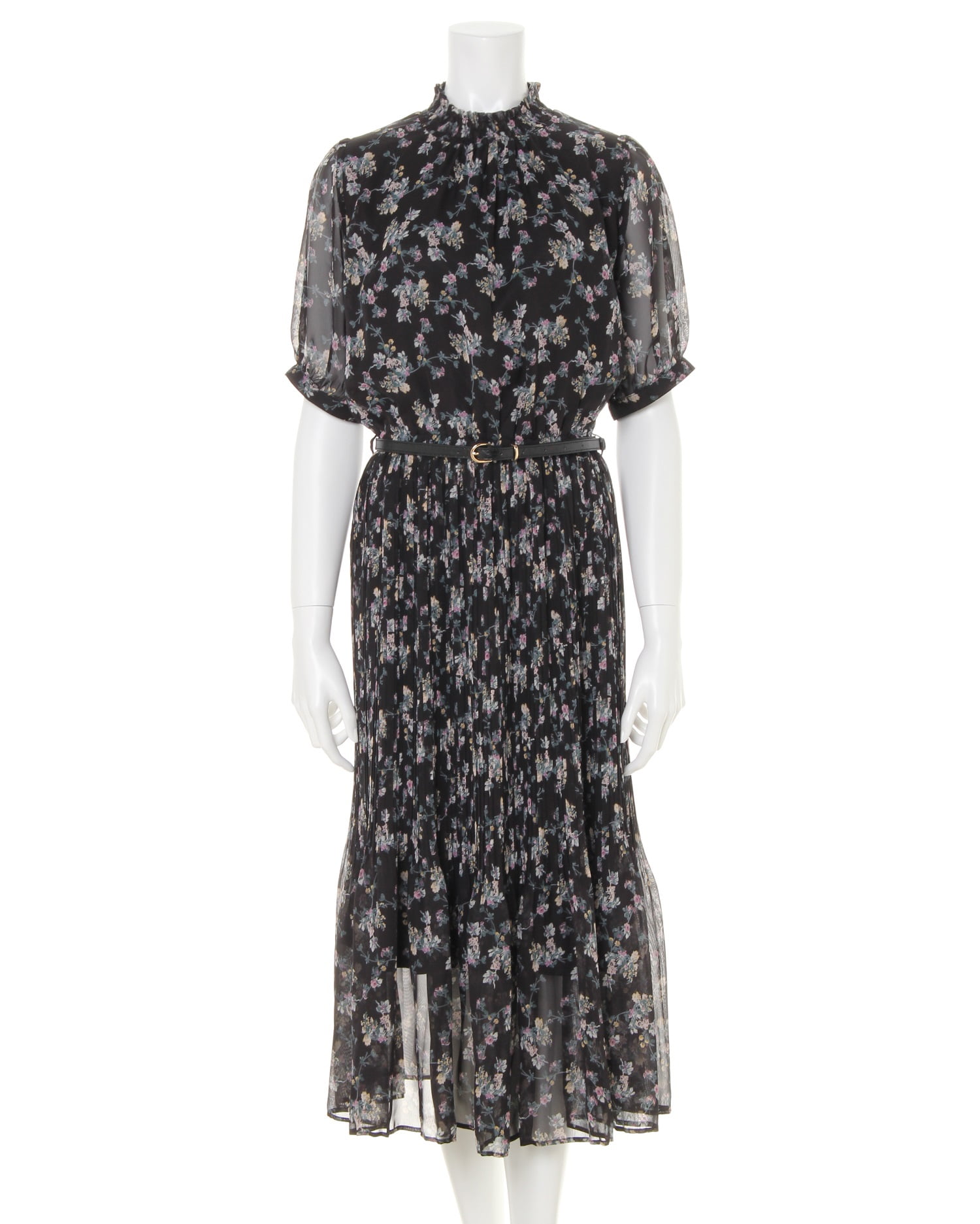 ほんのり透け感のあるエアリーな素材で仕立てたフェミニンなワンピースは全体にあしらったフラワープリントが魅力。クラシカルなギャザーハイネックと細かいプリーツで、1枚で表情のある着こなしが完成します。ウエスト部分はゴムになっているのでブラウジングも可能。上身頃、スカート部分に裏地が付いているので安心して着られます。ウエストマークに便利な細帯のベルト付き。