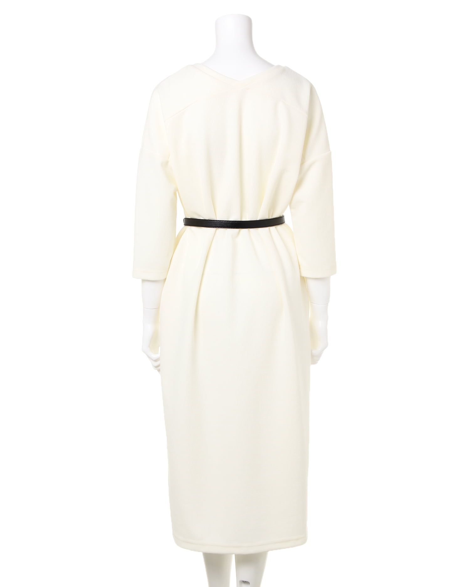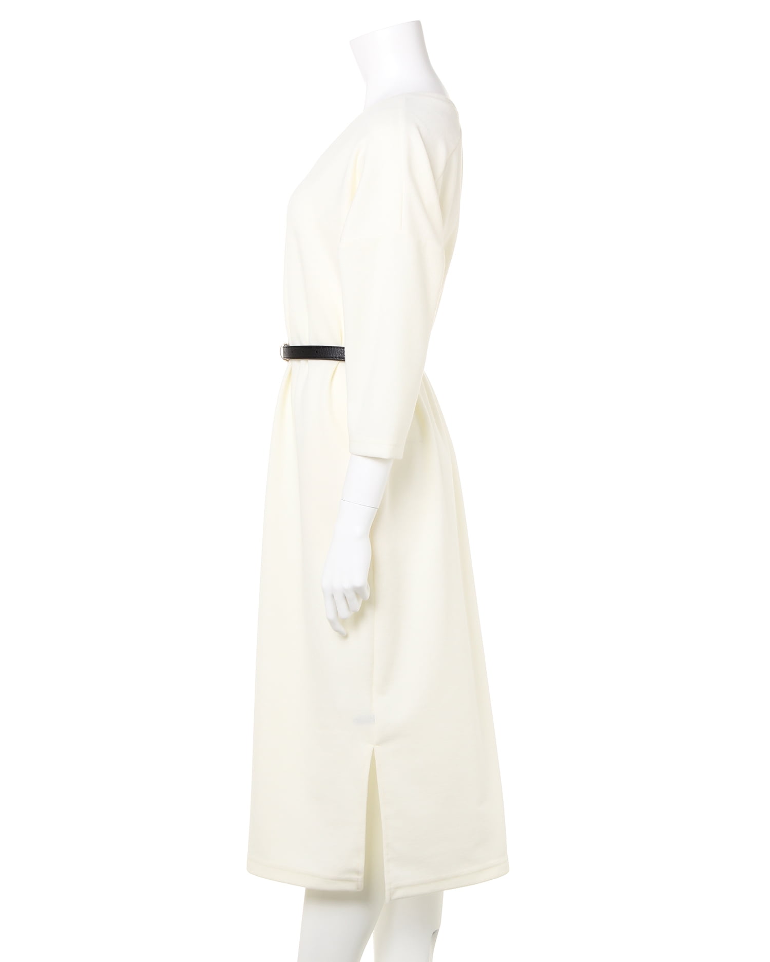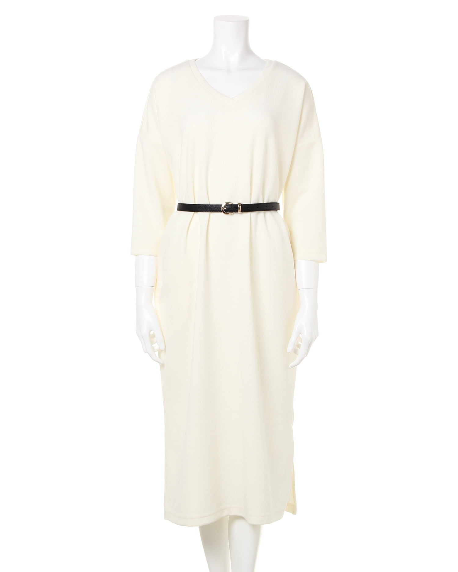 長めの丈感とシンプルなデザインでリラックスカジュアルにぴったりのワンピース。程よくハリ感を持たせた素材がきれいなシルエットをキープします。ドロップショルダーとゆったりした身頃で着心地も快適。裾にはスリット入りで足さばきも軽快です。落ち感のあるシルエットは体型カバーも期待出来るのがポイント。1枚ではもちろん、インナーを合わせた着こなしもオススメ。ウエストマークに便利なベルト付きです。