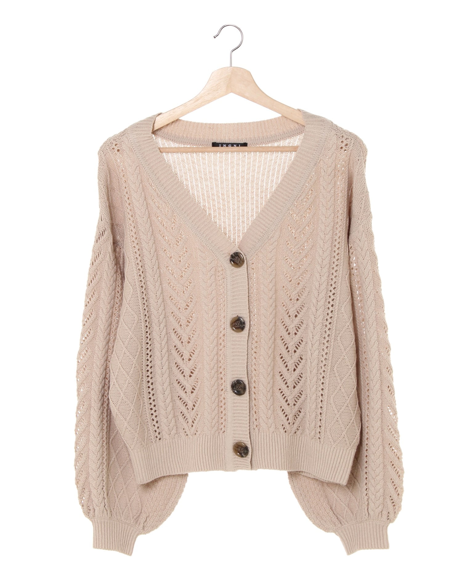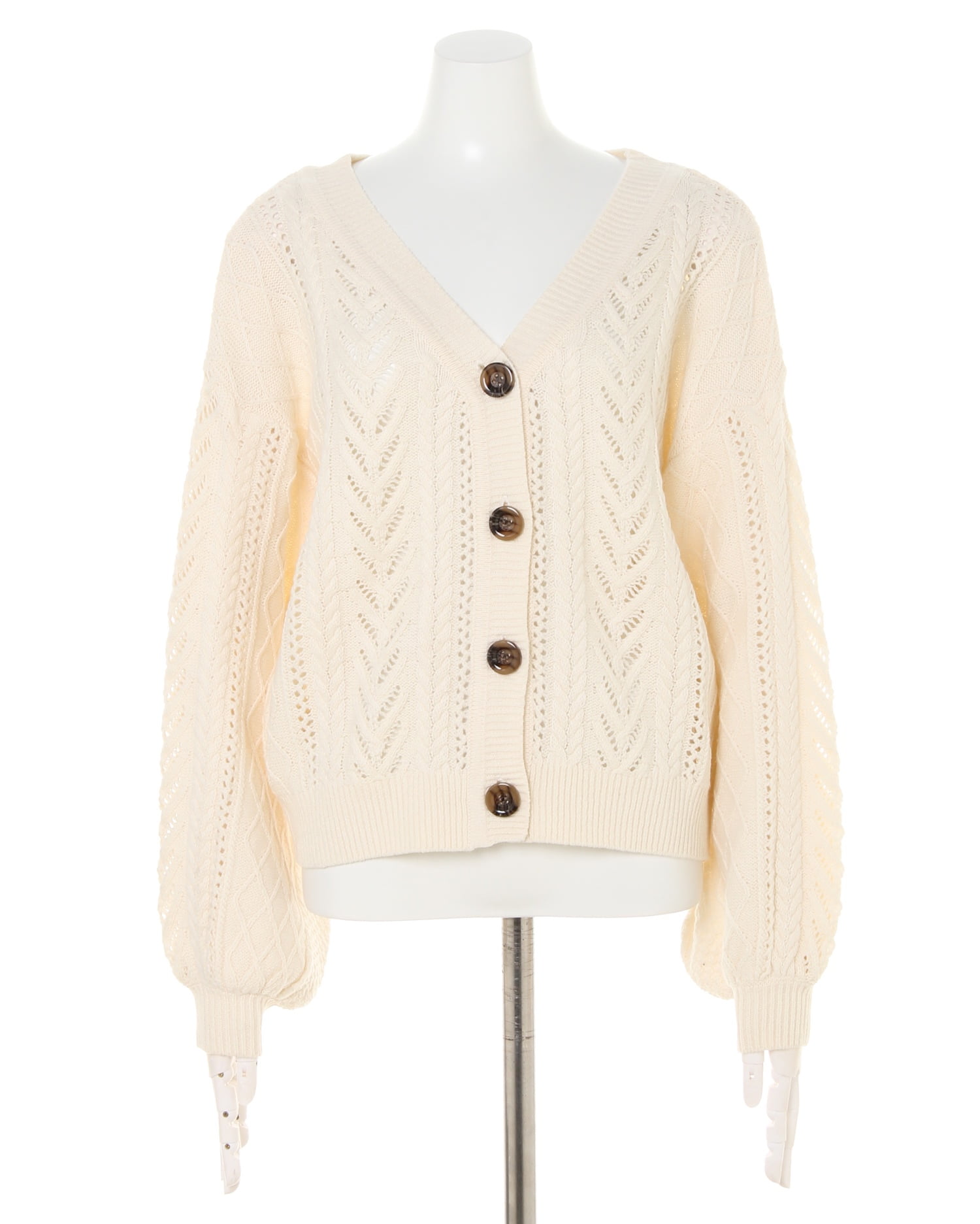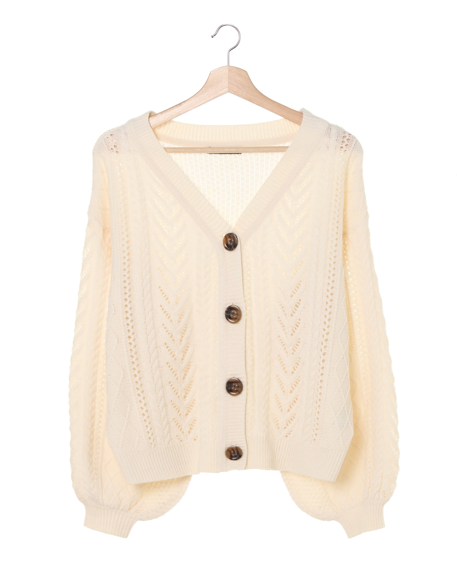 ナチュラル感たっぷりのキュートなコーディネイトが完成するショートカーディガン。ふんわりとしたボリュームスリーブとゆったりとした身頃が、リラックスカジュアルにぴったりの1枚です。薄手の透かし編みニットは、合わせるアイテムによってシーズン長く着回せるので持っておくと重宝。シャツやカットソーもバランス良く合わせられます。ベーシックで合わせやすいカラーバリエーションも◎。