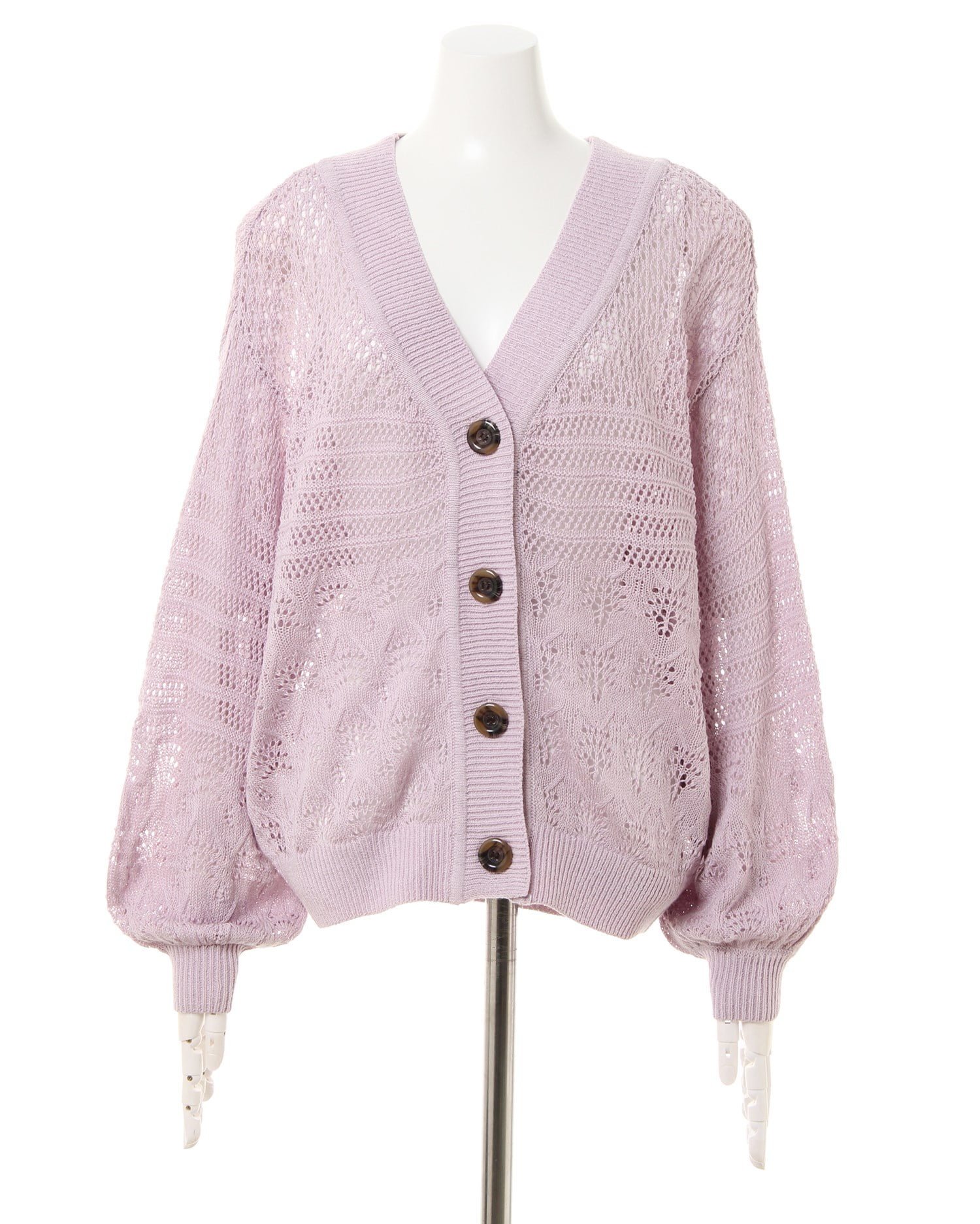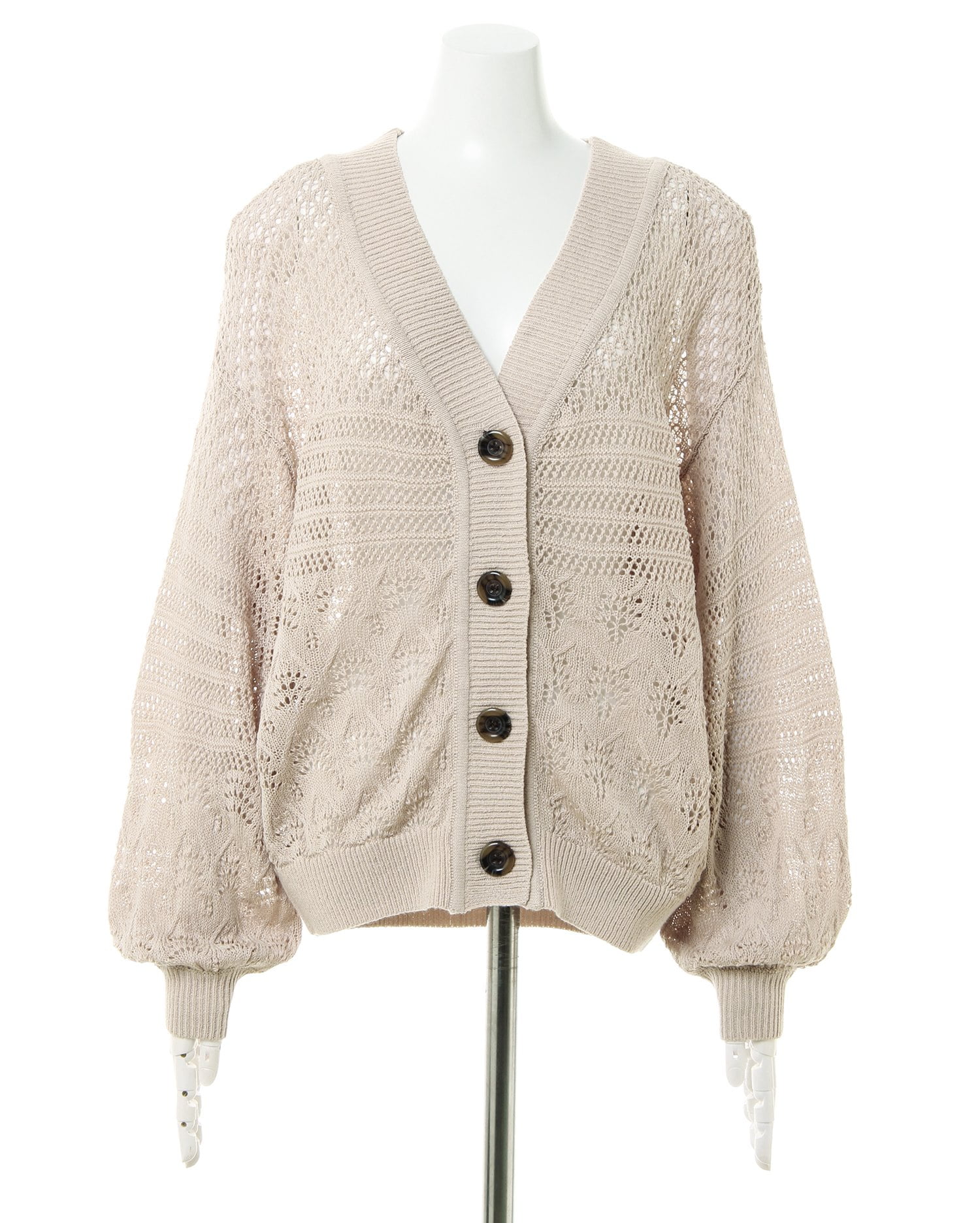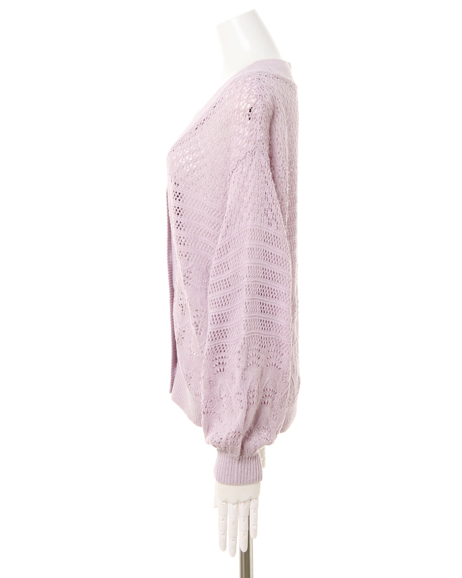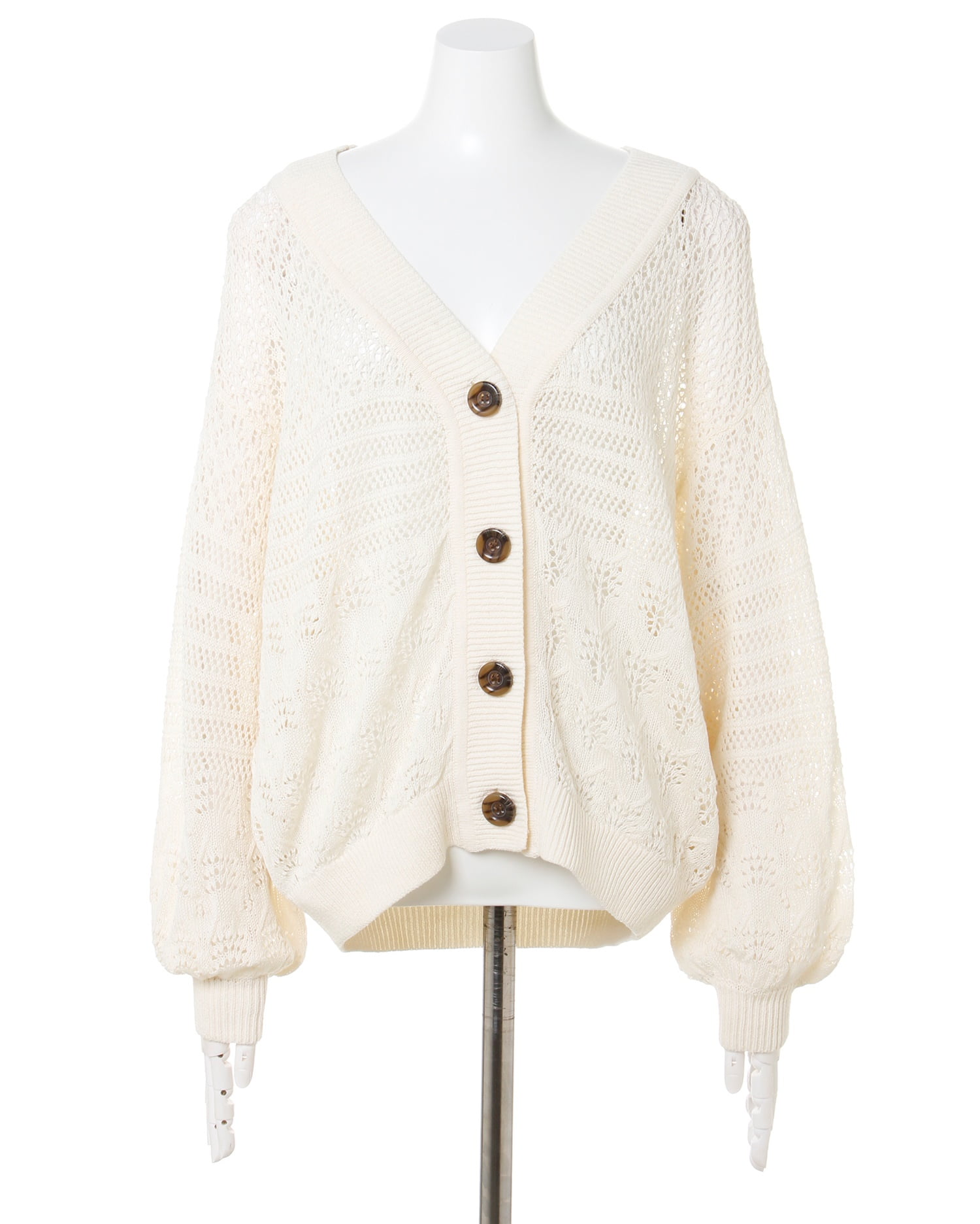 透かし編みが表情のある着こなしを叶えるカーディガンはショート丈が今年らしい1枚。シンプルなワンカラーも編み地を替えたデザインでこなれ感たっぷりに着こなせます。ゆったりめの身頃とボリュームを持たせたスリーブが◎。インナーを合わせてももたつかないので、着回し力も抜群です。薄手のニットはスイッチ期からシーズン長く活躍するので持っておくと重宝。スカートと合わせてガーリーな着こなしを楽しんで。