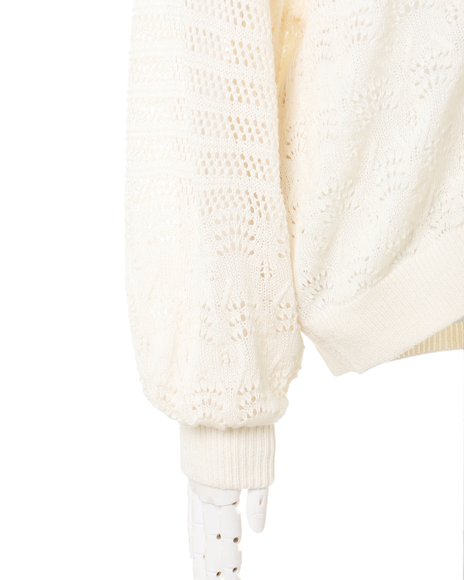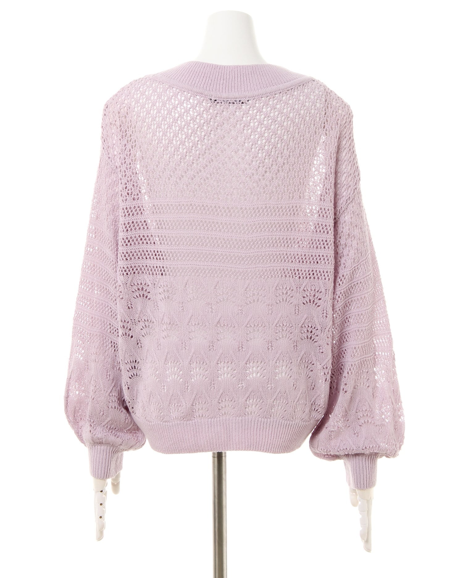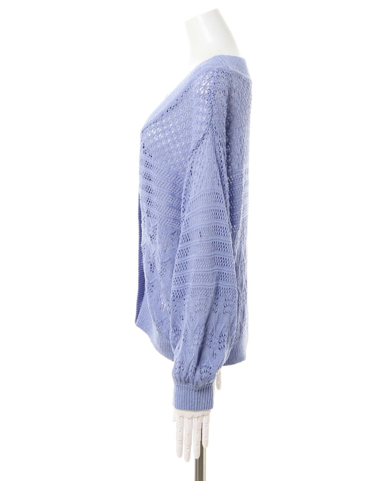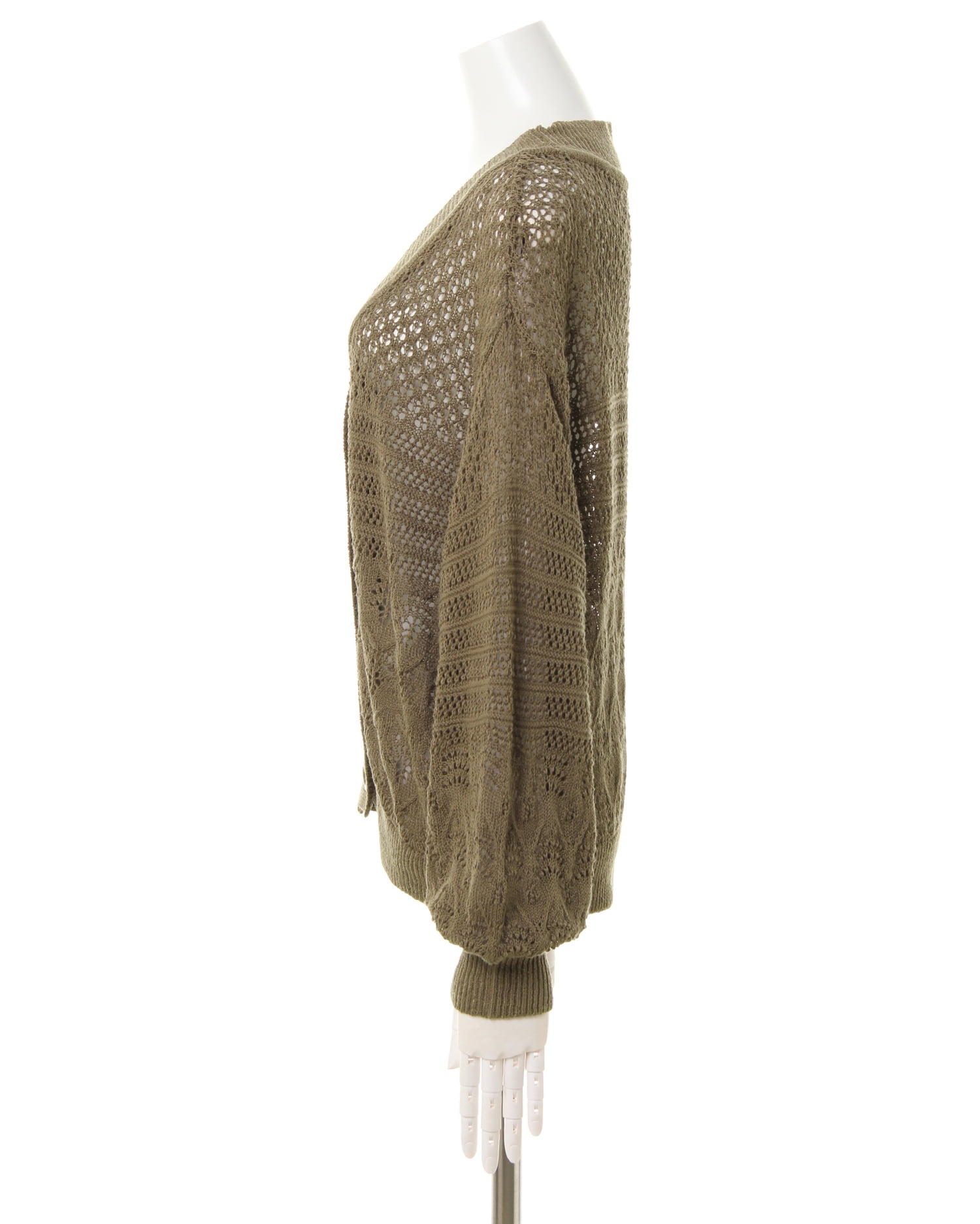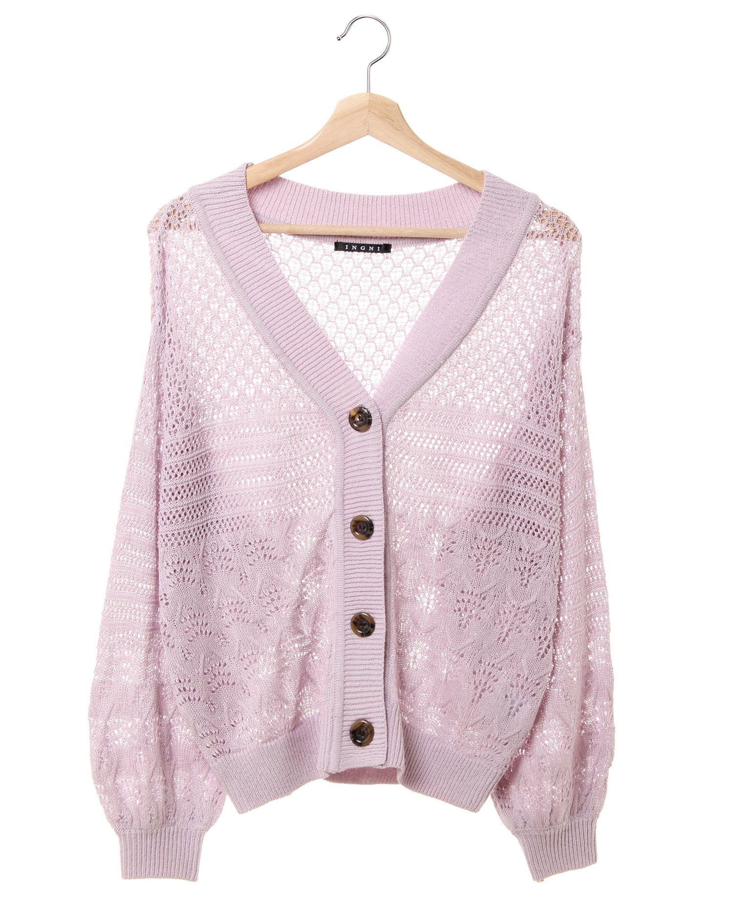 透かし編みが表情のある着こなしを叶えるカーディガンはショート丈が今年らしい1枚。シンプルなワンカラーも編み地を替えたデザインでこなれ感たっぷりに着こなせます。ゆったりめの身頃とボリュームを持たせたスリーブが◎。インナーを合わせてももたつかないので、着回し力も抜群です。薄手のニットはスイッチ期からシーズン長く活躍するので持っておくと重宝。スカートと合わせてガーリーな着こなしを楽しんで。