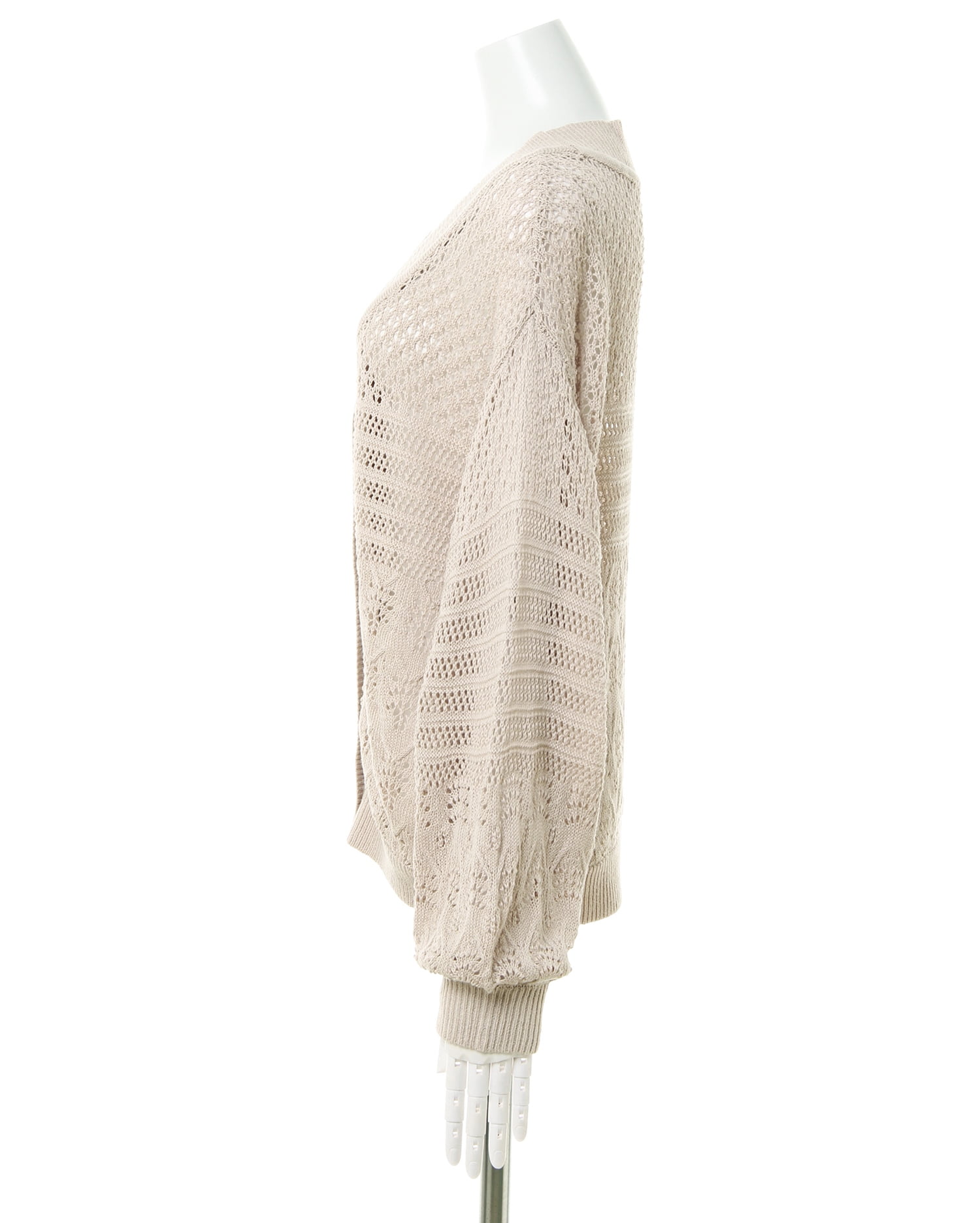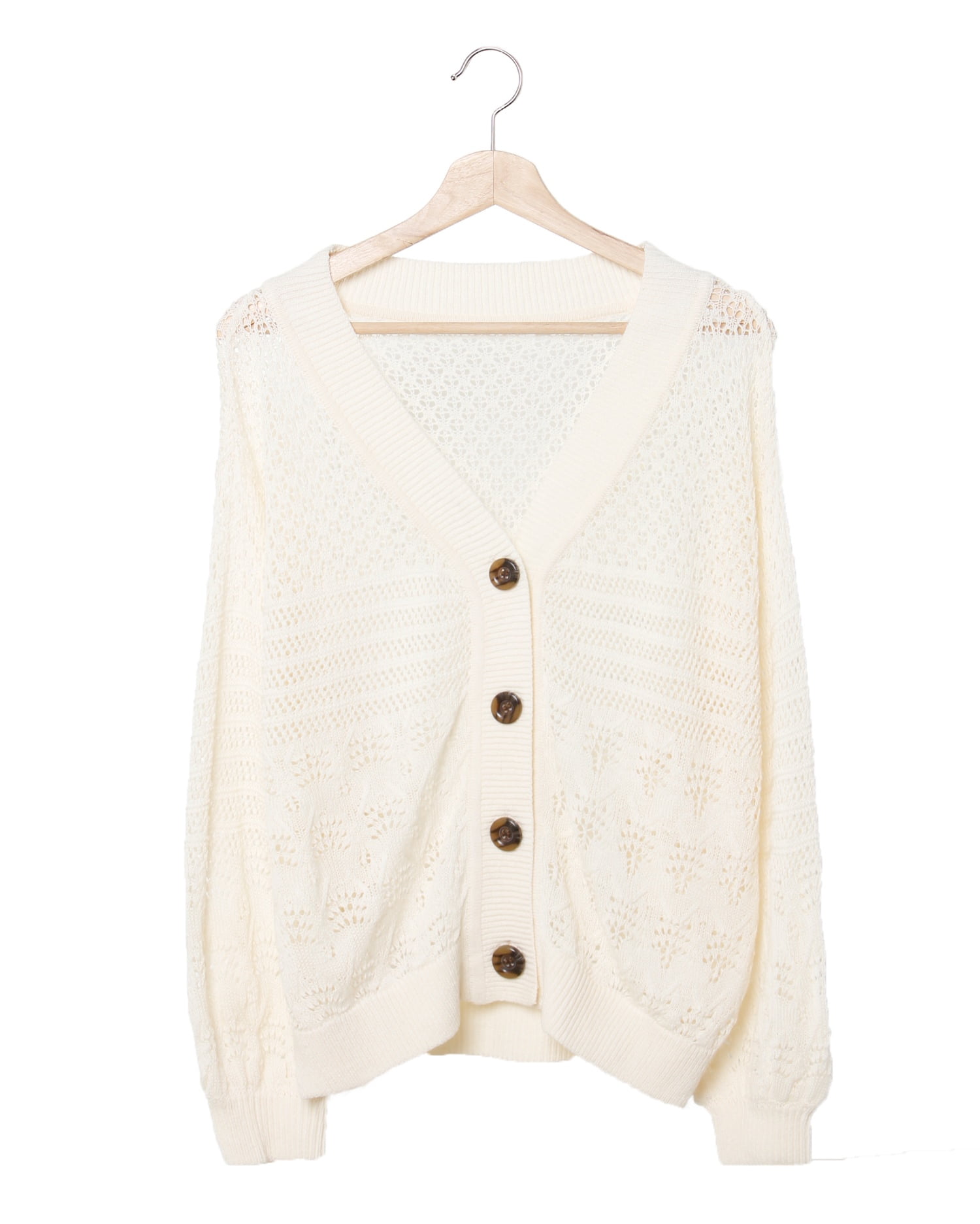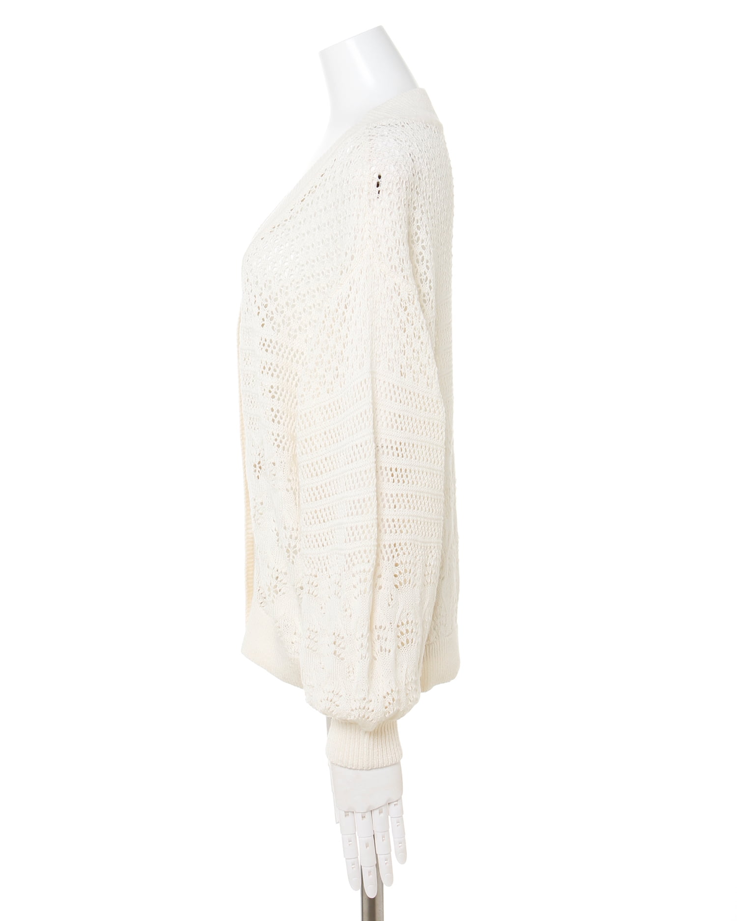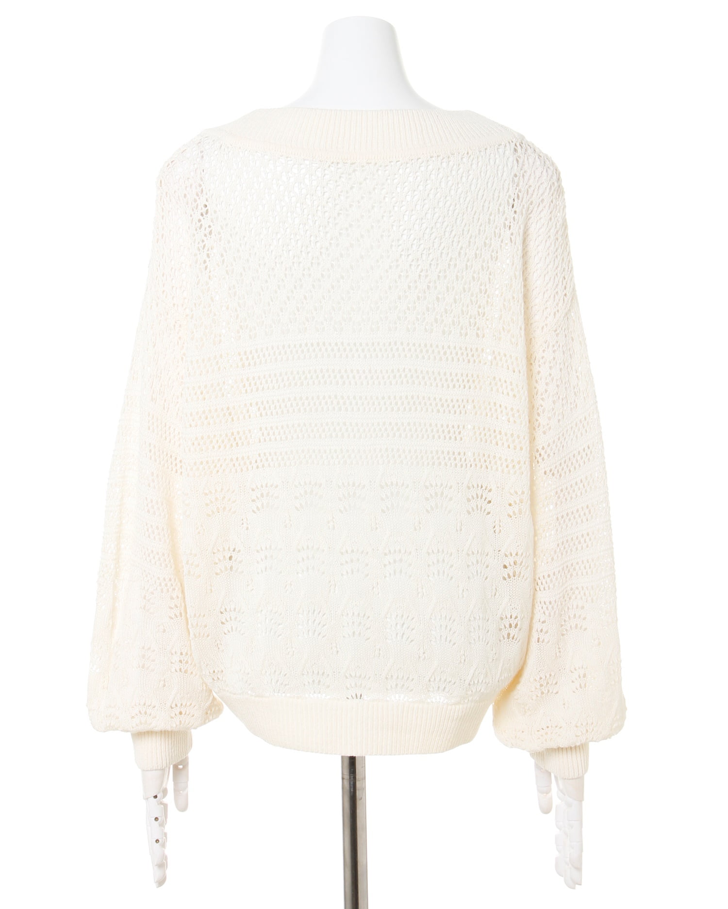 透かし編みが表情のある着こなしを叶えるカーディガンはショート丈が今年らしい1枚。シンプルなワンカラーも編み地を替えたデザインでこなれ感たっぷりに着こなせます。ゆったりめの身頃とボリュームを持たせたスリーブが◎。インナーを合わせてももたつかないので、着回し力も抜群です。薄手のニットはスイッチ期からシーズン長く活躍するので持っておくと重宝。スカートと合わせてガーリーな着こなしを楽しんで。
