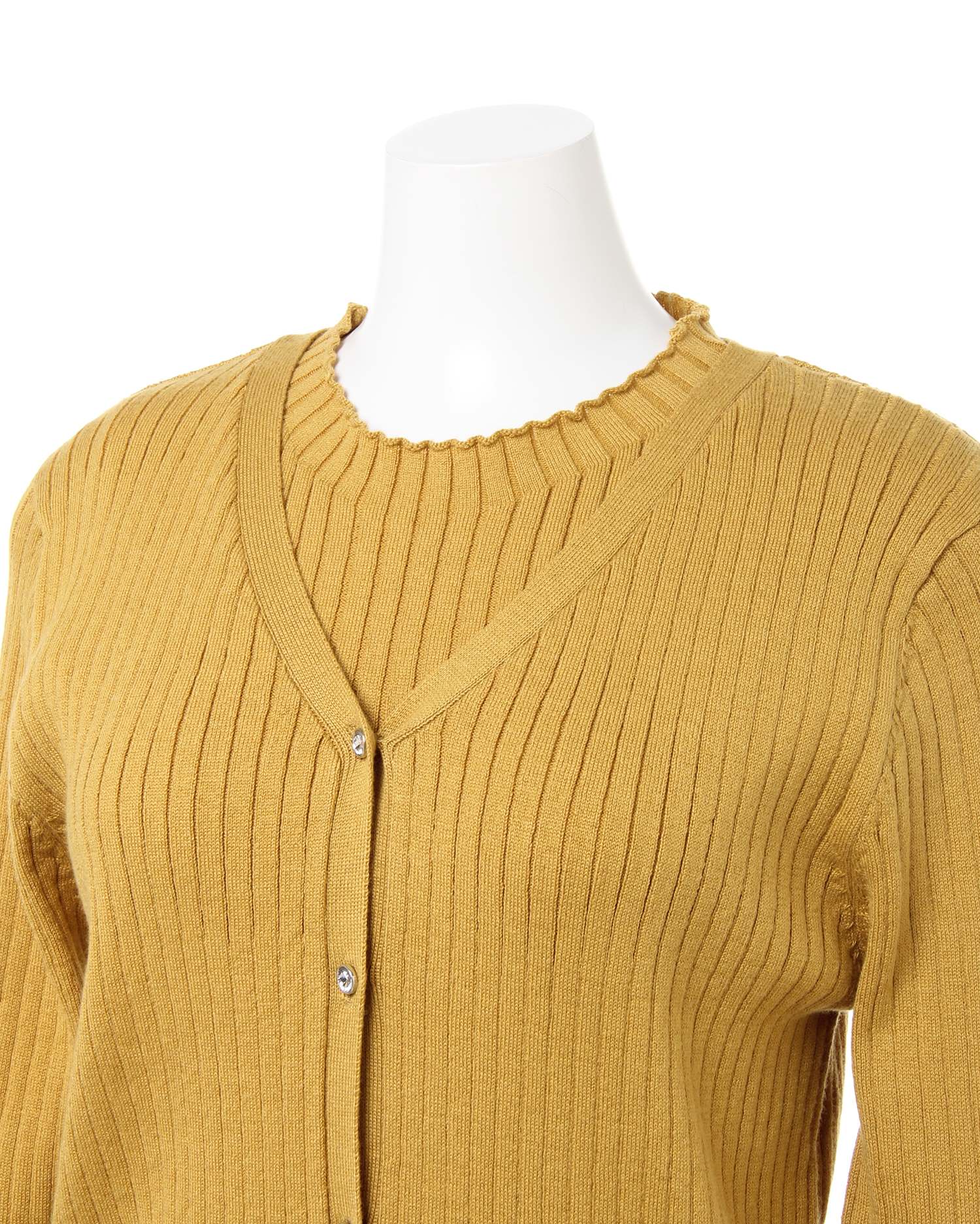 オンオフ問わずに着回せるシンプルデザインのアンサンブルです。程よい厚みのニットが使い勝手抜群。ボディに沿うシルエットでコンパクトに着こなせるノースリーブニットは、首元のメロウデザインがアクセント。ベーシックなVネックカーディガンは、ビジューボタンでフェミニンな仕上がりになっています。セットで合わせるだけでなく、単品使いも出来るので今すぐワードローブに追加決定です。
