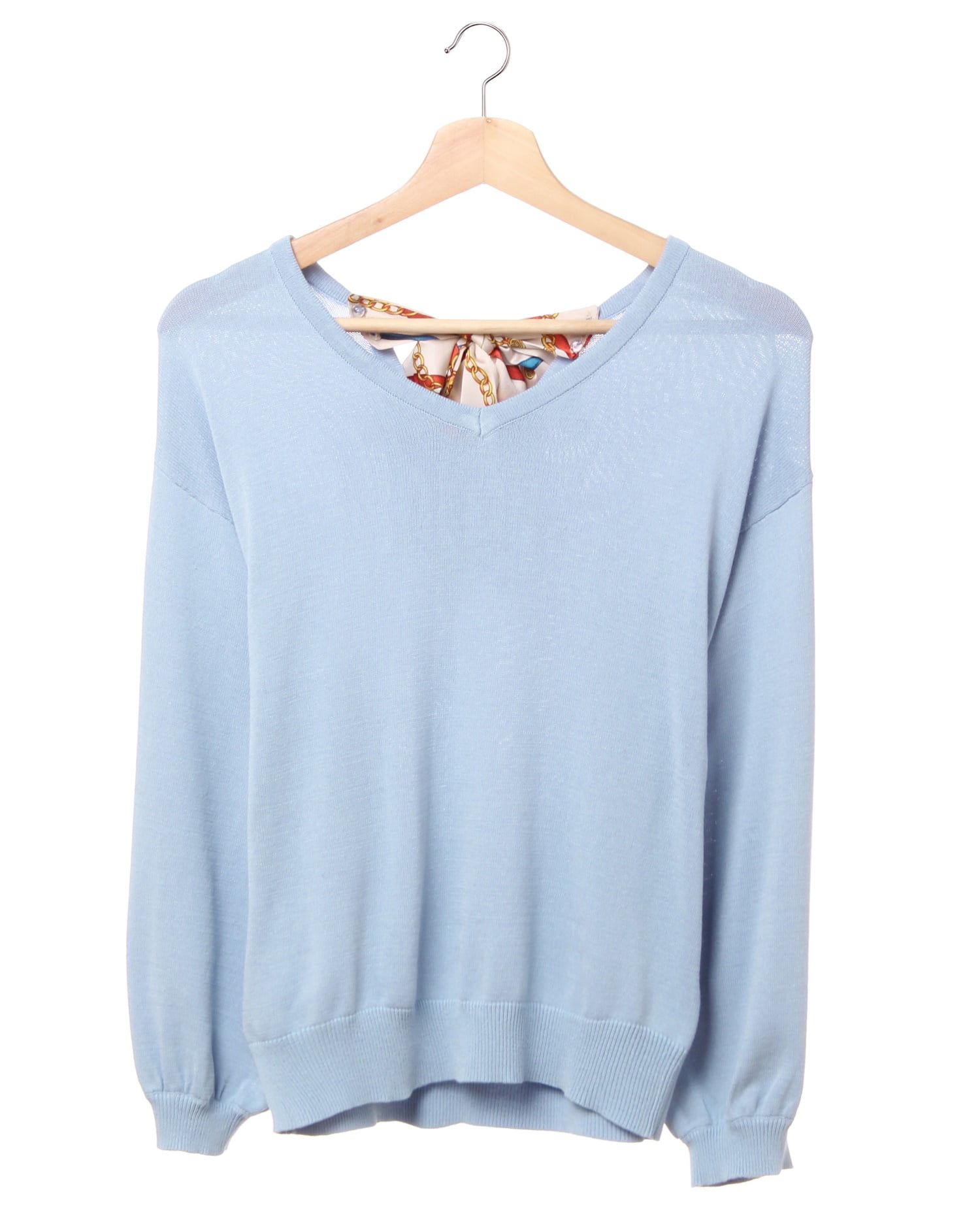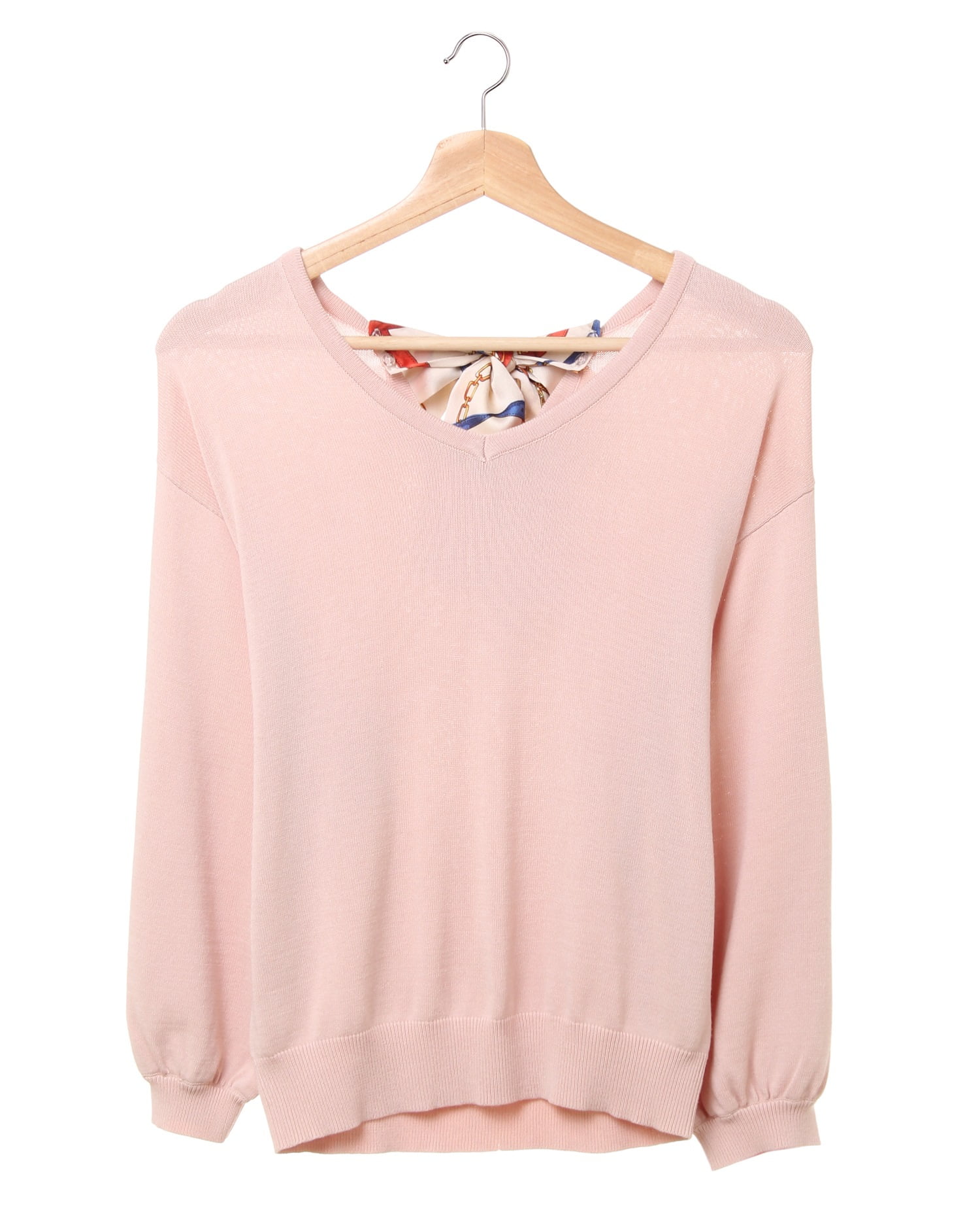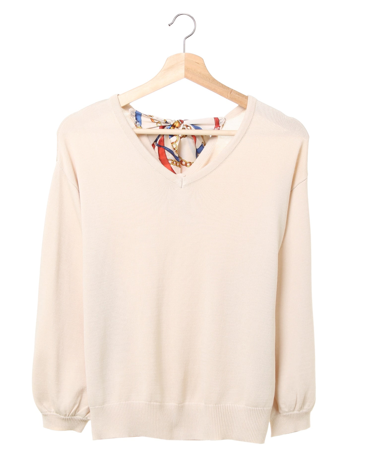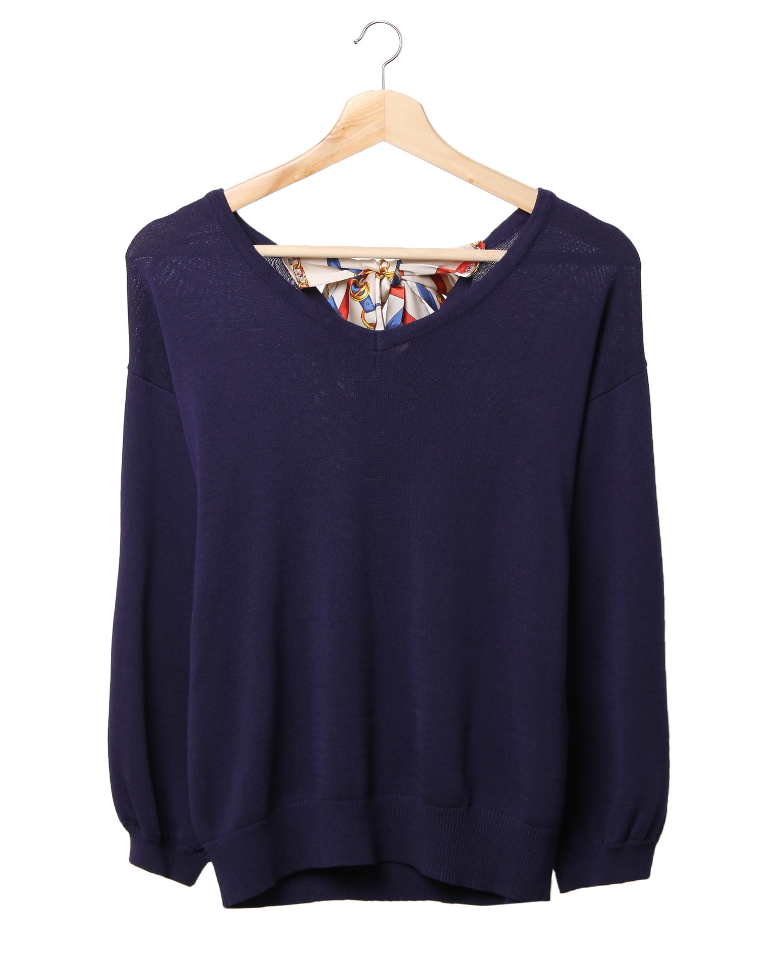 シンプルなVネックニットは後ろ姿で魅せるデザインに注目。ドロップショルダーとゆったりめの身頃で、トレンド感のあるシルエットに仕立てています。柔らかなニットは肌馴染みも抜群。ふんわりとボリュームを持たせたスリーブでフェミニンな着こなしを叶えます。ベーシックカラーに映える後ろのスカーフがアクセント。スカーフはボタンで取り外し可能です。