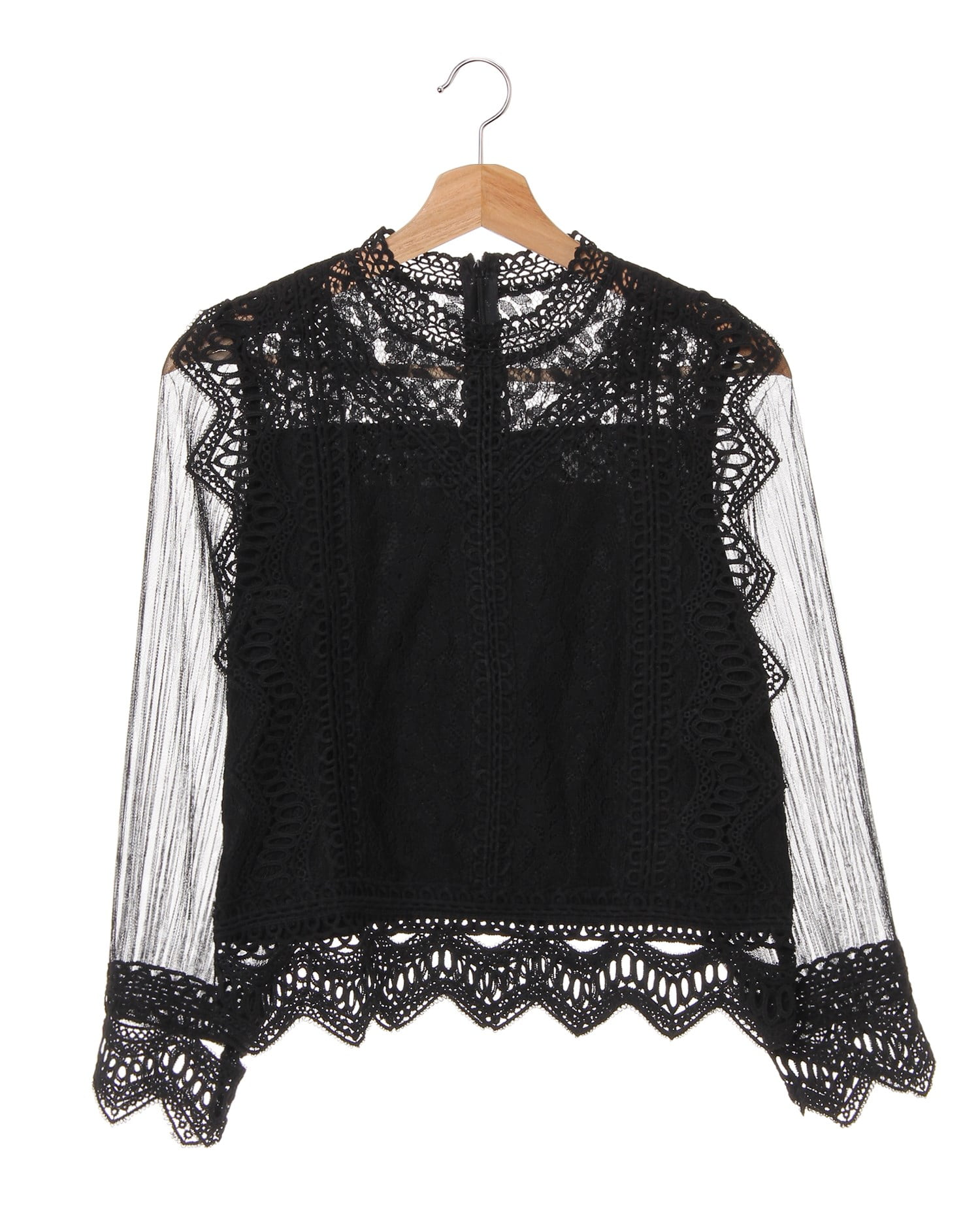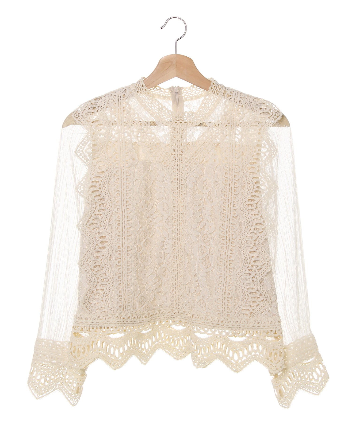 繊細なフラワーレースと立体的なアイレットレースの組み合わせがガーリーな長袖トップス。ワンカラーながら異素材で変化をつけているので存在感抜群です。チュール袖からほんのり透ける肌がフェミニンで大人っぽい雰囲気に。袖口や裾のスカラップカットがメリハリのあるスタイルに導きます。透け感のある素材もベアトップのような裏地付きなので1枚でも安心。シンプルなボトムスに合わせるだけで雰囲気のある着こなしを楽しめます。