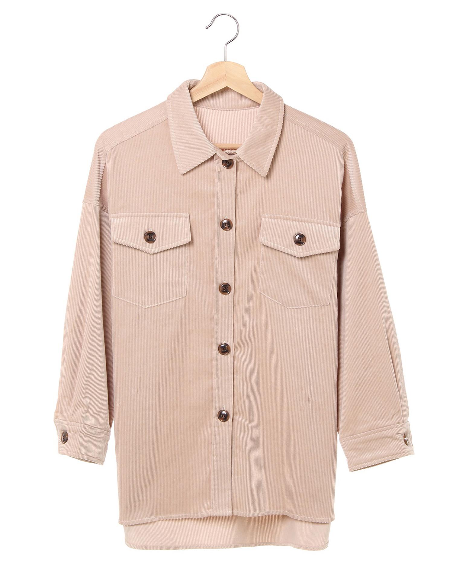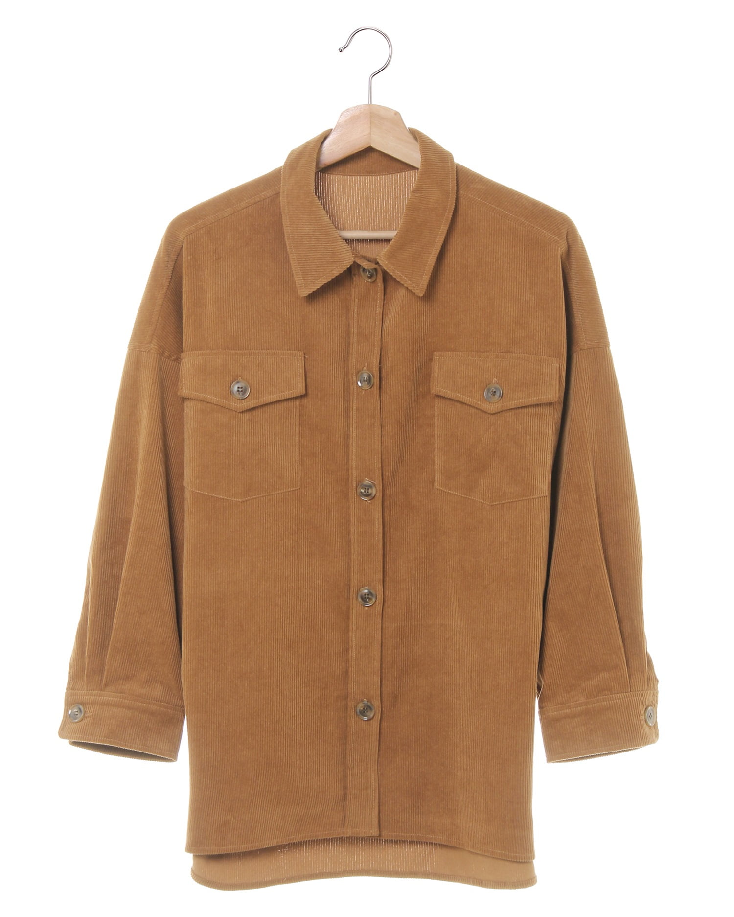 インパクトのあるビッグシルエットでこなれたスタイルが完成するコーデュロイ素材のシャツです。ウォーム感のある柔らかな風合いの素材と程よい厚みで季節の変わり目に重宝します。フロント部分のポケットが着こなしのアクセントに。襟付きできちんとした雰囲気があるのでカジュアルになりすぎず落ち着いた印象で着られるのも魅力。羽織としてはもちろん1枚でも着用可能な万能アイテムで、揃えておくと便利です。