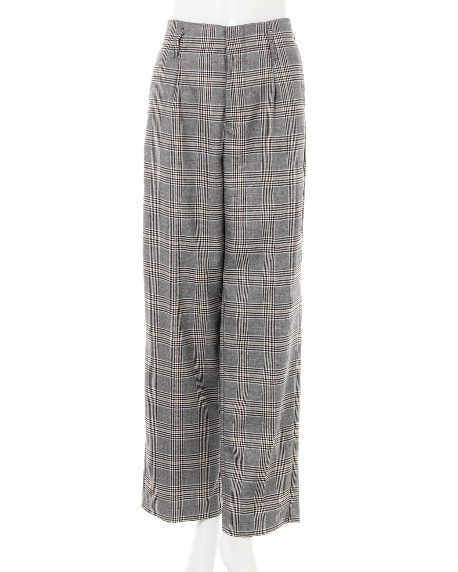 程よい素材感で季節の変わり目からロングシーズン愛用できるグレンチェックのワイドパンツです。きれいめスタイルにもオススメの質感で着まわせる幅の広い賢い1枚。ベーシックなフォルムでどんなトップスとも相性抜群なので普段使いに重宝します。落ち着き感のあるカラートーンが、シックな女性らしさを演出。センタープレスの入ったすとんと落ちるワイドシルエットは、気になる腰回りをカバーし脚長効果も期待出来ます。