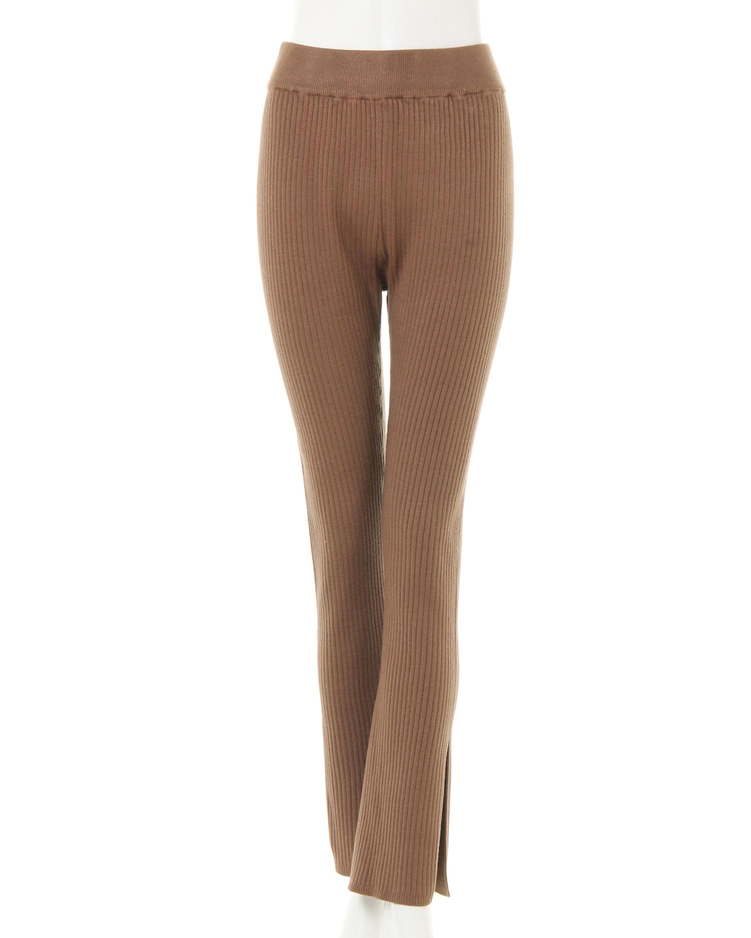 軽い穿き心地で動きやすい季節感を感じる風合いのニットパンツ。裾に向かって広がるフレアシルエットで美脚効果も期待出来る優秀なアイテム。しっとりとしたソフトな肌触りでストレスフリーなので普段使いに重宝します。ウエストは総ゴムで脱ぎ穿きもスムーズ。裾のサイドスリットで足さばきも楽チン。同系色のトップスと合わせたワントーンコーデがオススメです。