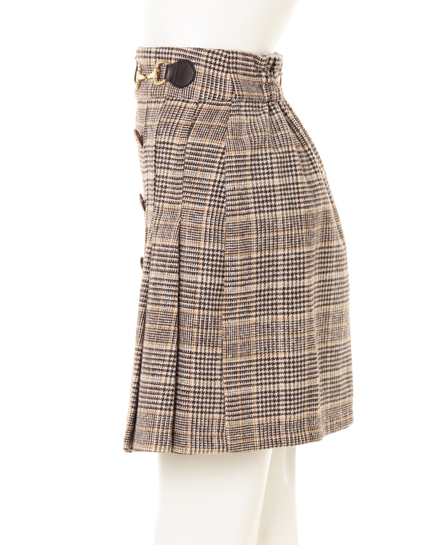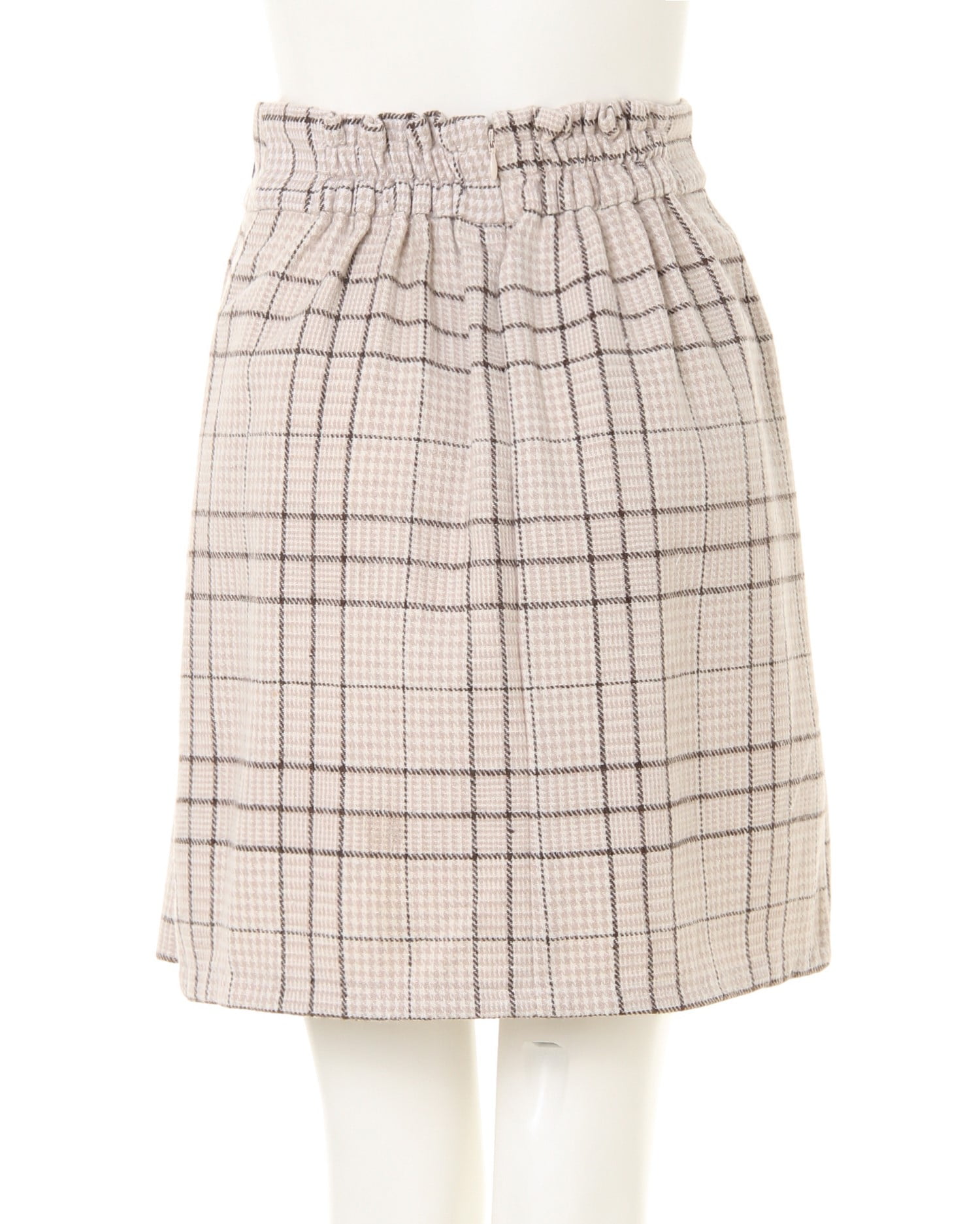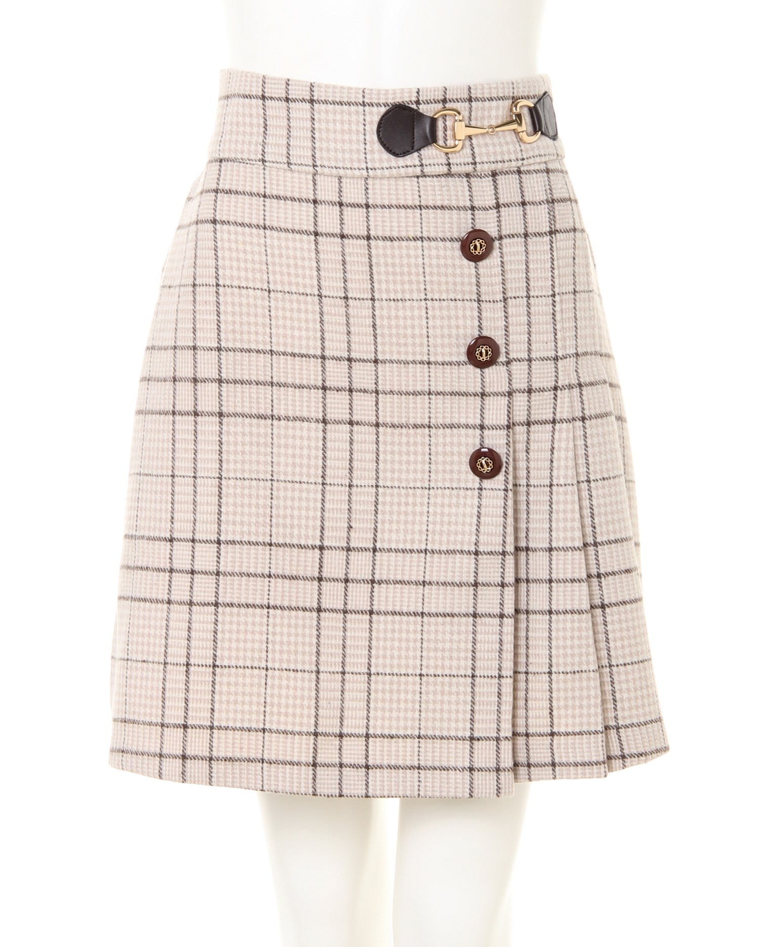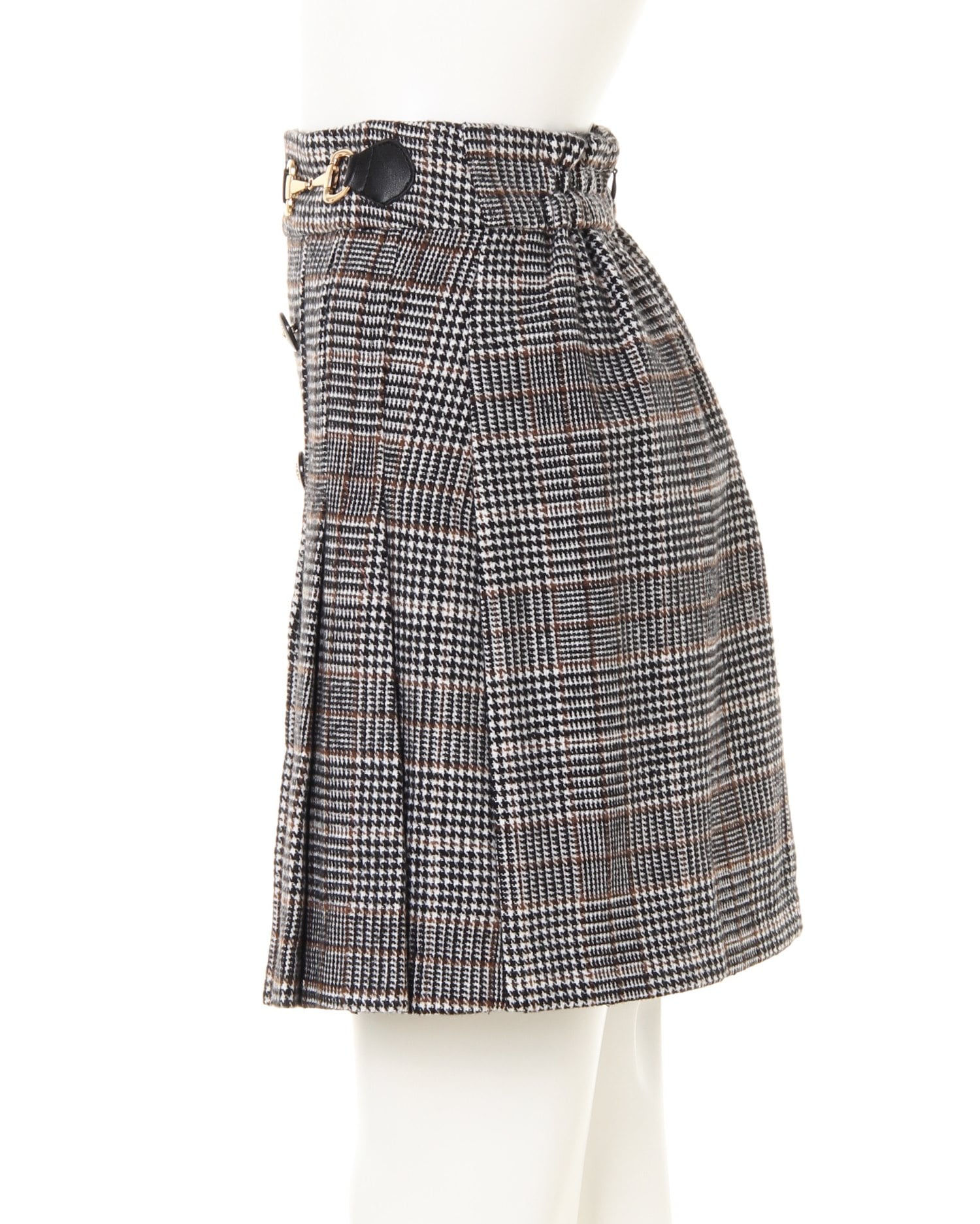 マニッシュな印象のチェック柄スカートは使いやすい台形シルエットが魅力的。やや起毛した素材で季節感たっぷりの着こなしに仕上げてくれます。フロント部分のサイドにあしらったプリーツの切り替えやビットがトラッドなアクセント。デザイン性のある逸品は大人も着られるミニ丈で、レッグラインをほっそりと演出できる丈感なのも嬉しい。後ろ部分はファスナーとゴムになっているので脱ぎ穿きもスムーズです。