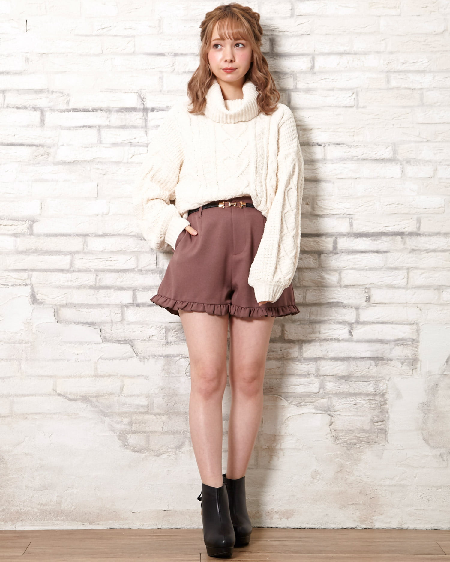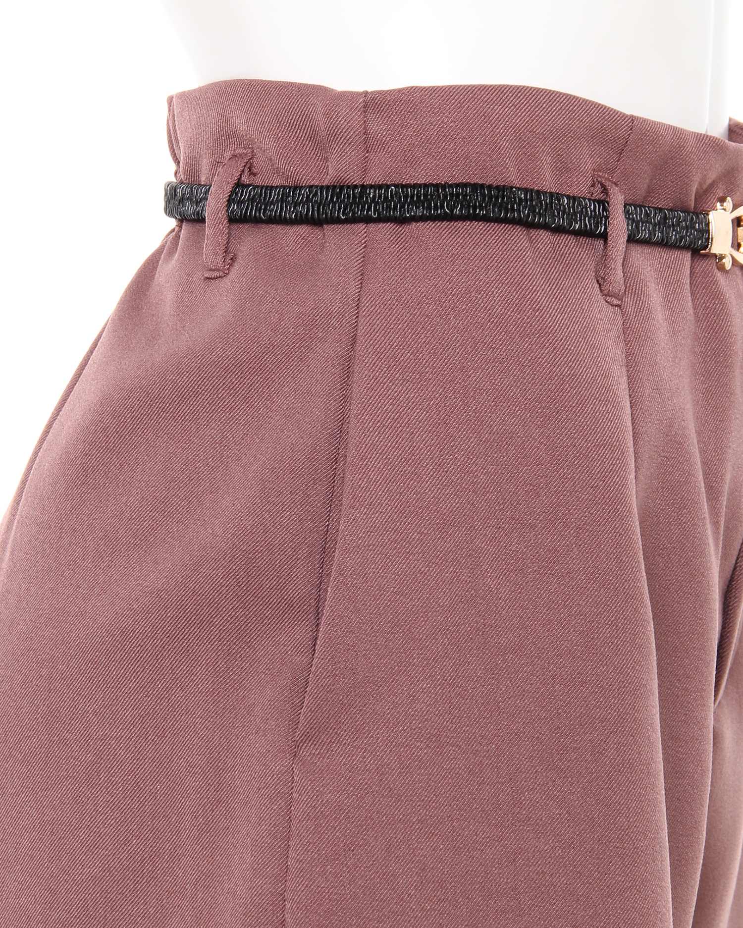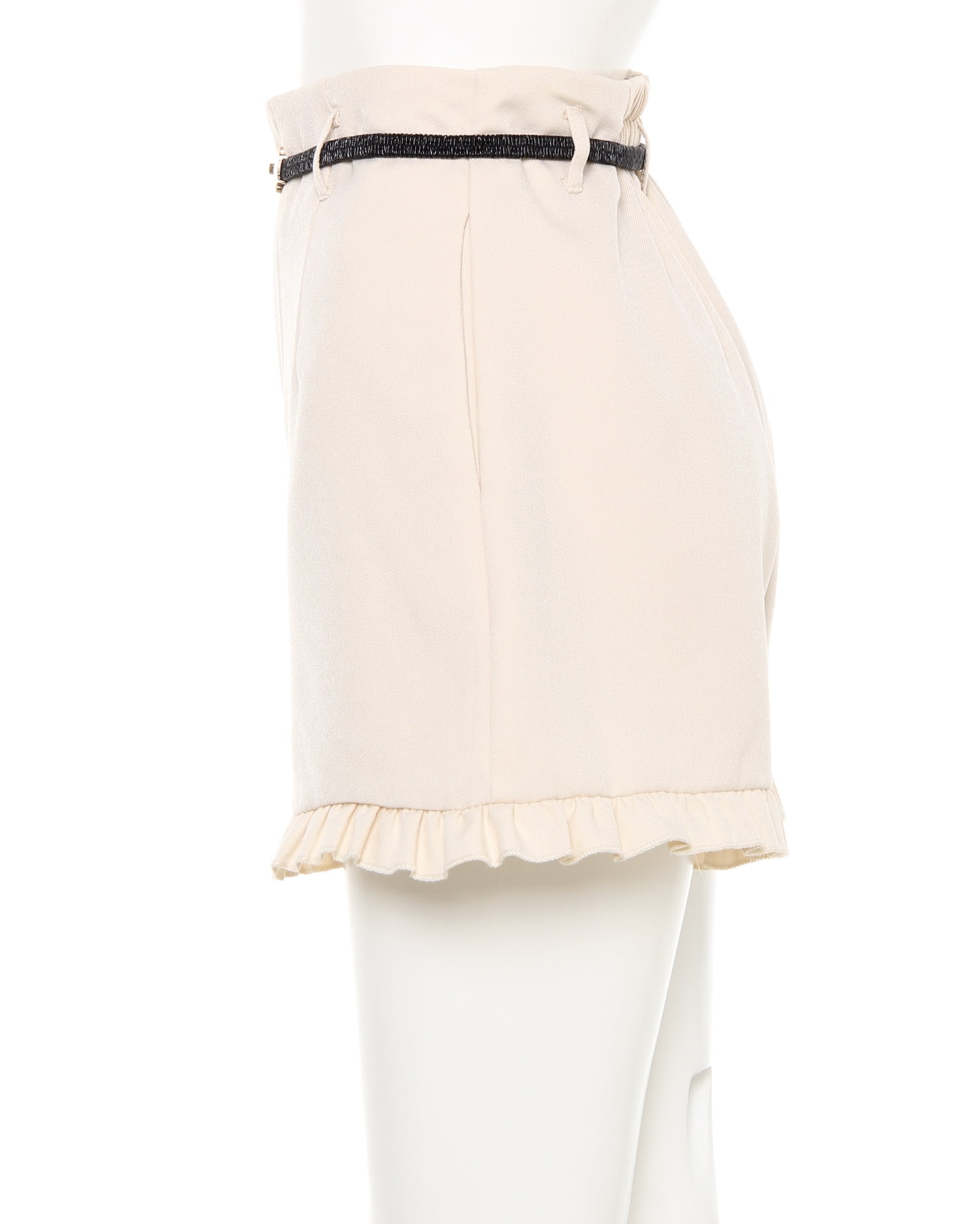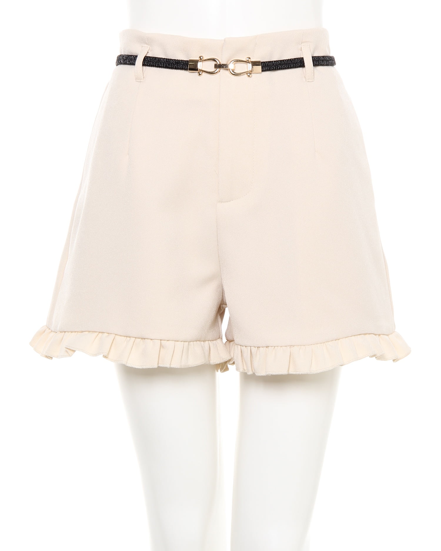 フェミニンなトップスと合わせてガーリーに着こなせるキュロットパンツ。広めの裾にあしらったフリルが表情豊かなアクセントになっています。裾に向かって広がるフレアシルエットがヒップラインをカバー、スタイルアップ効果も期待できる優秀デザイン。ウエストの後ろ部分はゴムを入れているので脱ぎ穿きも快適、デイリーに重宝します。メリハリのあるウエストを演出してくれるベルト付き。