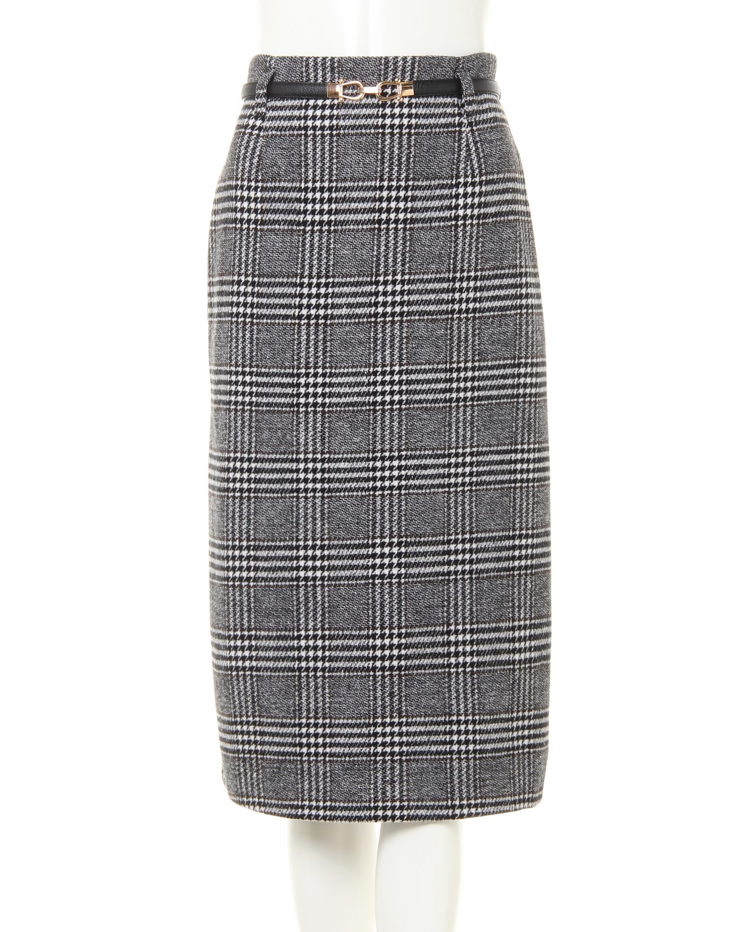 すっきりとしたタイトな美シルエットでスタイルアップ効果も期待できるナロースカート。季節感漂う微起毛のやや厚めの生地で暖か。トレンドのチェック柄はシンプルなトップスに合わせるだけこなれ感たっぷりに着こなせます。バックウエストはゴム&ファスナーで着脱も便利。ゴールドの金具が大人っぽいサッと付けられるベルトも嬉しいポイントです。