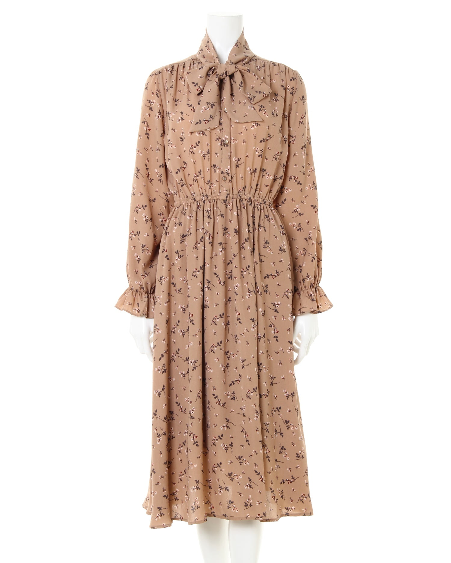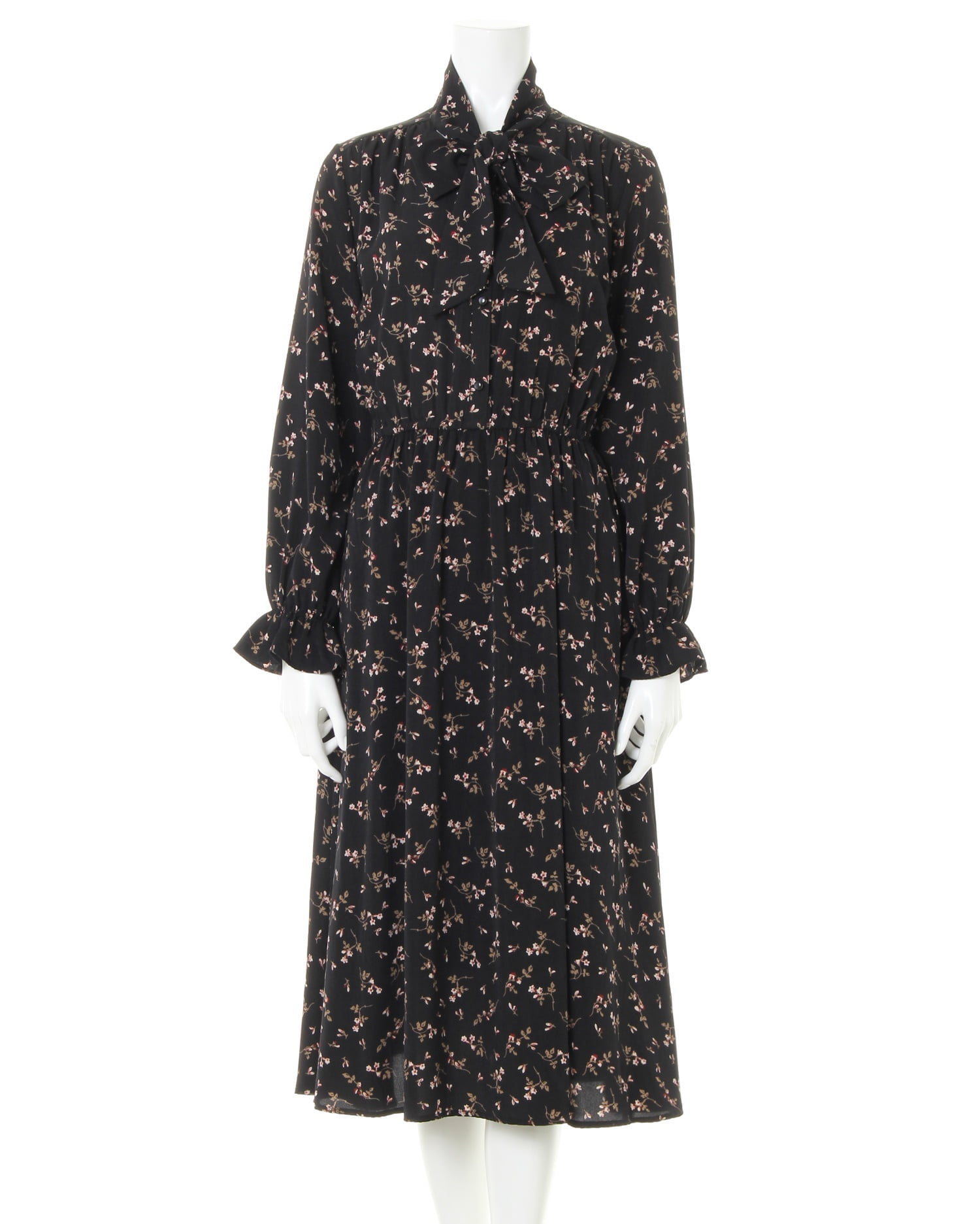 控えめなフラワープリントが可憐な印象のワンピースはボウタイデザインが新鮮。首元や袖の細部までこだわったデザインで大人ガーリーな着こなしが楽しめる1枚。エアリー感のある軽やかな素材で着心地も抜群です。ネック部分にボリュームを持たせることで顔周りをすっきり見せてくれる効果も。ウエスト部分はゴムになっているので着るだけでメリハリのあるスタイルに導きます。トップス部分のボタンを開ければ着脱もスムーズ。