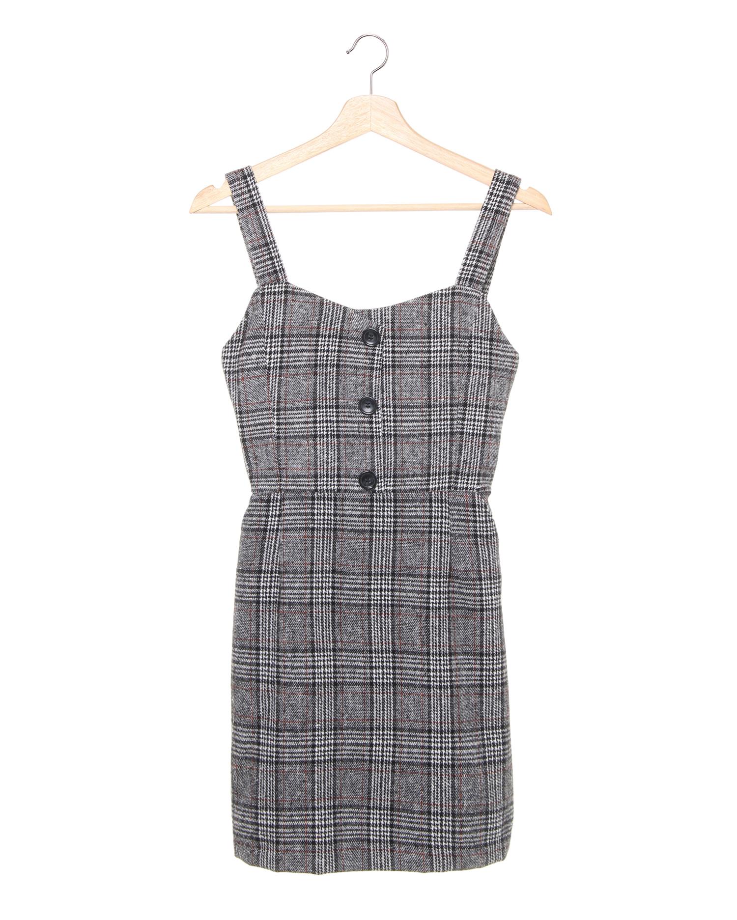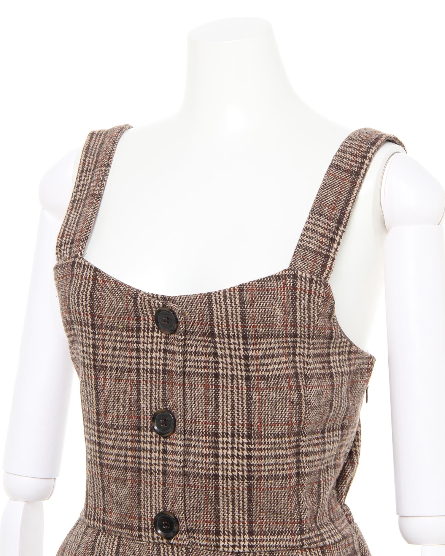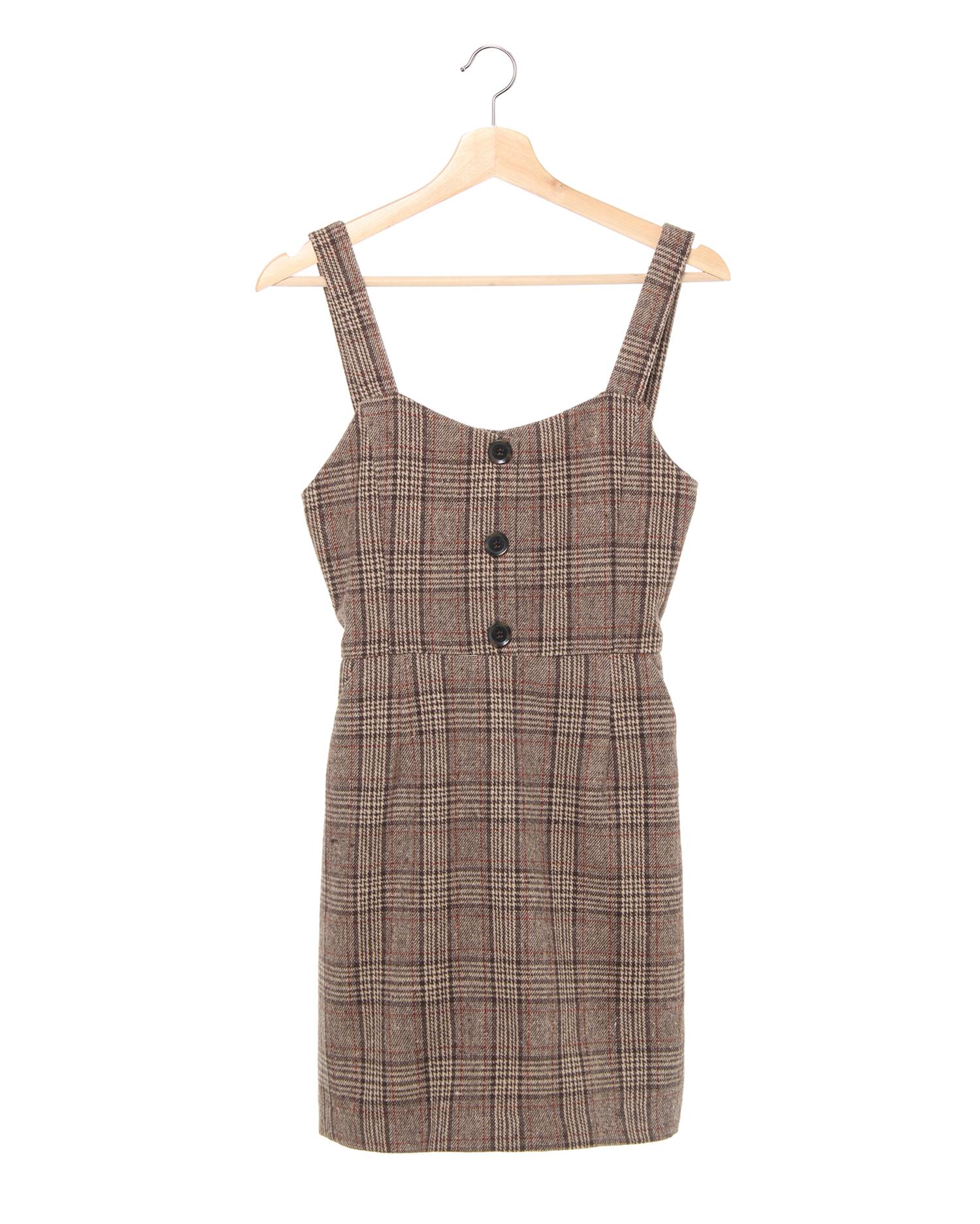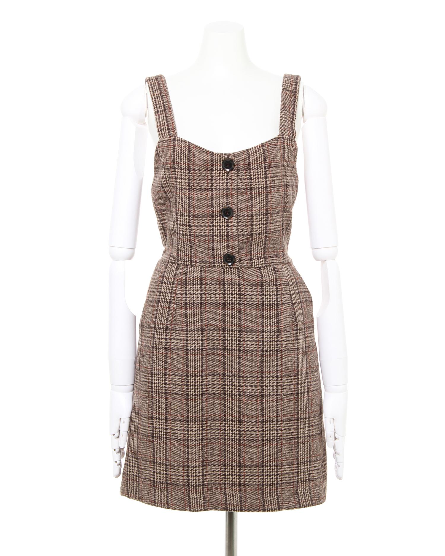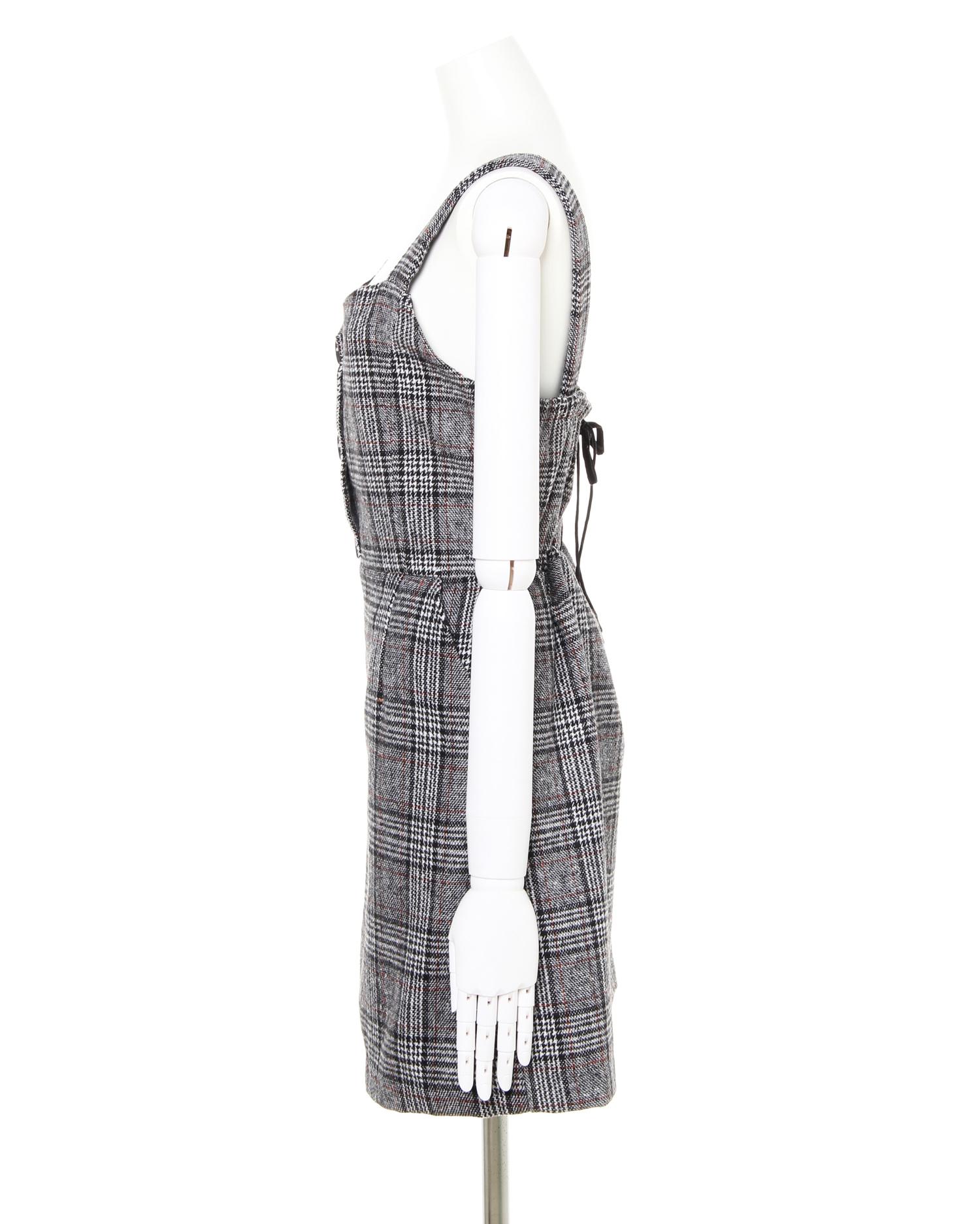 微起毛のあたたかみのある風合いとトラディショナルなチェック柄が特徴のジャンパースカートです。ビスチェ風のすっきりデザインで女性らしいコンパクトな上半身を演出。台形シルエットのスカートとの組み合わせで体型カバー効果も絶大です。背中部分のレースアップデザインでフェミニンな後ろ姿に。合わせるインナー次第で様々なスタイルが楽しめます。