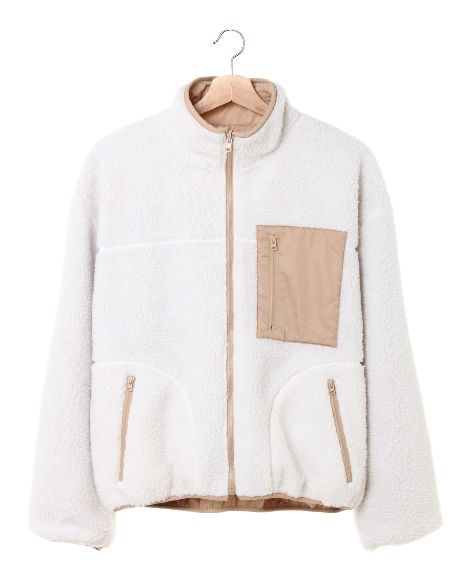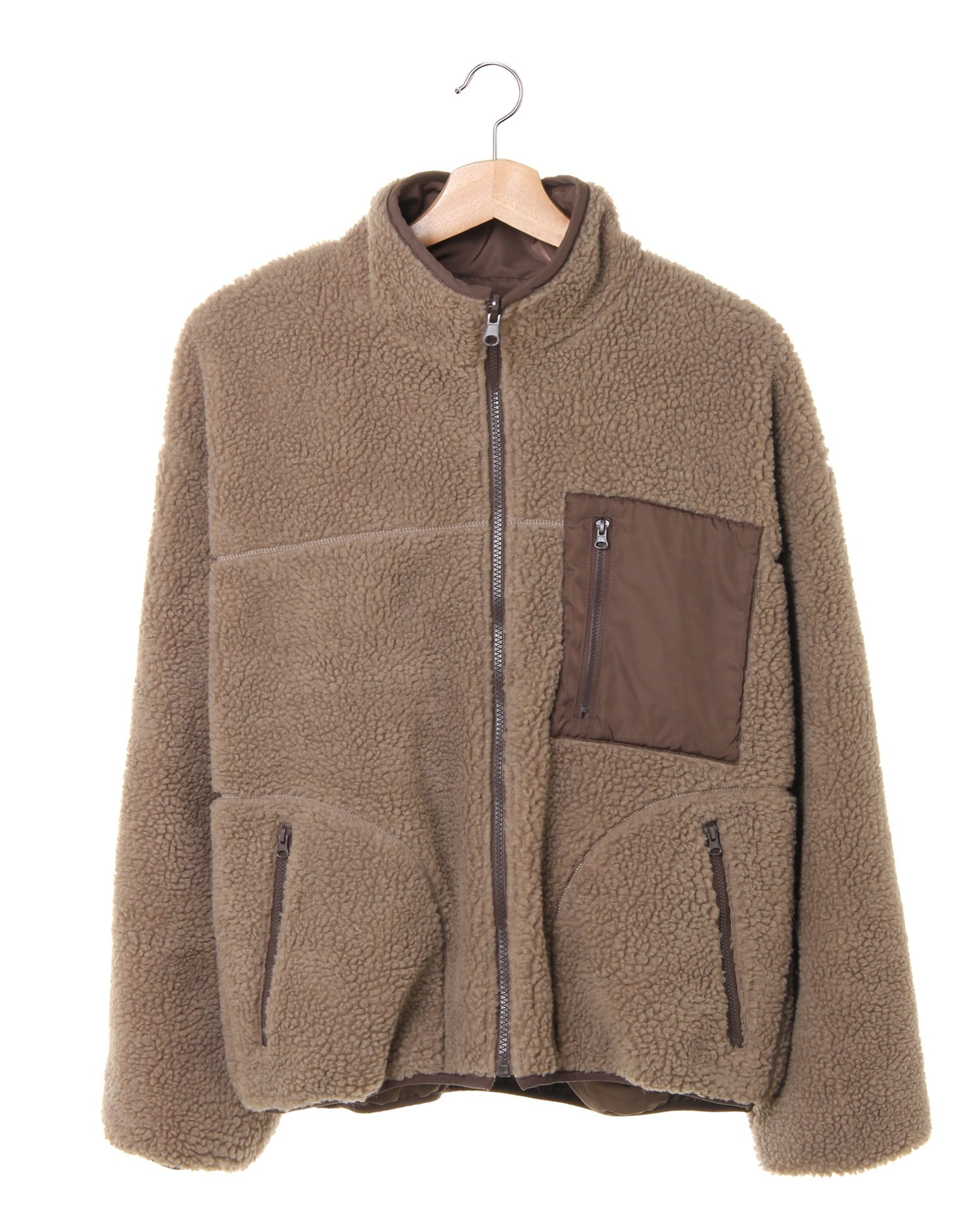 スポーティに着こなせるブルゾンはリバーシブルデザインで着まわし力抜群のアイテム。もこもこのボアにフロントのポケットがアクセントになっています。リバーシブル面は光沢のあるナイロン素材。スカートにもパンツにもバランス良く合わせられる1枚になっています。ハイネックで首元まであたたか。サイドには便利なポケット付き。