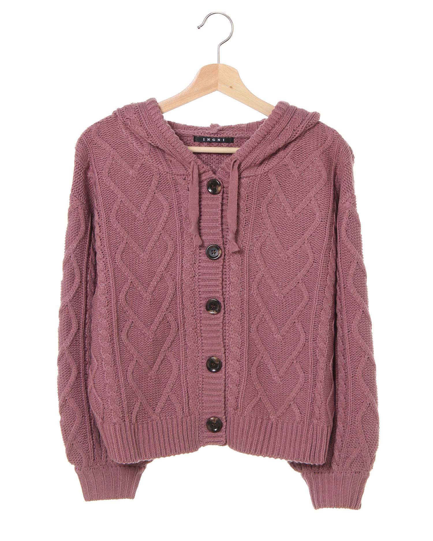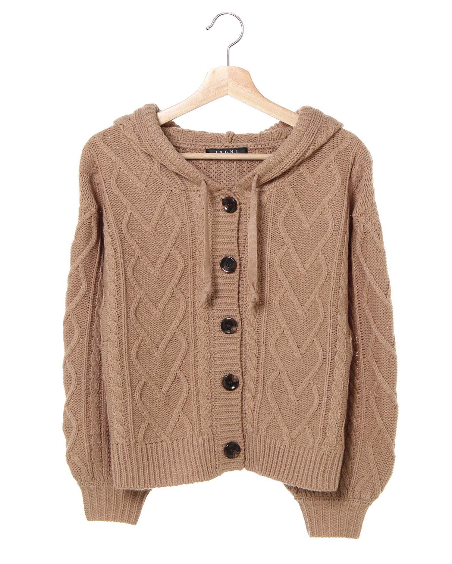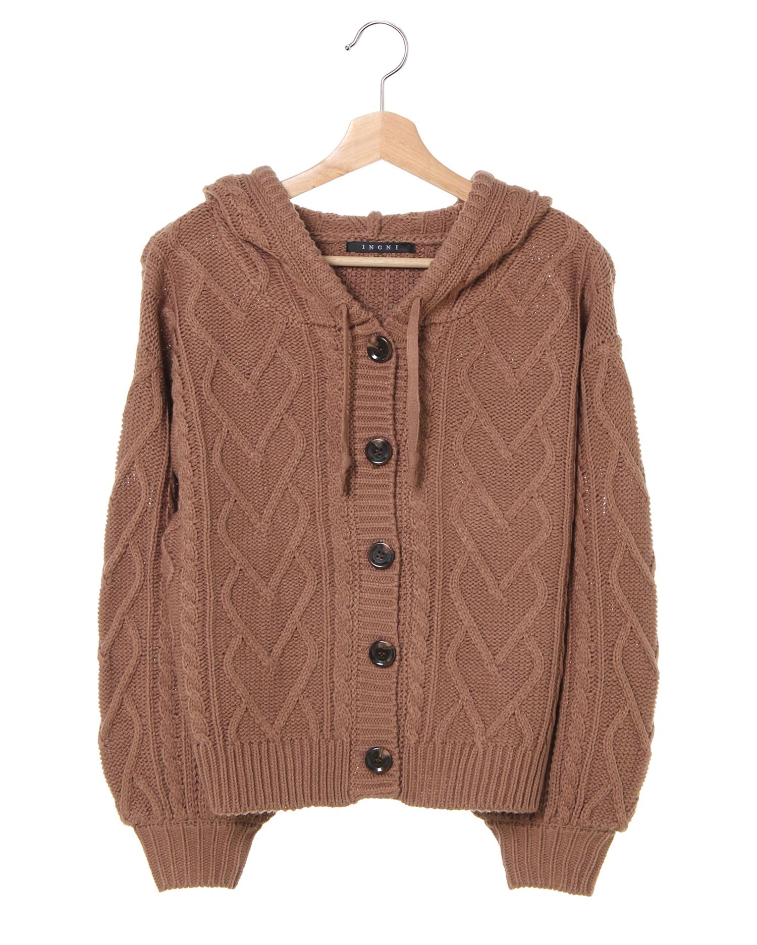 カジュアルスタイルにぴったりのショートカーデはフード付きデザインが新鮮。フロントボタンを閉じてトップス風に着こなしたり、羽織りとして着たりと1枚あると重宝するアイテムです。コロンと丸いフォルムの大きめボタンがアクセント。ショート丈なのでボリュームニットもバランスよく合わせられます。今年らしいアースカラーが揃っています。