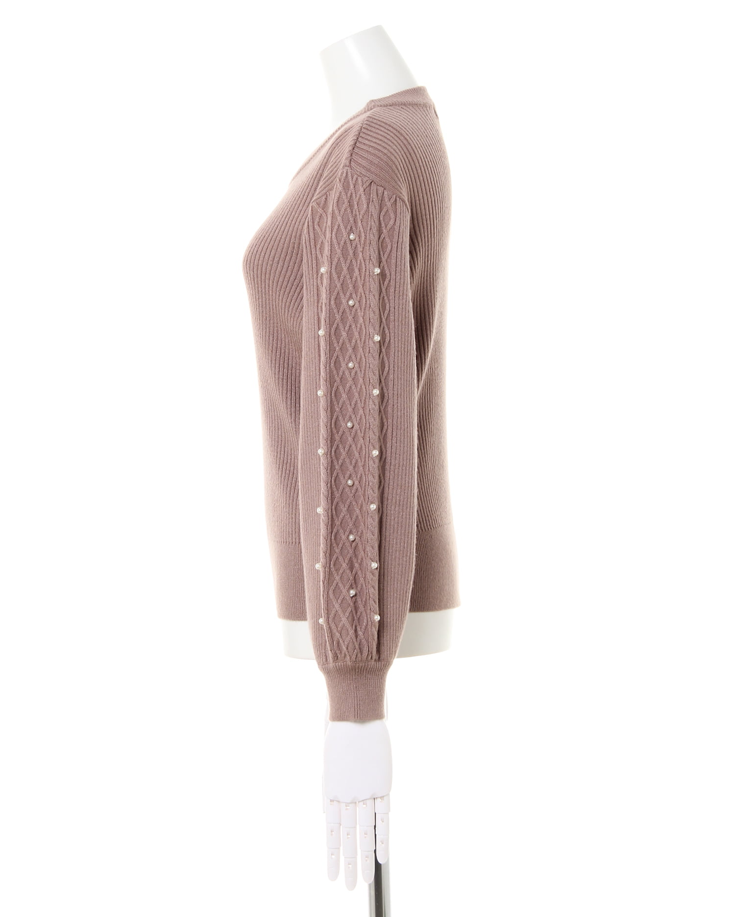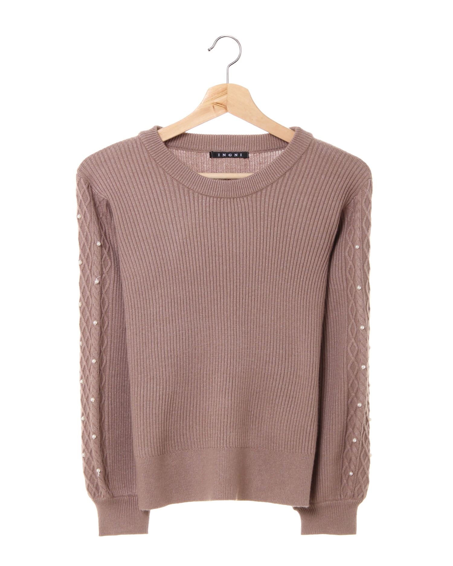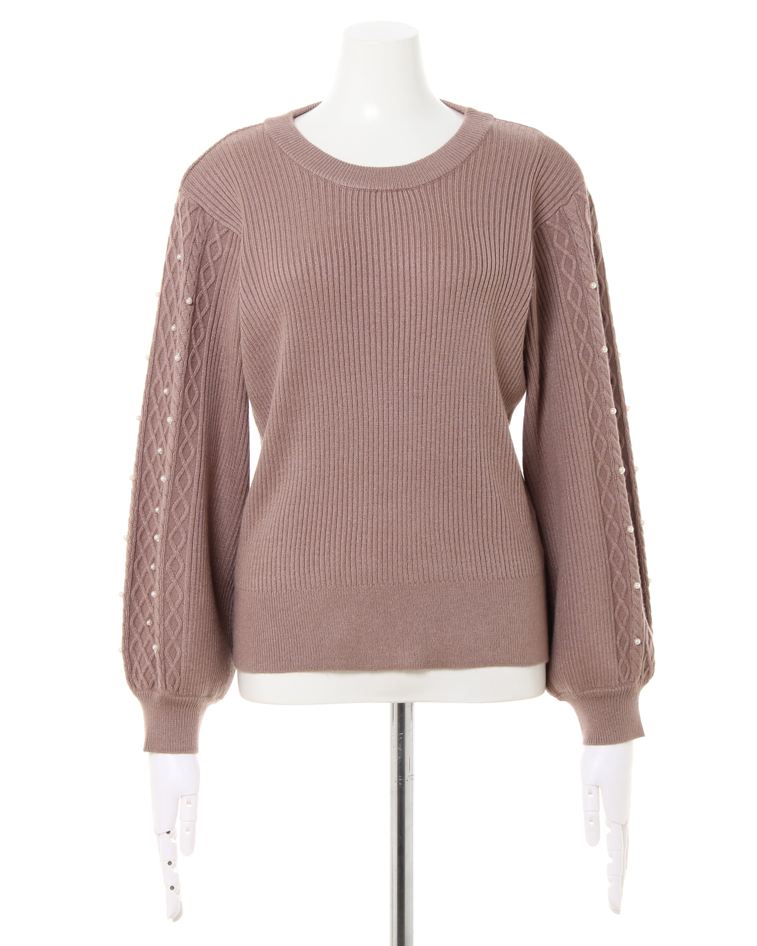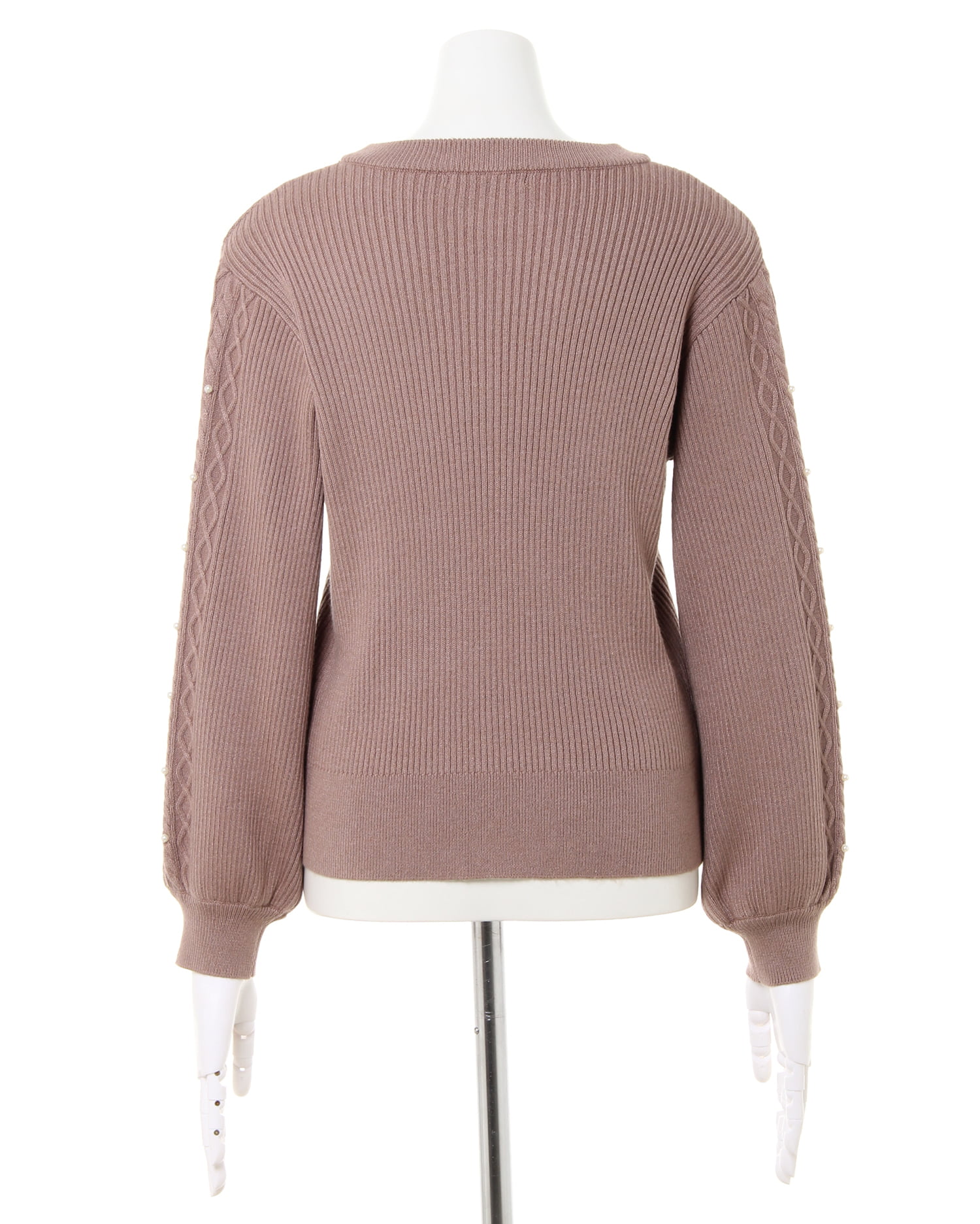 ベーシックなデザインのニットは袖のケーブル編みとパール装飾がリュクスなアクセントに。使い勝手のいいシンプルなニットはどんなボトムとも相性抜群です。ワンカラーながら編み方に変化を付けているので表情のある着こなしが完成。もっちり柔らかく肌触りもいいので快適な着心地です。レディな雰囲気があるのでスカートはもちろんパンツスタイルにもオススメ。