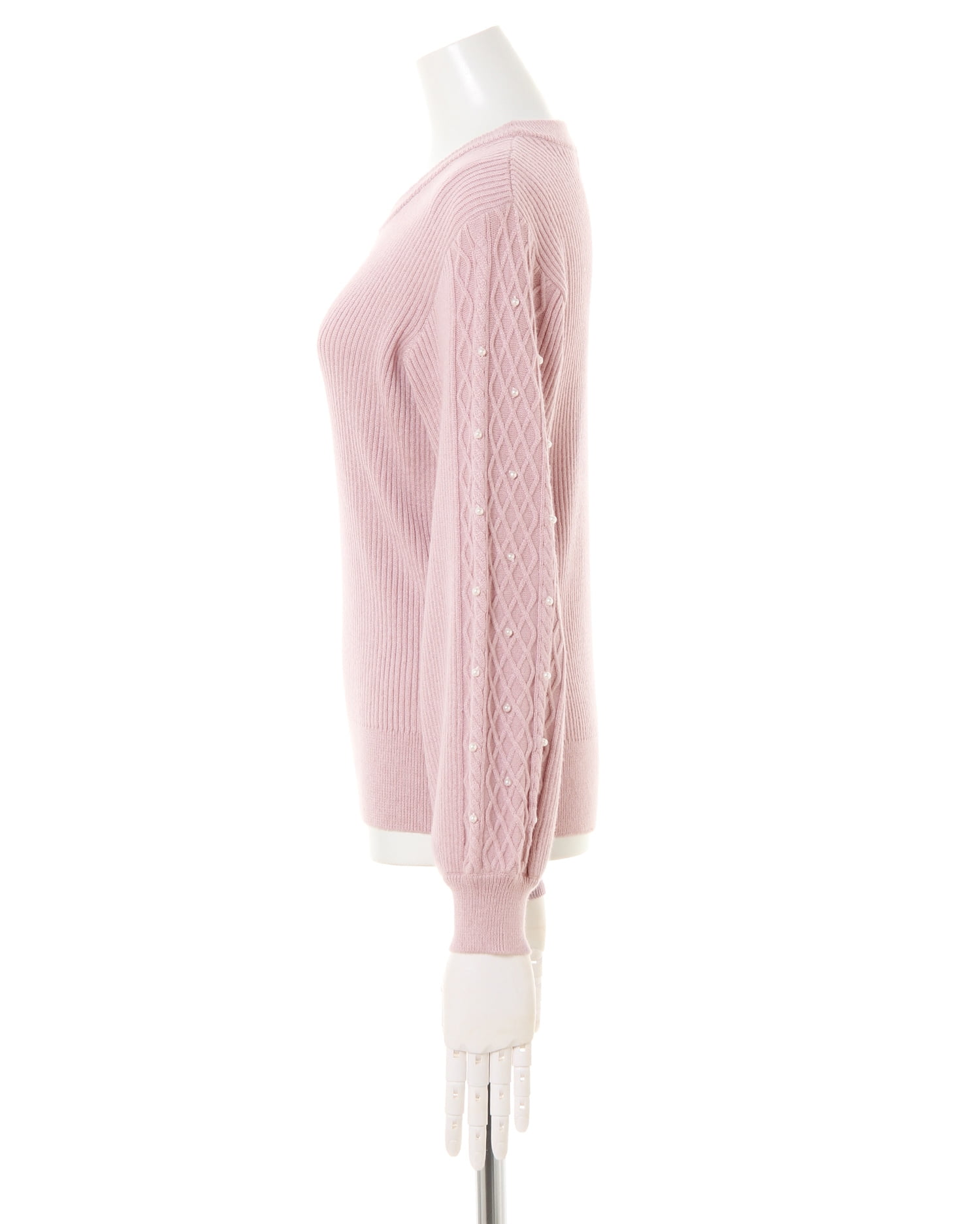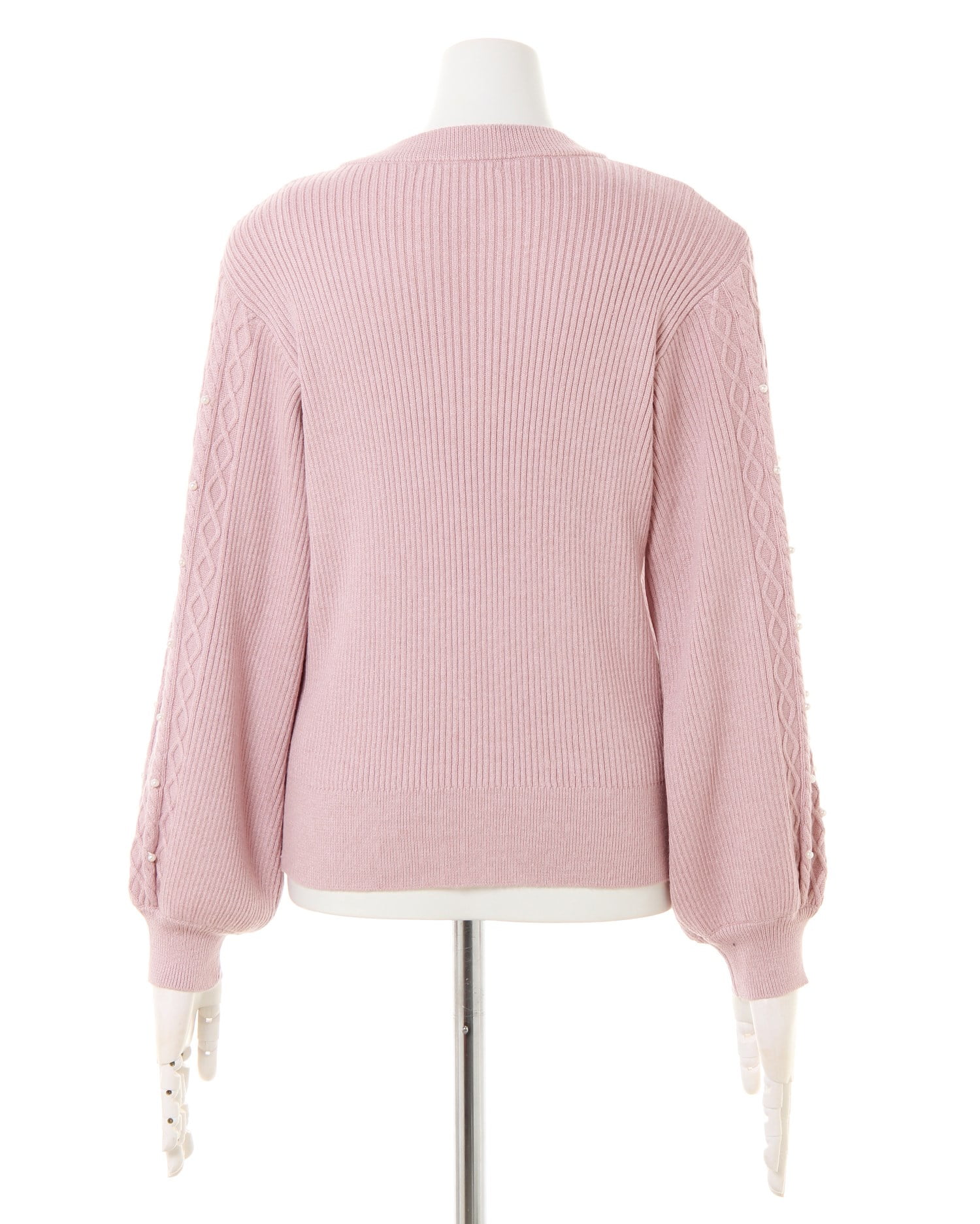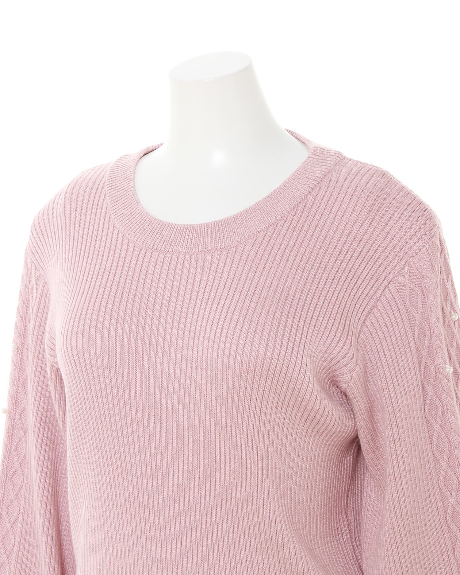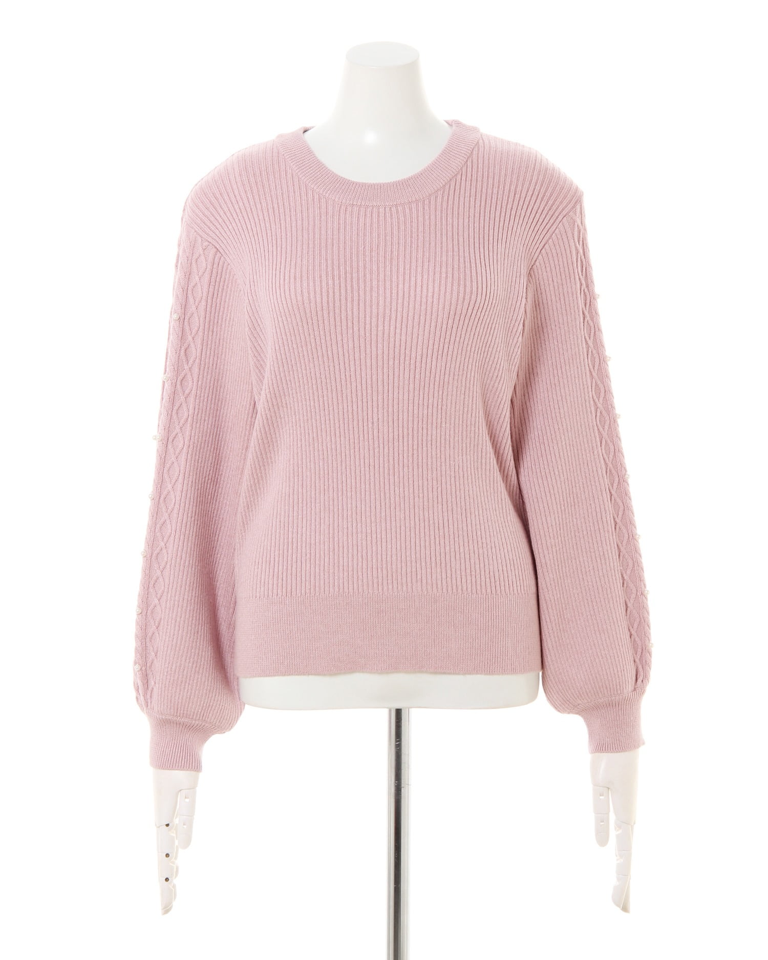 ベーシックなデザインのニットは袖のケーブル編みとパール装飾がリュクスなアクセントに。使い勝手のいいシンプルなニットはどんなボトムとも相性抜群です。ワンカラーながら編み方に変化を付けているので表情のある着こなしが完成。もっちり柔らかく肌触りもいいので快適な着心地です。レディな雰囲気があるのでスカートはもちろんパンツスタイルにもオススメ。