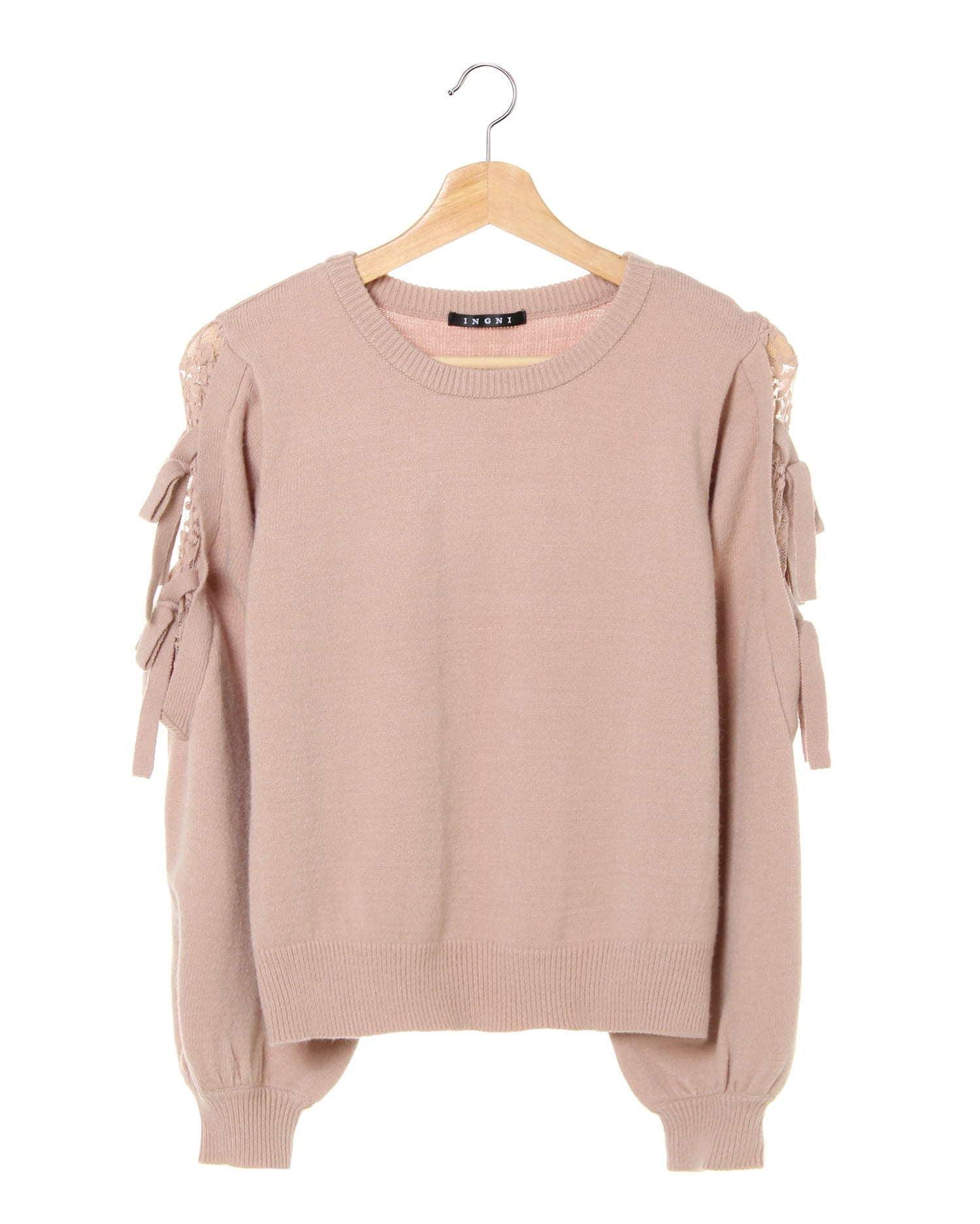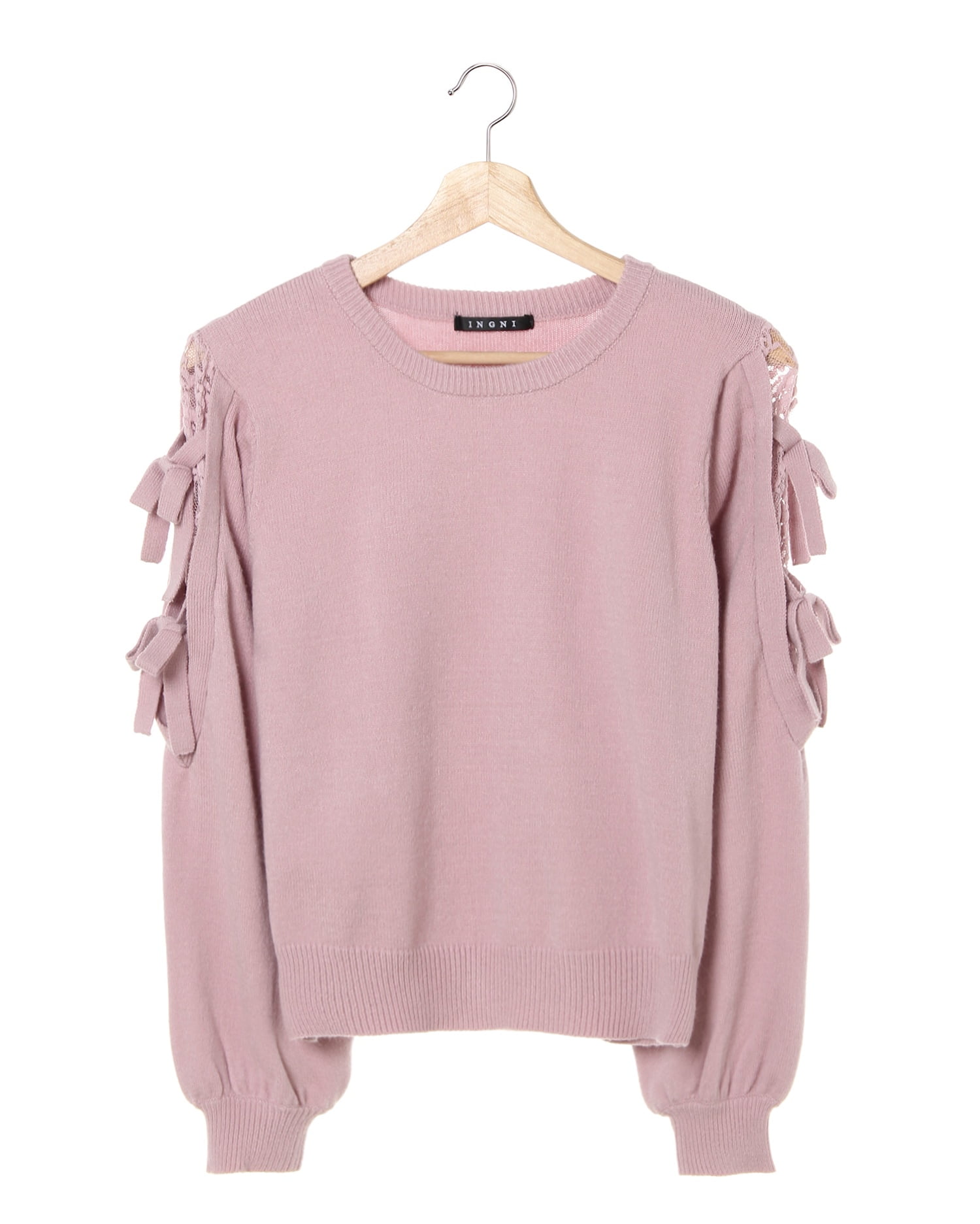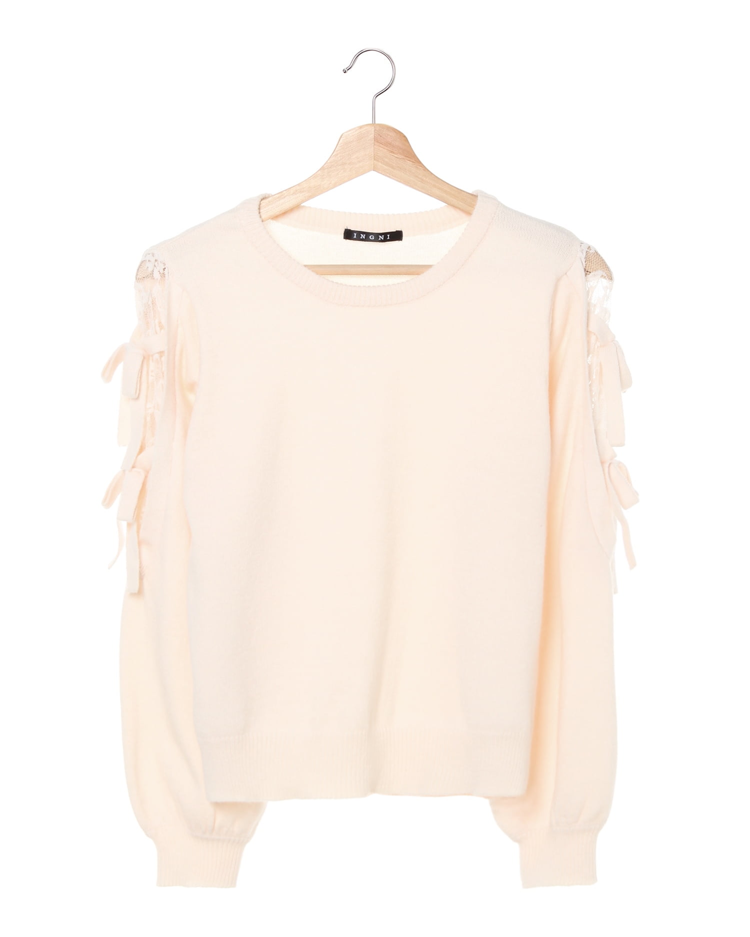 清楚な雰囲気のニットスタイルを楽しめるガーリーなトップスが届きました。繊細なレースとリボンの組み合わせでデザイン性のある袖が印象的。ほんのり透ける肌が女性らしく華やかな雰囲気に導きます。ベーシックシルエットなのでスカートはもちろんパンツスタイルとも相性抜群。程よい厚みのニットはコートやジャケットのインナーとしても重宝します。