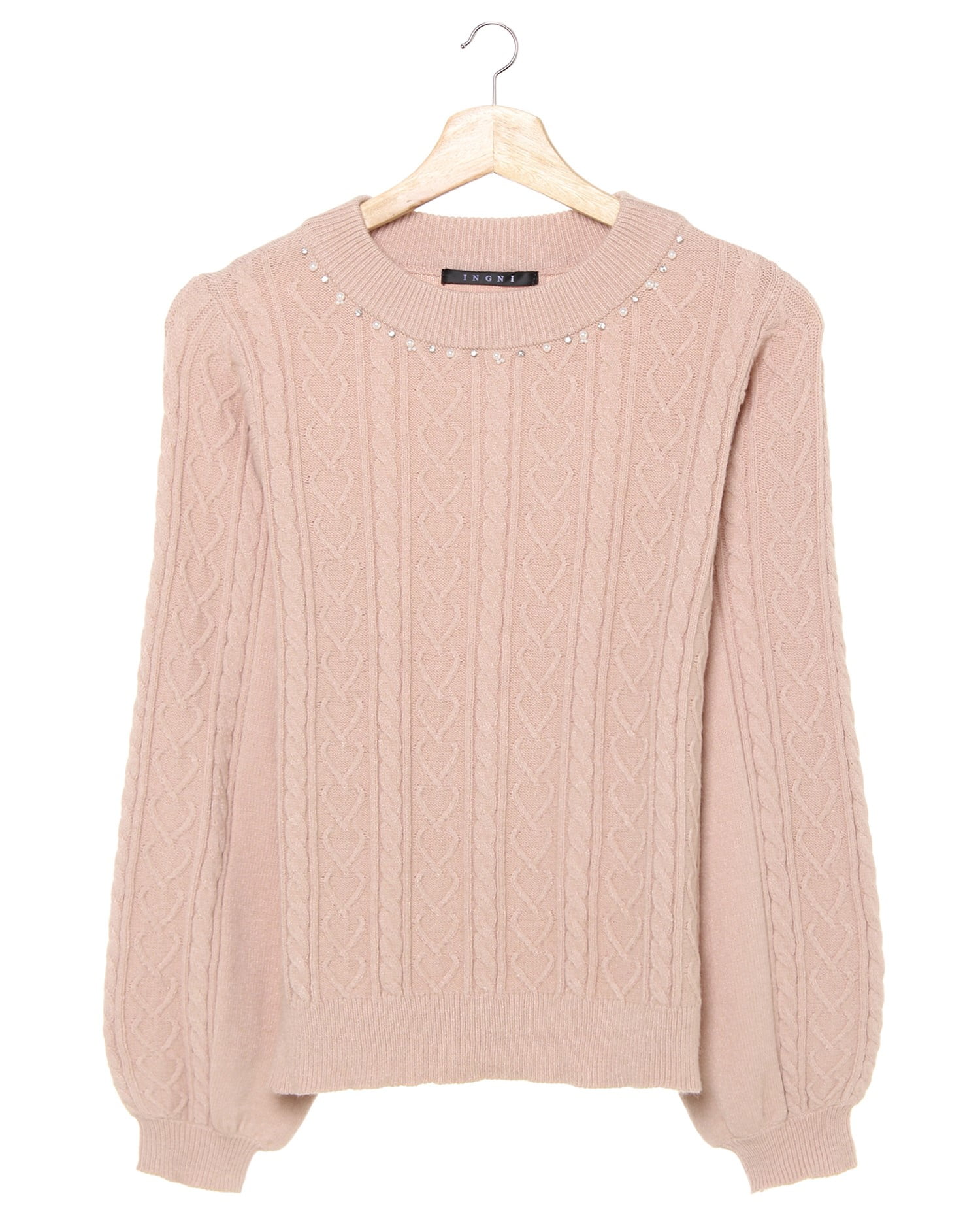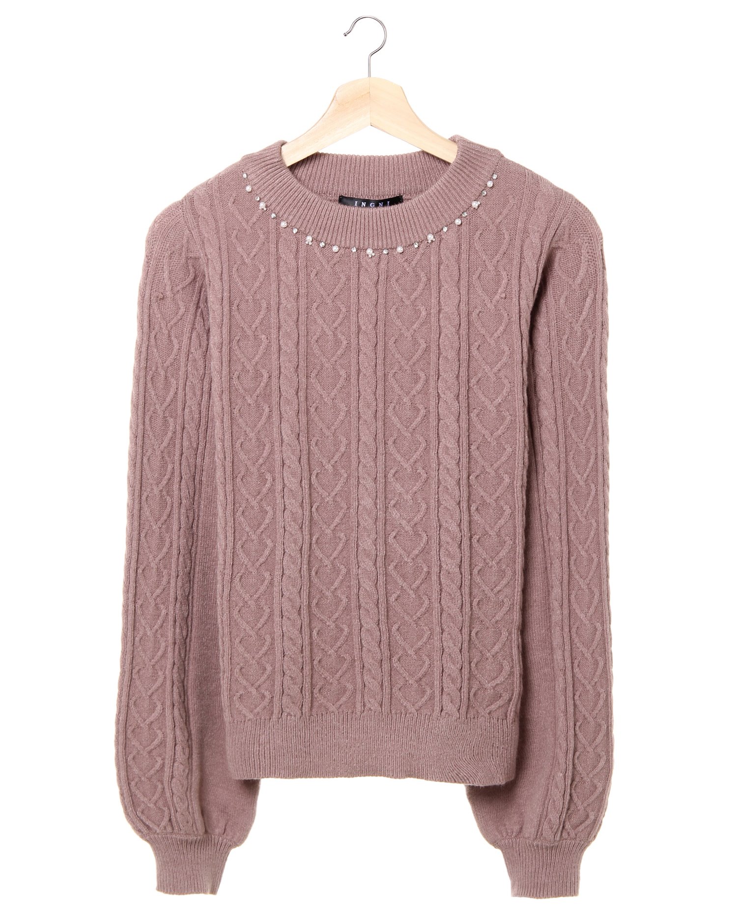控えめなケーブル編みとハートの編地で大人ガーリーなニットスタイルが完成するプルオーバー。ワンカラーながら編地の変化で表情豊かな着こなしが楽しめます。ちょっぴり詰まり気味のネックラインにはアクセ要らずで顔周りを華やかに映してくれるビジュー装飾がポイント。カジュアル過ぎず着られてオンオフ問わず着回せます。もっちり柔らかい質感で着心地がいいのも魅力。