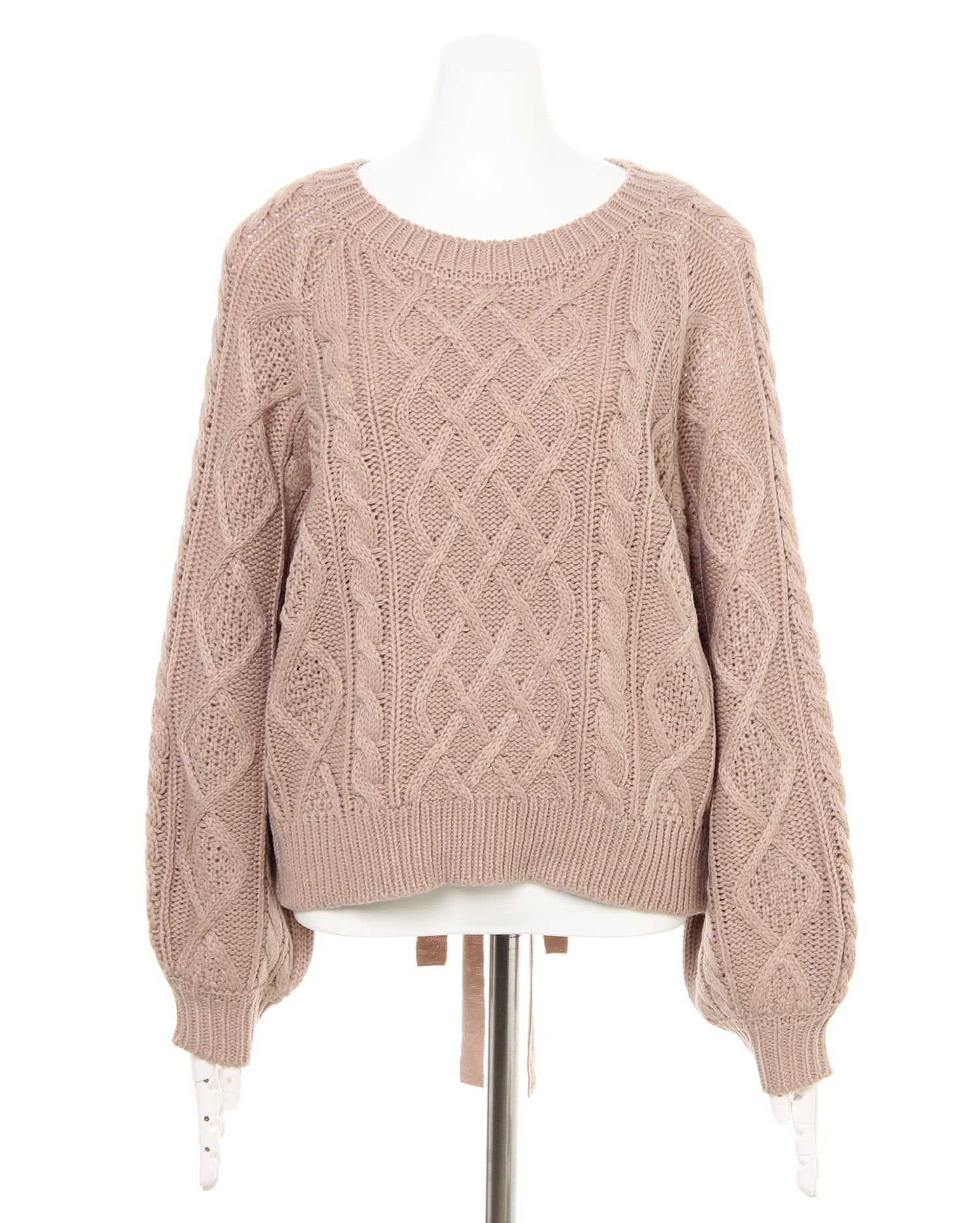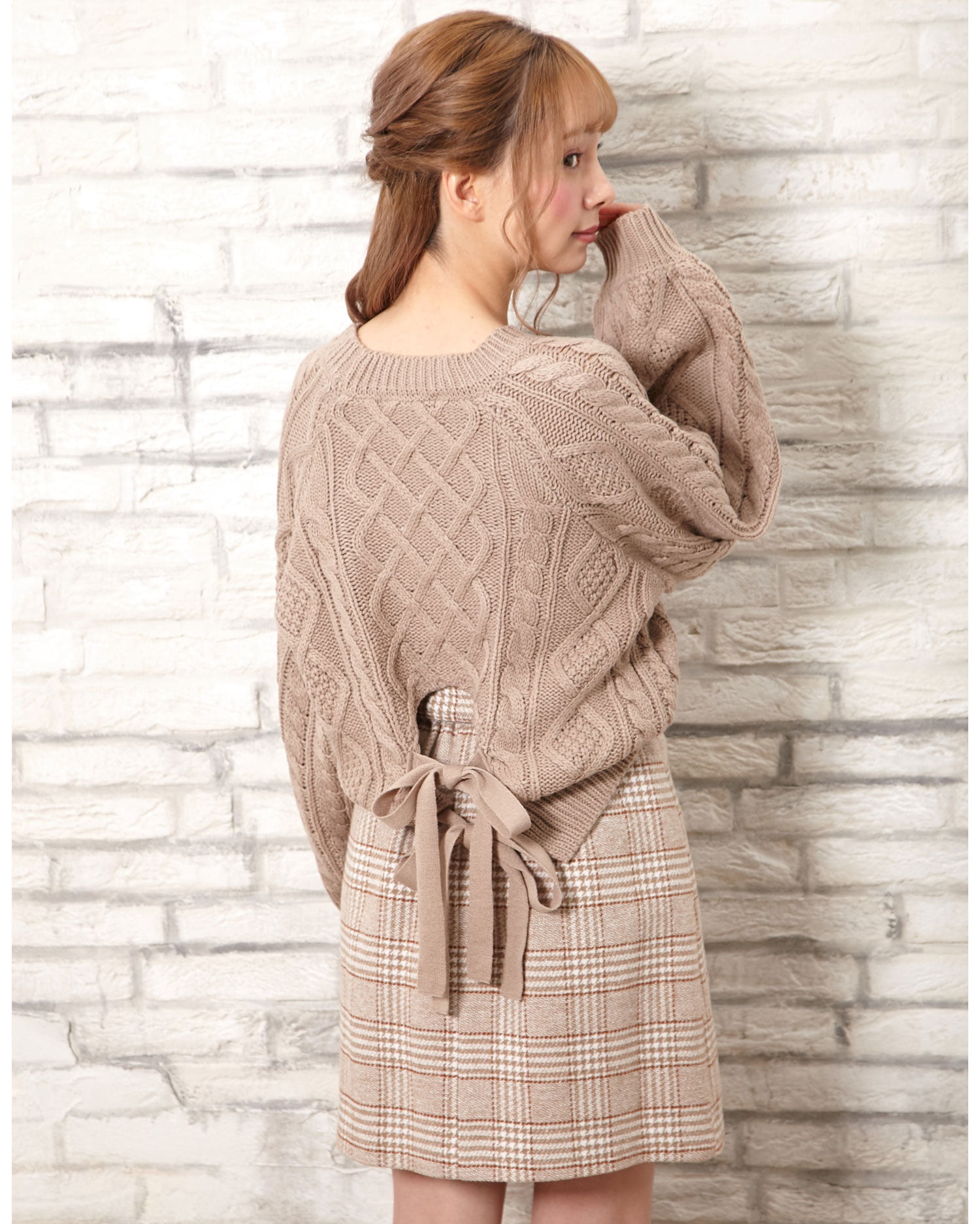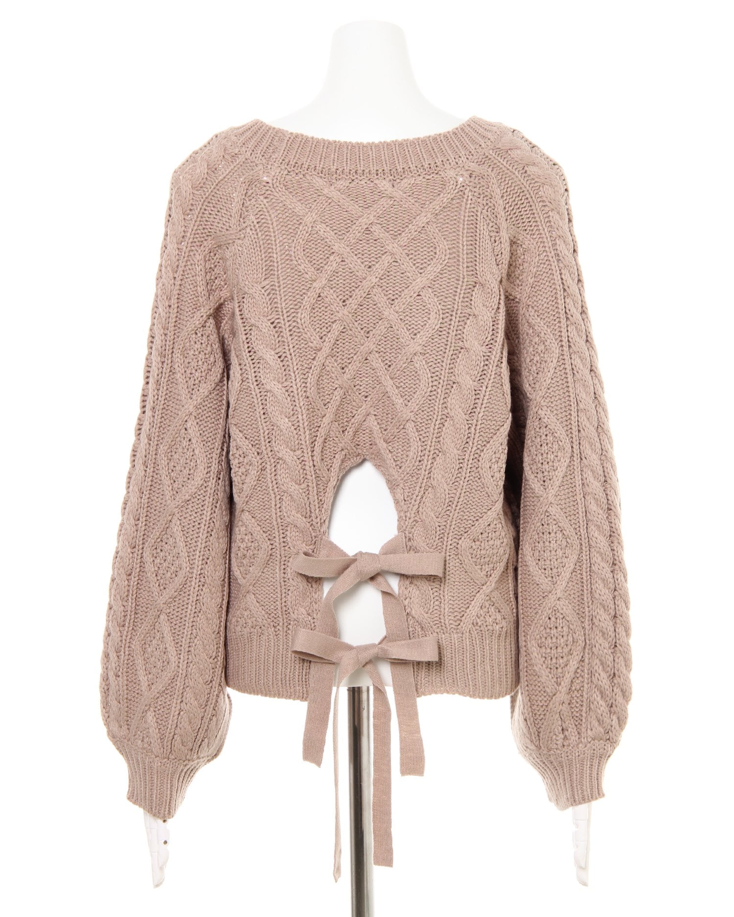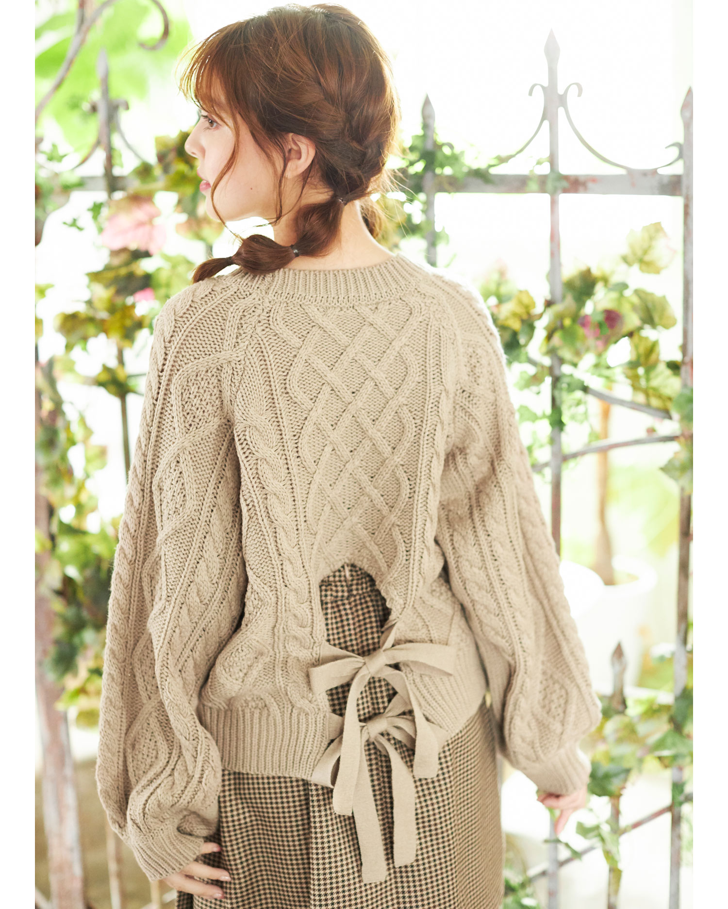 腰部分の大胆なカットとリボンの組み合わせで後姿も抜かりないニットトップスです。ケーブル編みの編み方に変化をつけた表情豊かなデザインで存在感のある着こなしに導きます。ベーシックなサイズ感でどんなボトムともバランスよく合わせられるのも嬉しい。ボリュームを付けたスリーブにも注目です。女性らしさ漂うニュアンスカラーを揃えました。