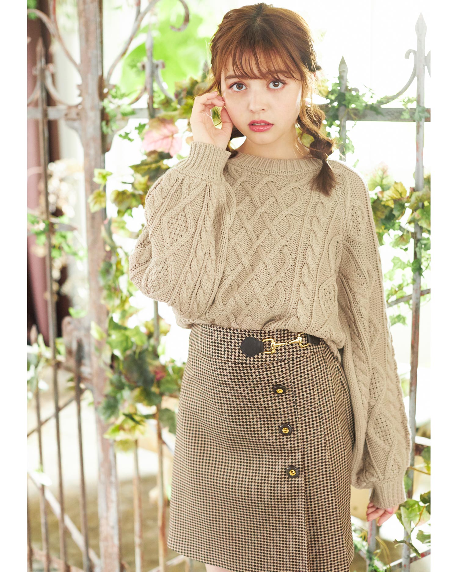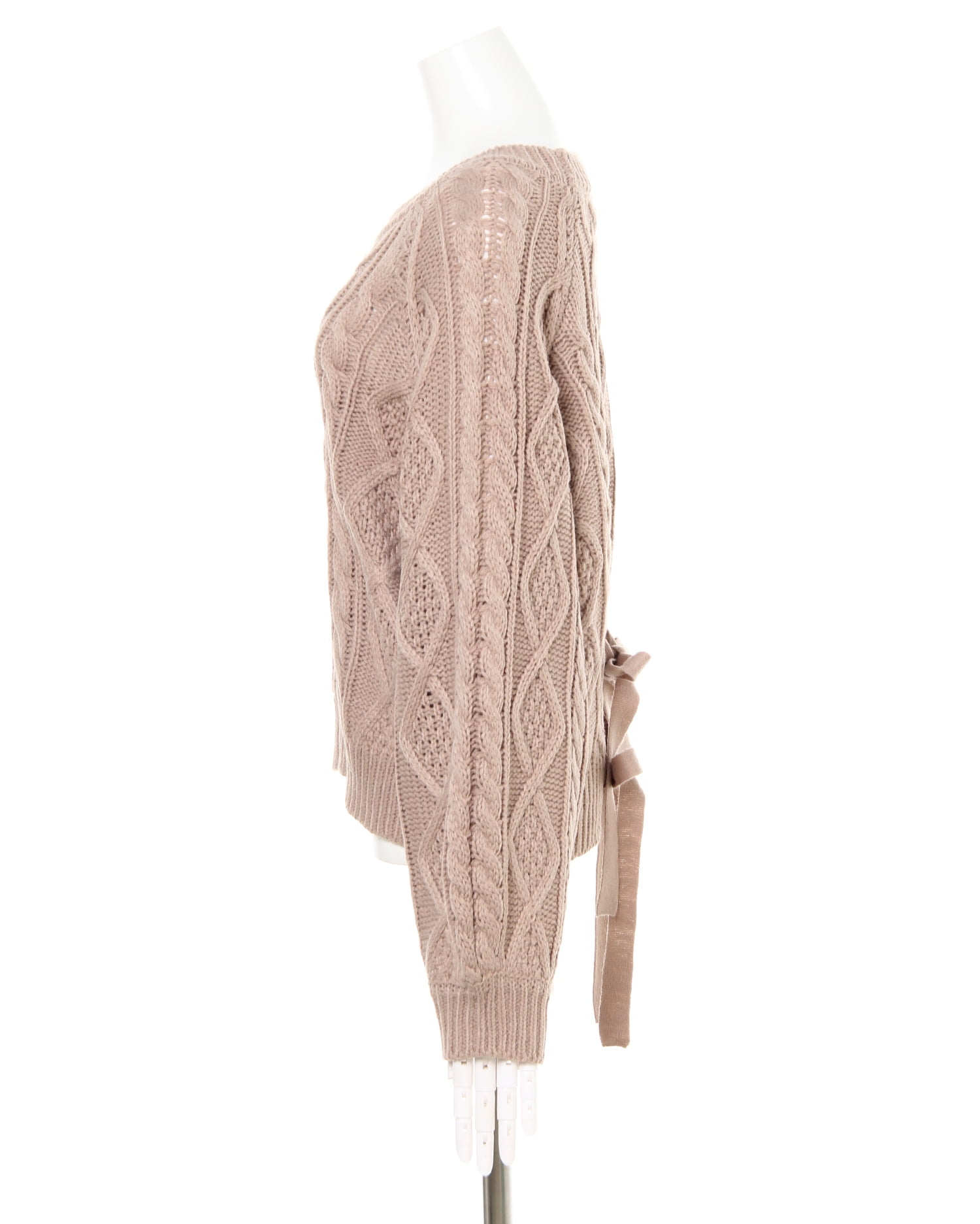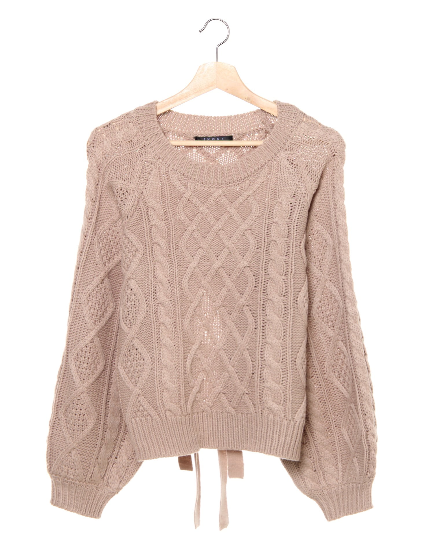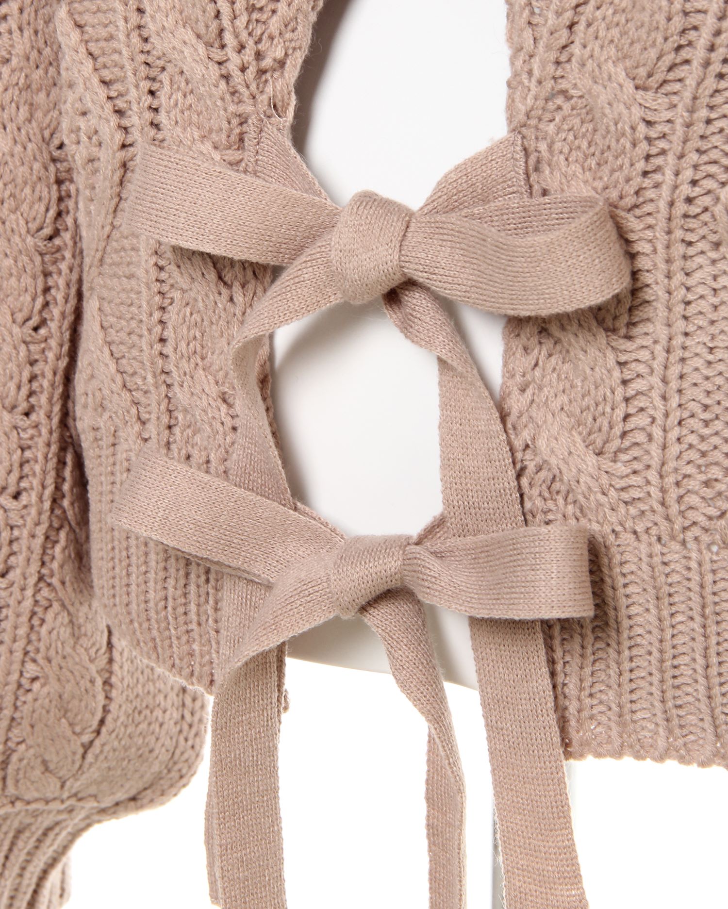 腰部分の大胆なカットとリボンの組み合わせで後姿も抜かりないニットトップスです。ケーブル編みの編み方に変化をつけた表情豊かなデザインで存在感のある着こなしに導きます。ベーシックなサイズ感でどんなボトムともバランスよく合わせられるのも嬉しい。ボリュームを付けたスリーブにも注目です。女性らしさ漂うニュアンスカラーを揃えました。