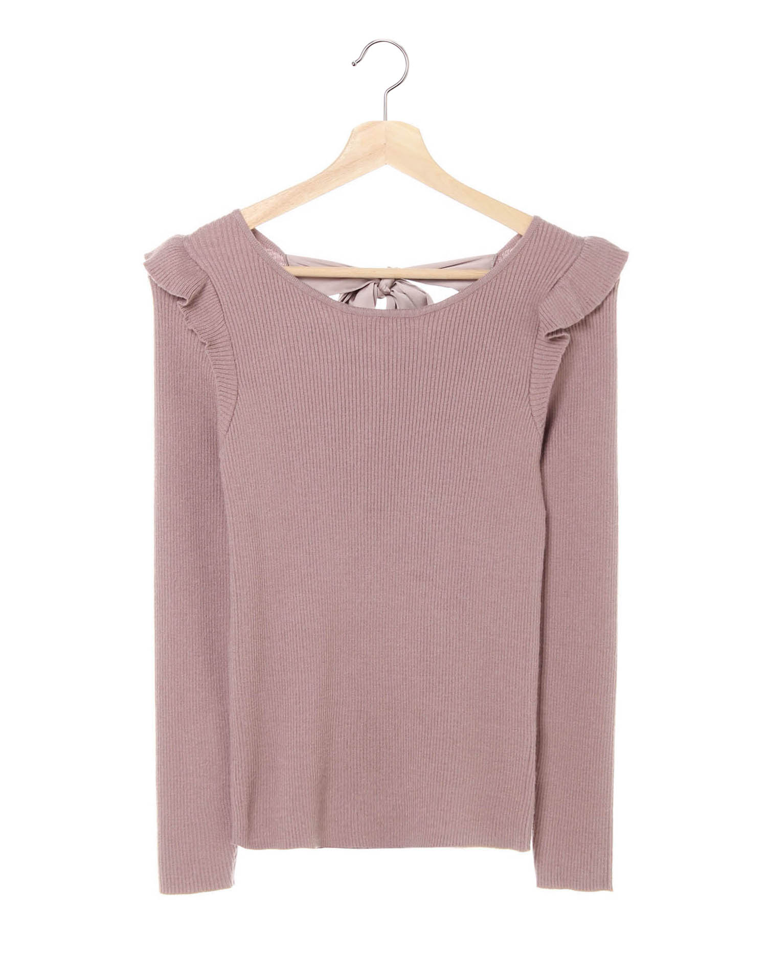 ベーシックなリブニットをショルダー部分にフリルをあしらってフェミニンに。ボディラインに沿うシルエットは上半身をコンパクトに見せ、スタイルアップも狙えます。程よい厚みと裾丈は人気のトップスインスタイルも◎。ベーシックなワンカラーに後ろの大きなリボンがアクセントになっています。伸びの良い柔らかなニットはちくちくしにくく普段使いにぴったり。