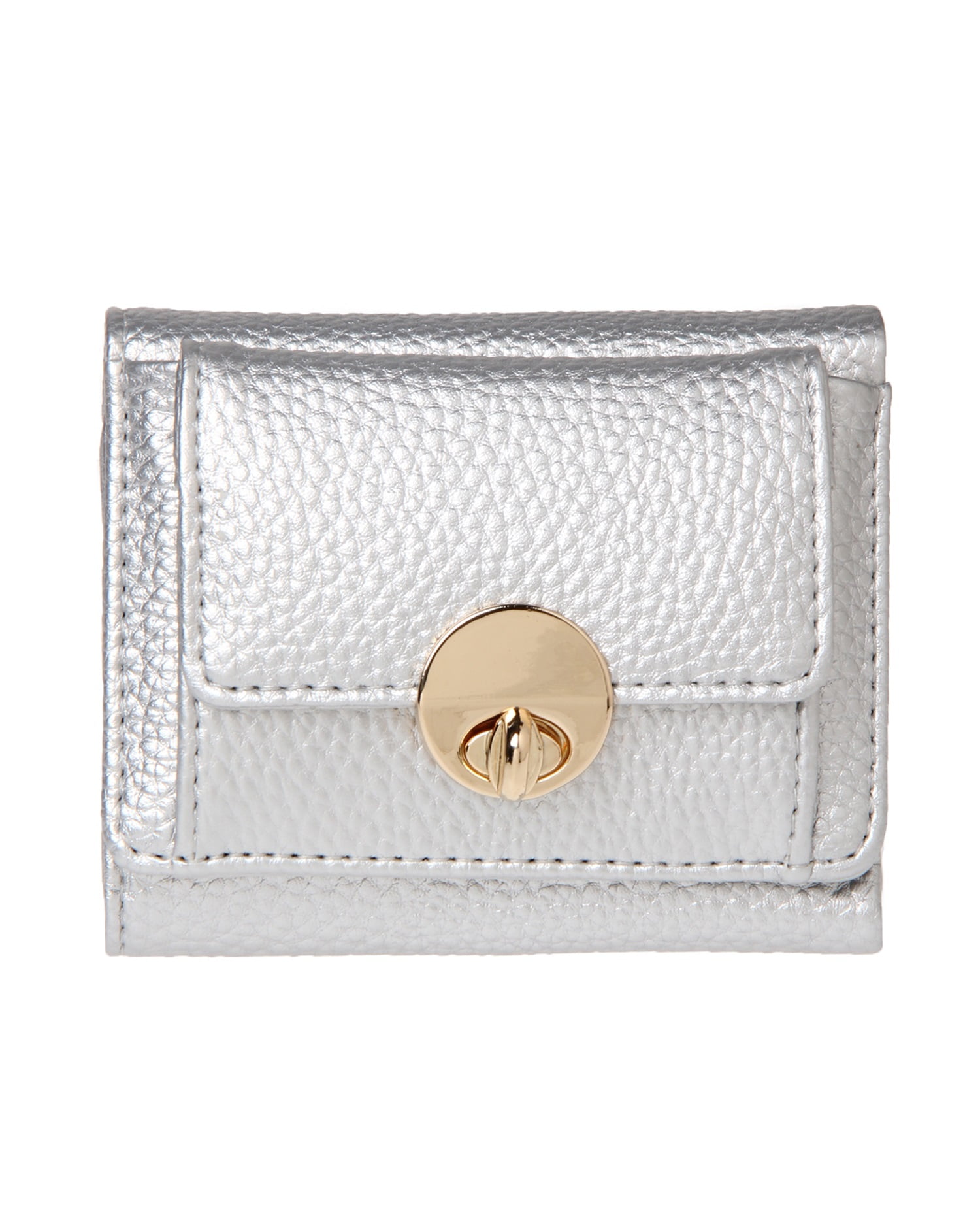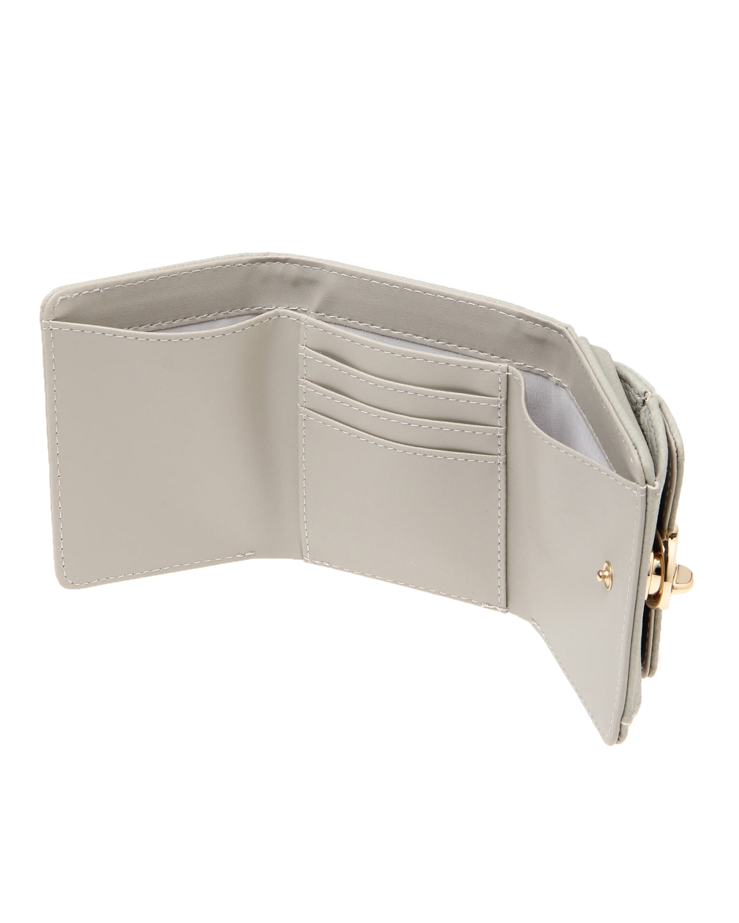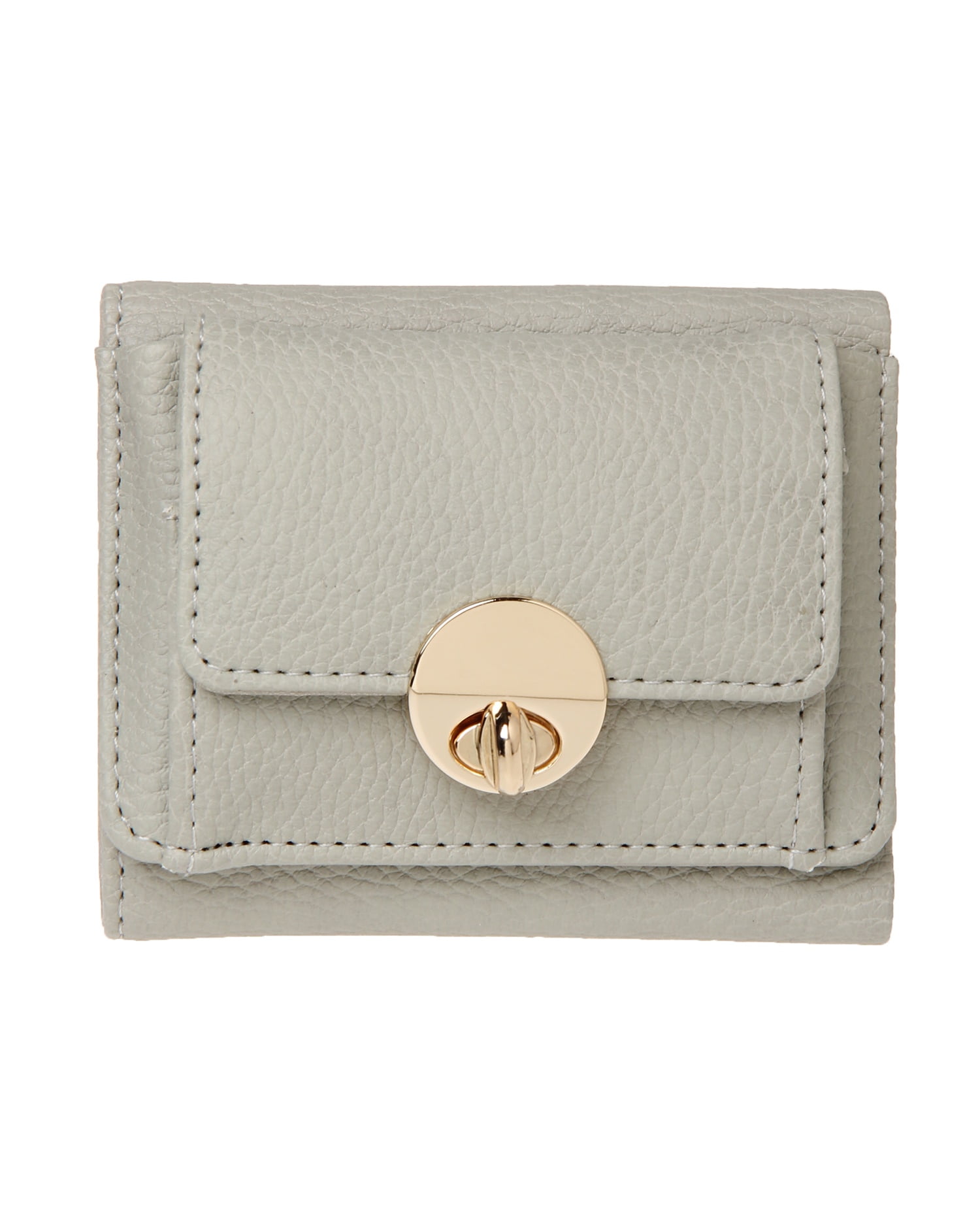 しっくりと手に馴染む表面感のある素材にゴールドの金具使いがリュクスな雰囲気の3つ折りミニウォレットです。どんなスタイルにも合わせやすいベーシックなデザインも◎。コンパクトな見た目ながらもお札と小銭、カードをしっかりと収納でき機能性も抜群です。トレンドのミニバックにはもちろん、ポケットにも収まるのでちょっとしたお出かけにも便利。お手入れが楽チンな柔らかいフェイクレザーも魅力です。