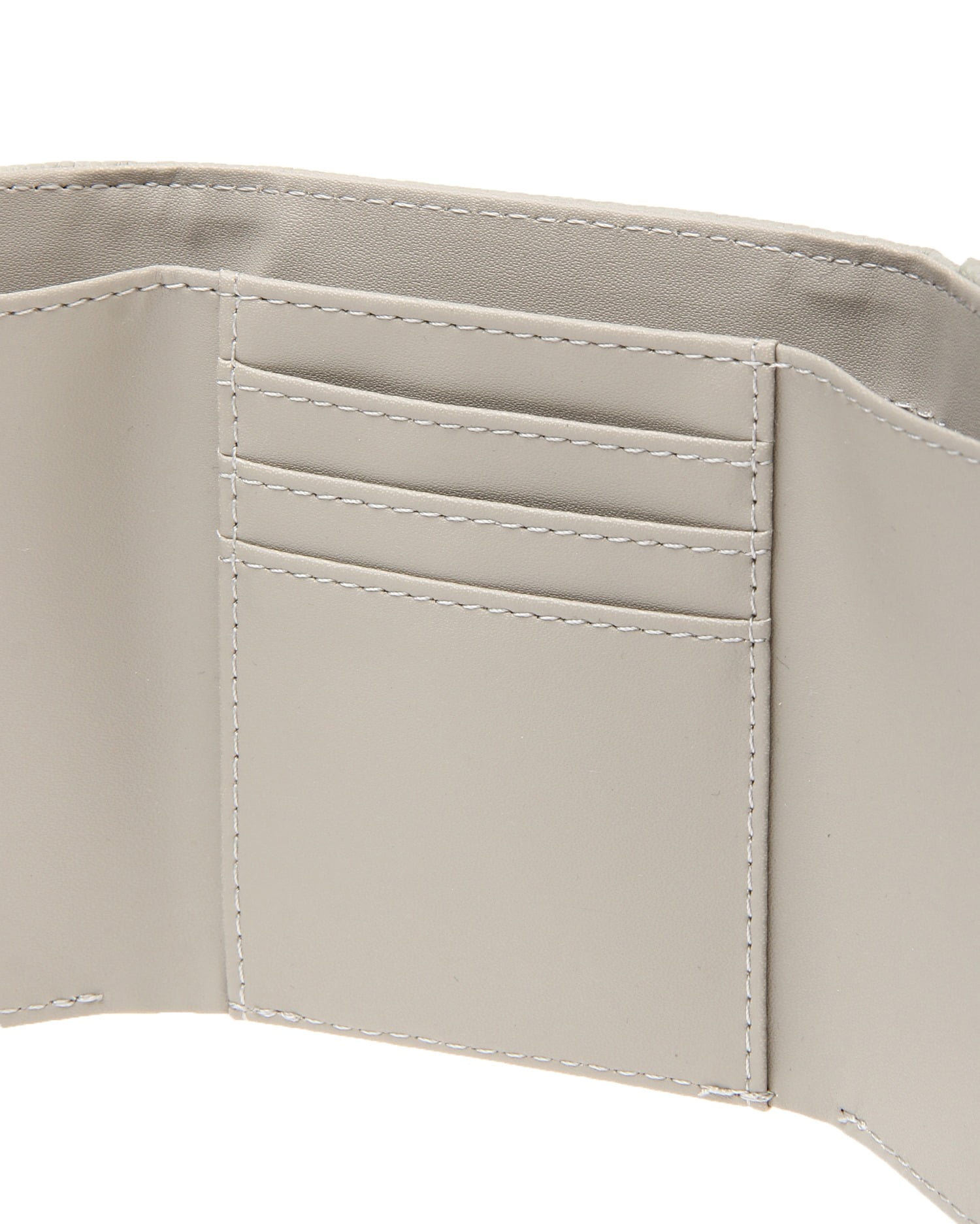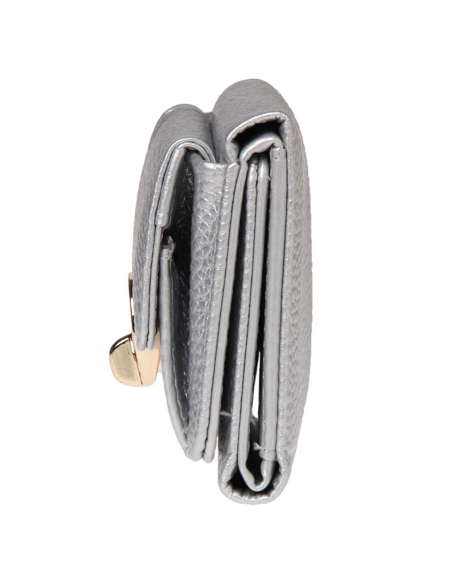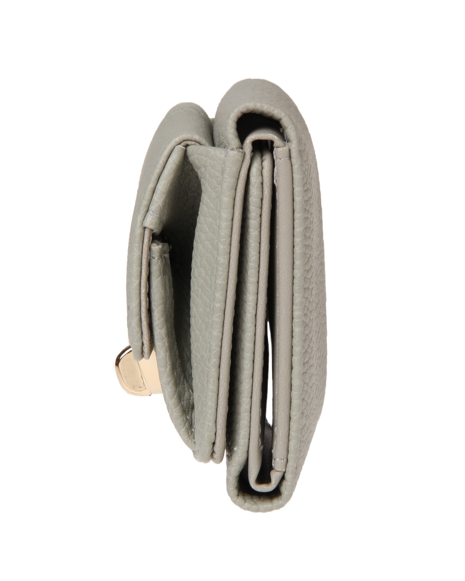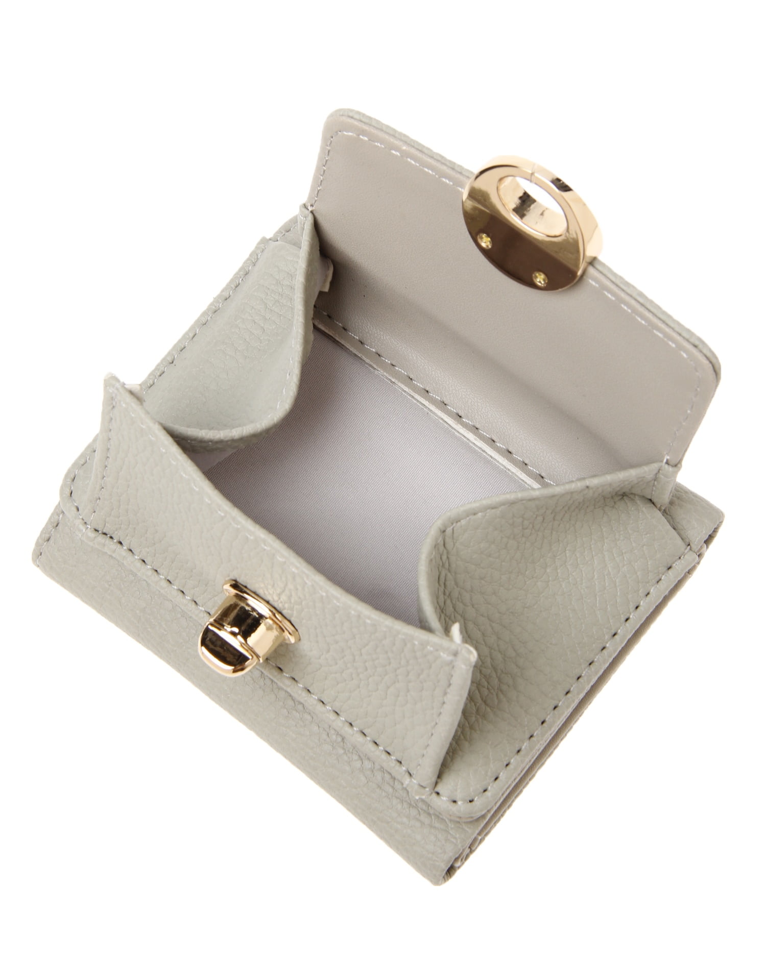 しっくりと手に馴染む表面感のある素材にゴールドの金具使いがリュクスな雰囲気の3つ折りミニウォレットです。どんなスタイルにも合わせやすいベーシックなデザインも◎。コンパクトな見た目ながらもお札と小銭、カードをしっかりと収納でき機能性も抜群です。トレンドのミニバックにはもちろん、ポケットにも収まるのでちょっとしたお出かけにも便利。お手入れが楽チンな柔らかいフェイクレザーも魅力です。