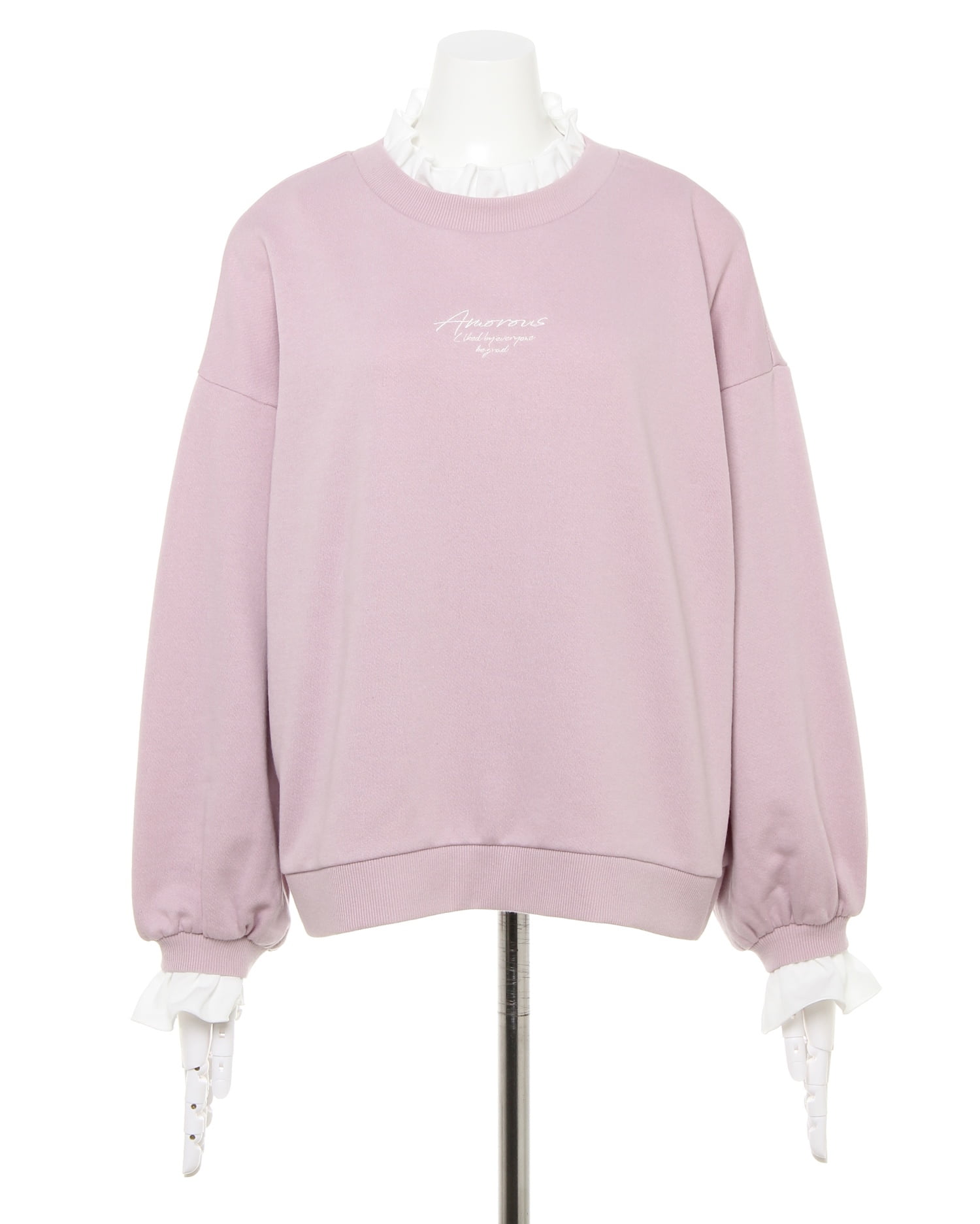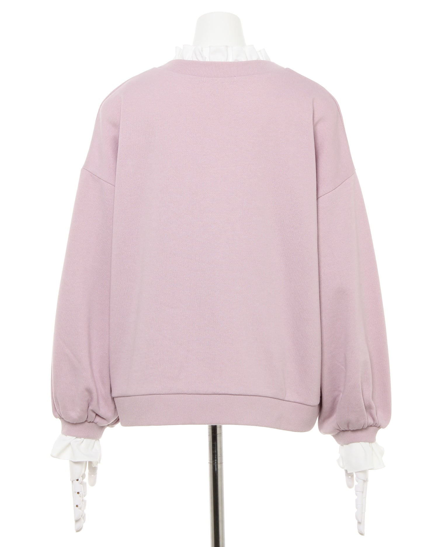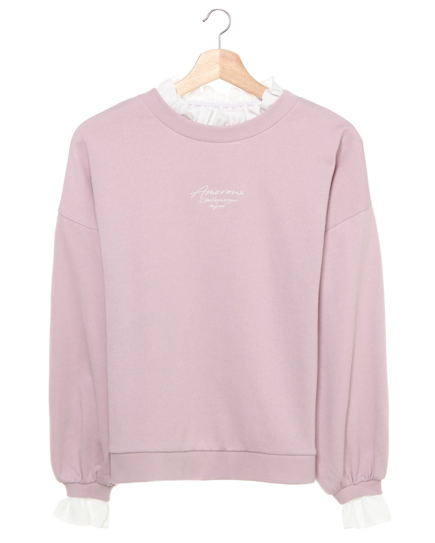 きれいめスタイルにも重宝する着心地の良いスウェットトップス。ゆったりとした身頃で今年らしいシルエットの着こなしが楽しめる1枚です。首元や袖口のフリルやキレイカラーで女性らしいフェミニンな雰囲気をプラス。レイヤード風デザインが技ありです。胸元の流れるようなレタード使いが大人っぽい印象。やや薄手の裏毛素材は季節の変わり目にも活躍するので揃えておくと便利です。