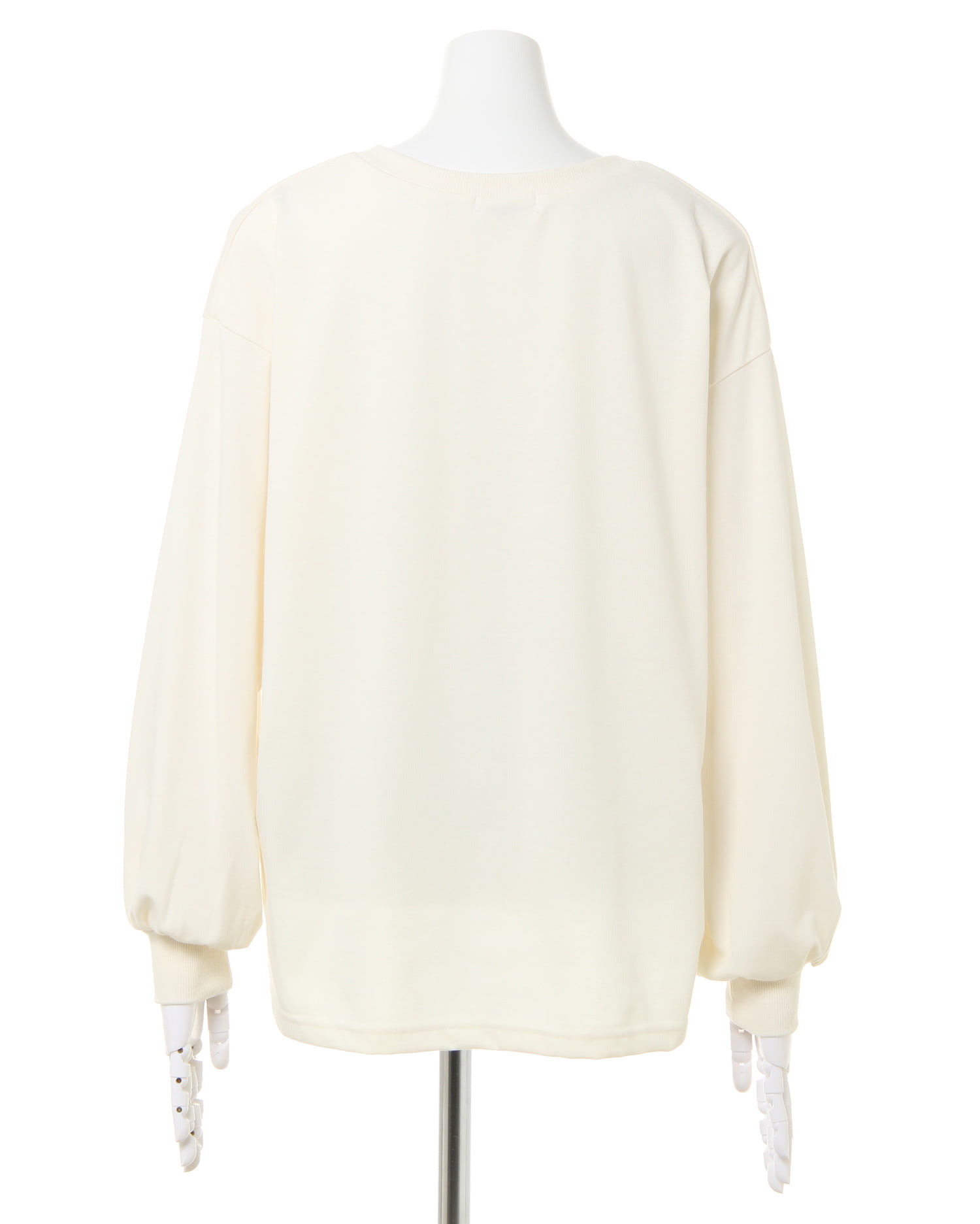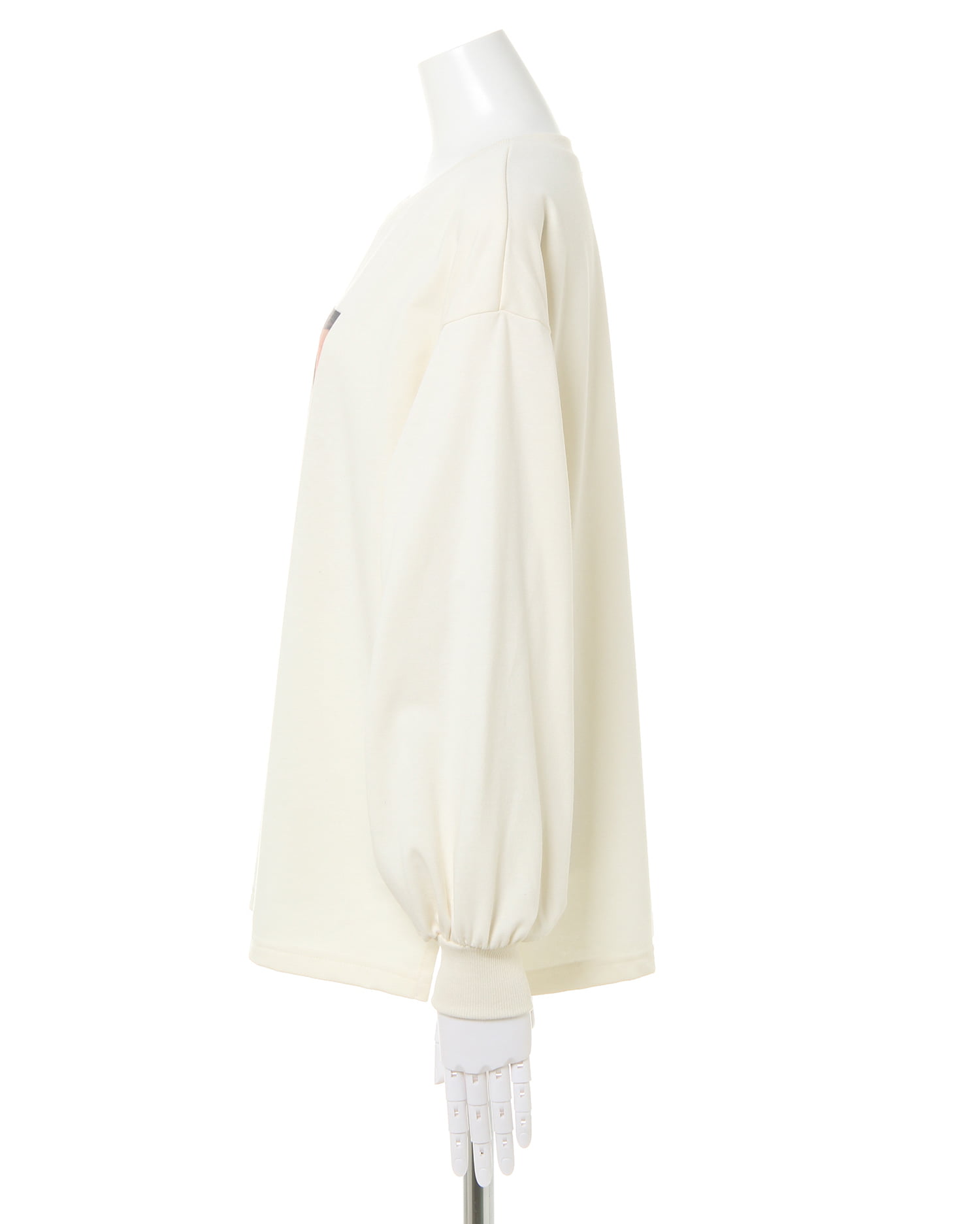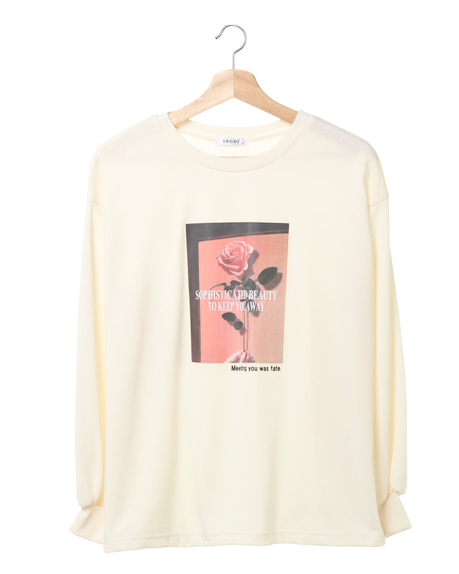 一輪のバラを手にしたノスタルジックなフォトプリントが印象的なロングスリーブのプルオーバー。トレンドのビッグシルエットでリラックスした着心地になっています。薄手の裏毛素材はインナーを合わせたり、トップスインももたつかず着回し力抜群。ふんわりスリーブでキュートな雰囲気をプラス。裾にはスリット入りで、長めシルエットもすっきりと着こなせます。