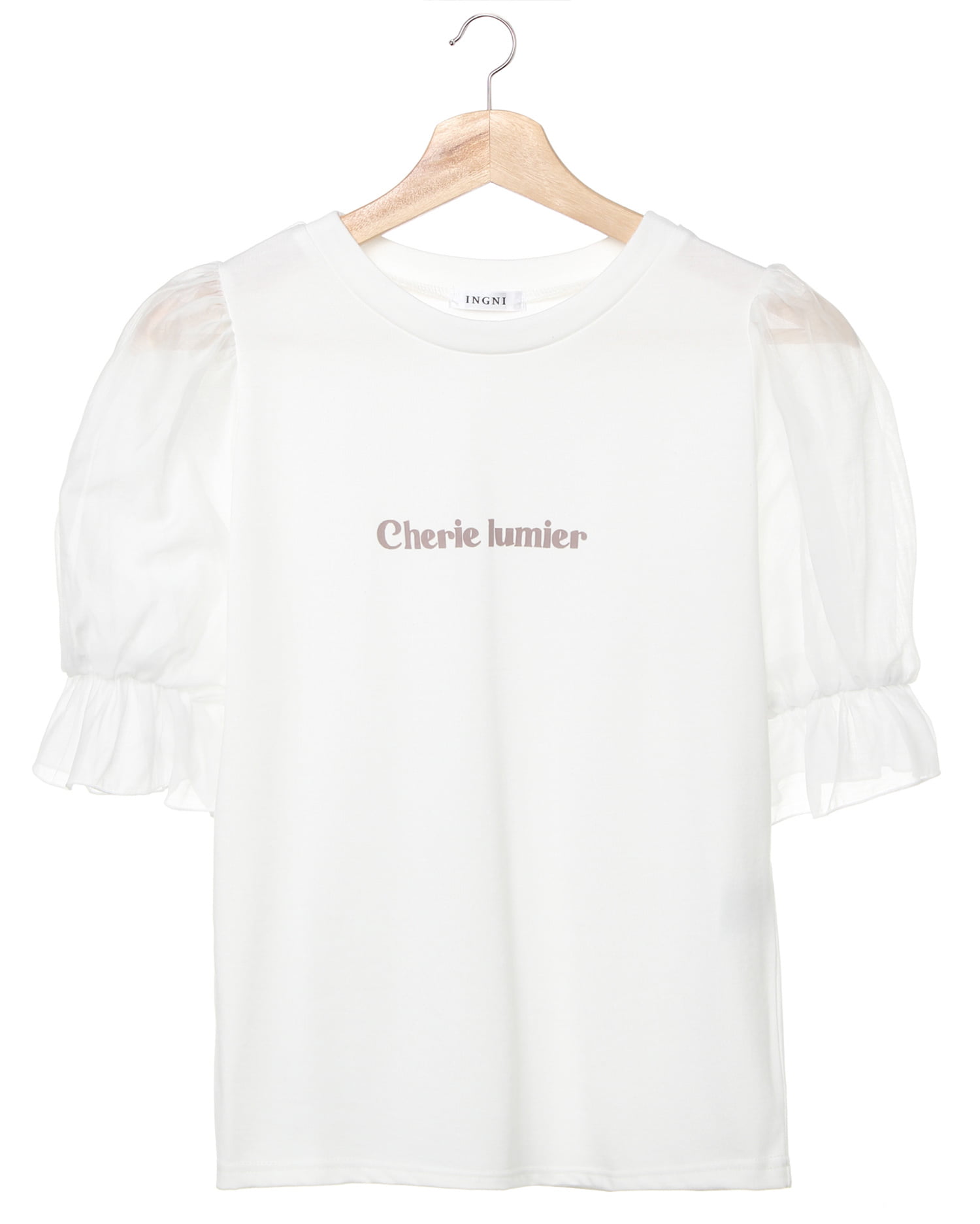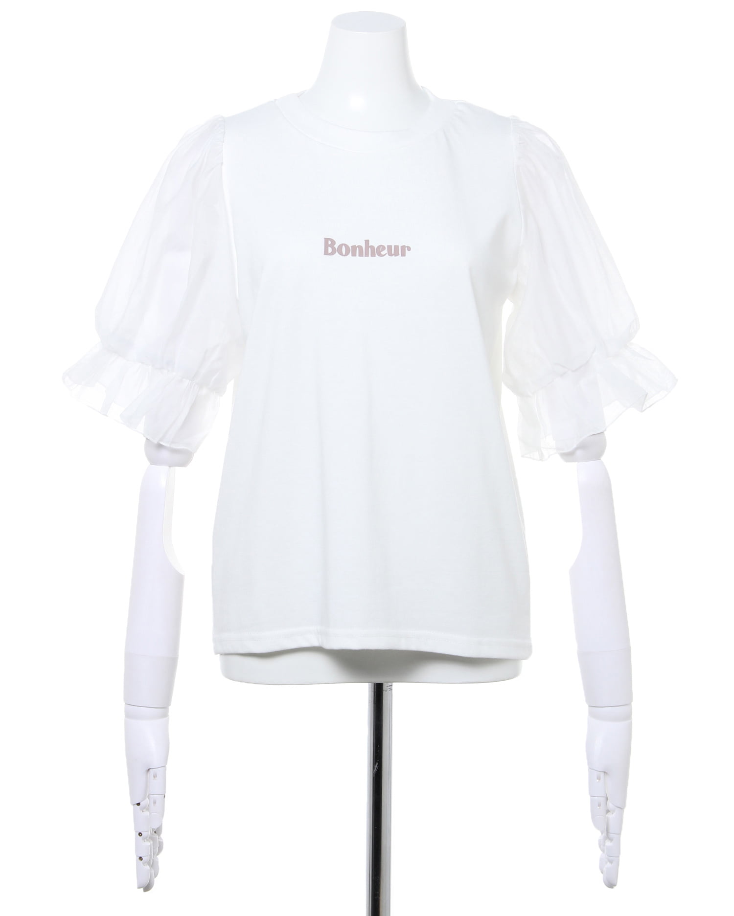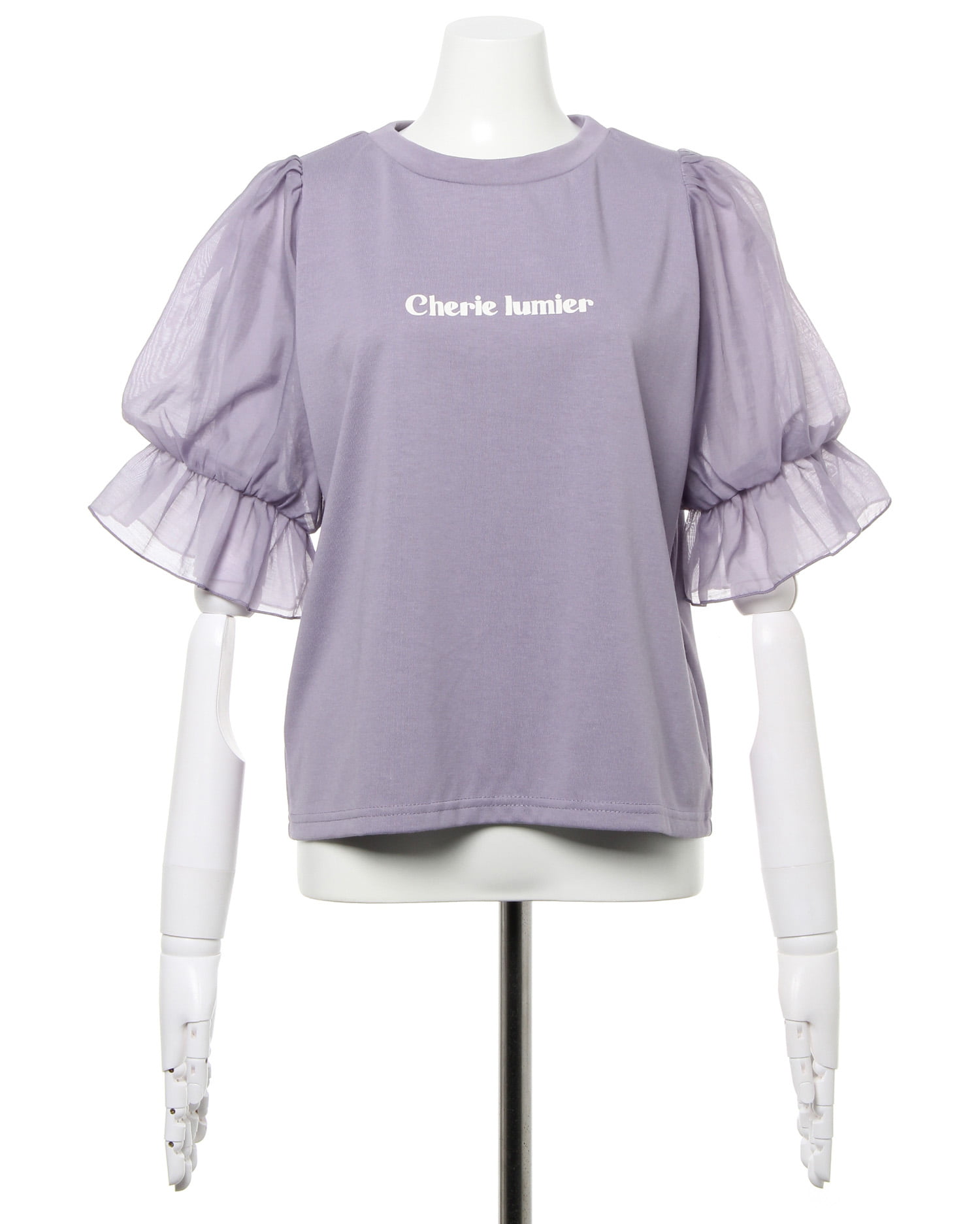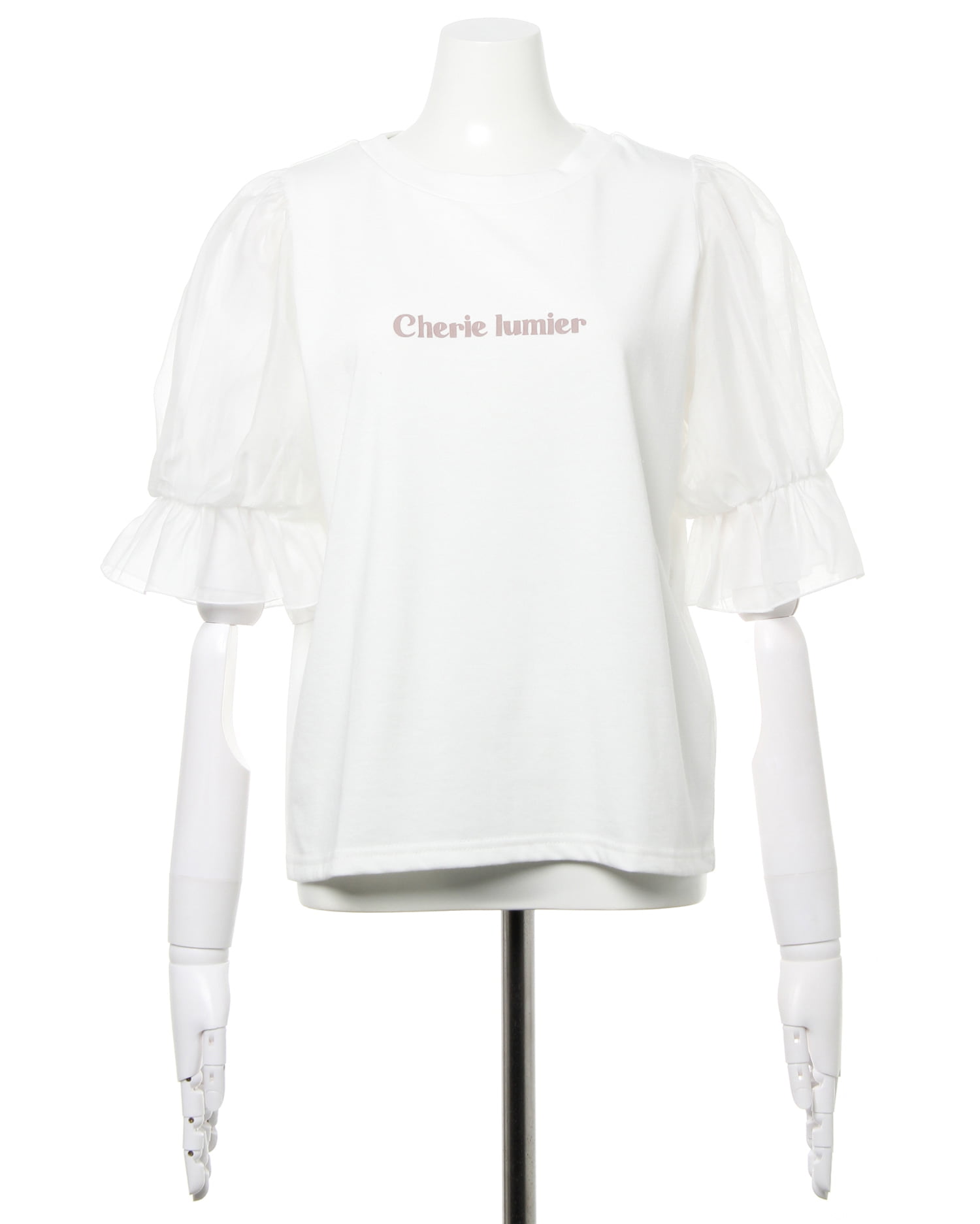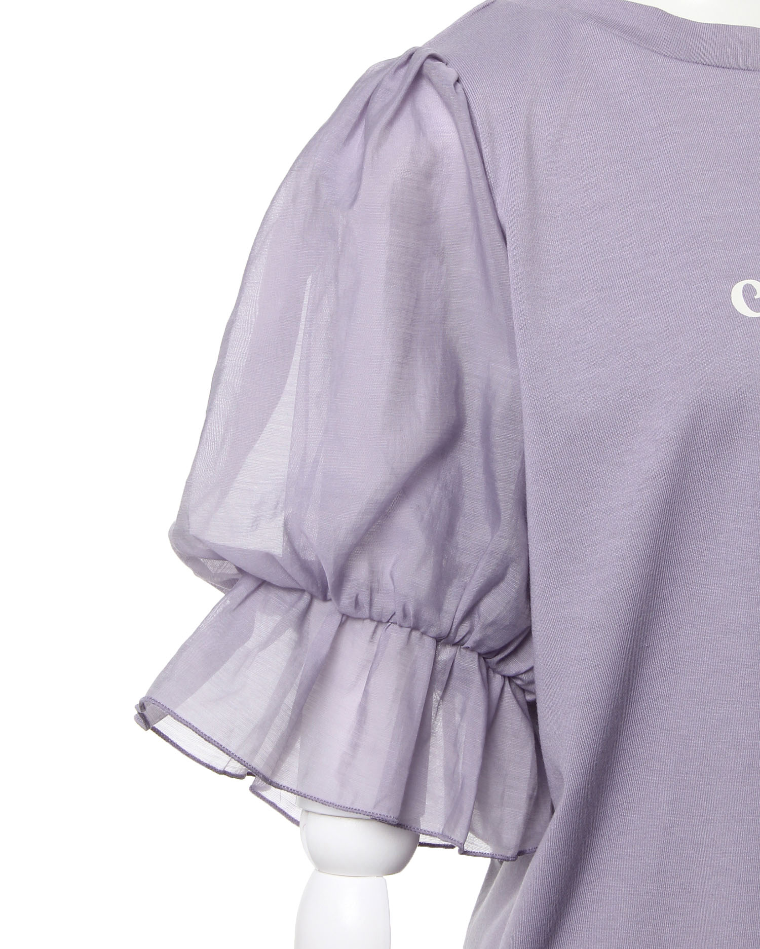 異素材で切り替えたボリュームスリーブがトレンドライクなTシャツ。ナチュラルな柔らかい素材とチュールを重ねたふんわりスリーブはほんのり肌が透けるシアー感がポイント。ボディ部分はフロントのロゴのみでシンプルに仕上げています。どんなボトムスにも合わせやすいのでデイリーに活躍。トップスインスタイルで着こなすのもおすすめです。
