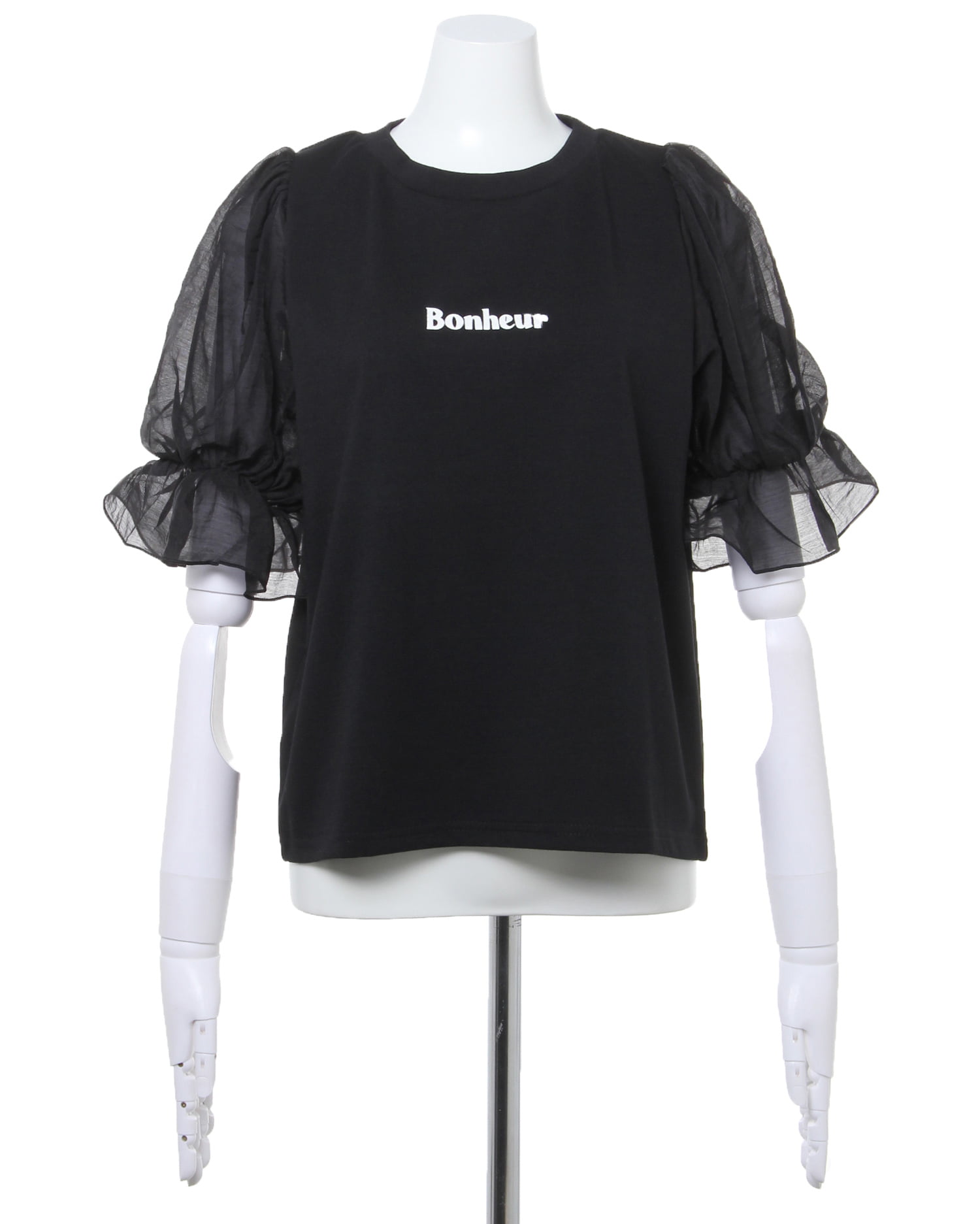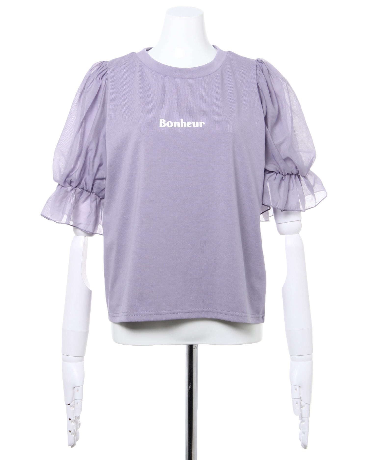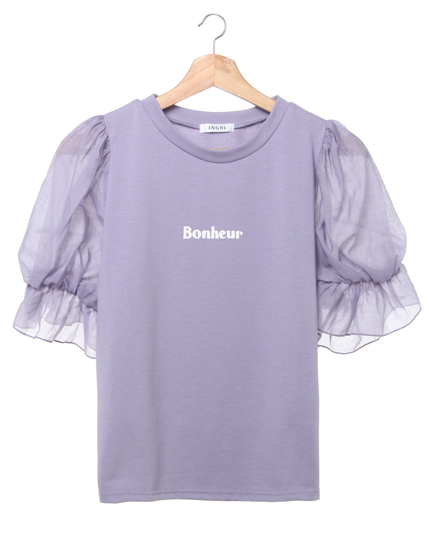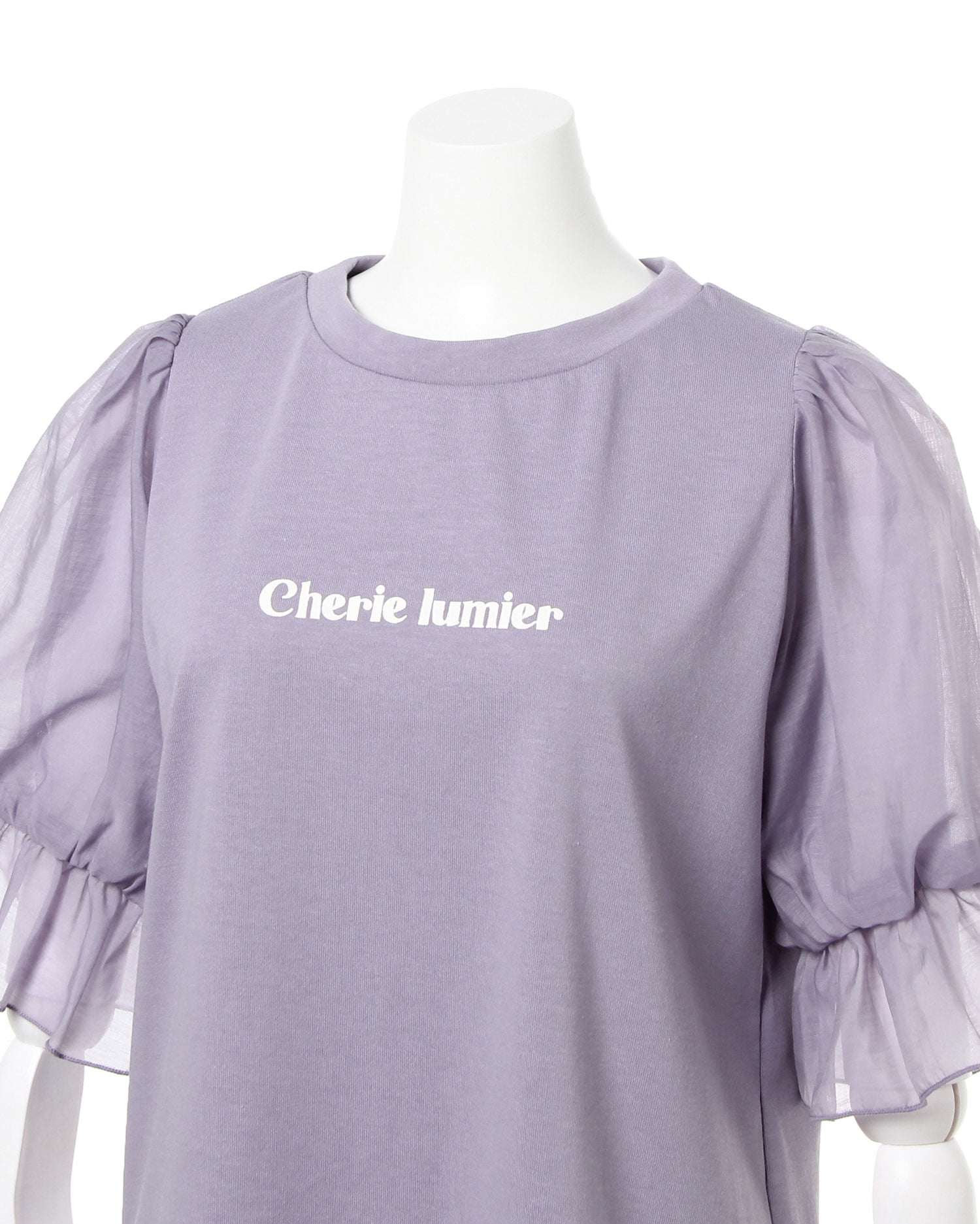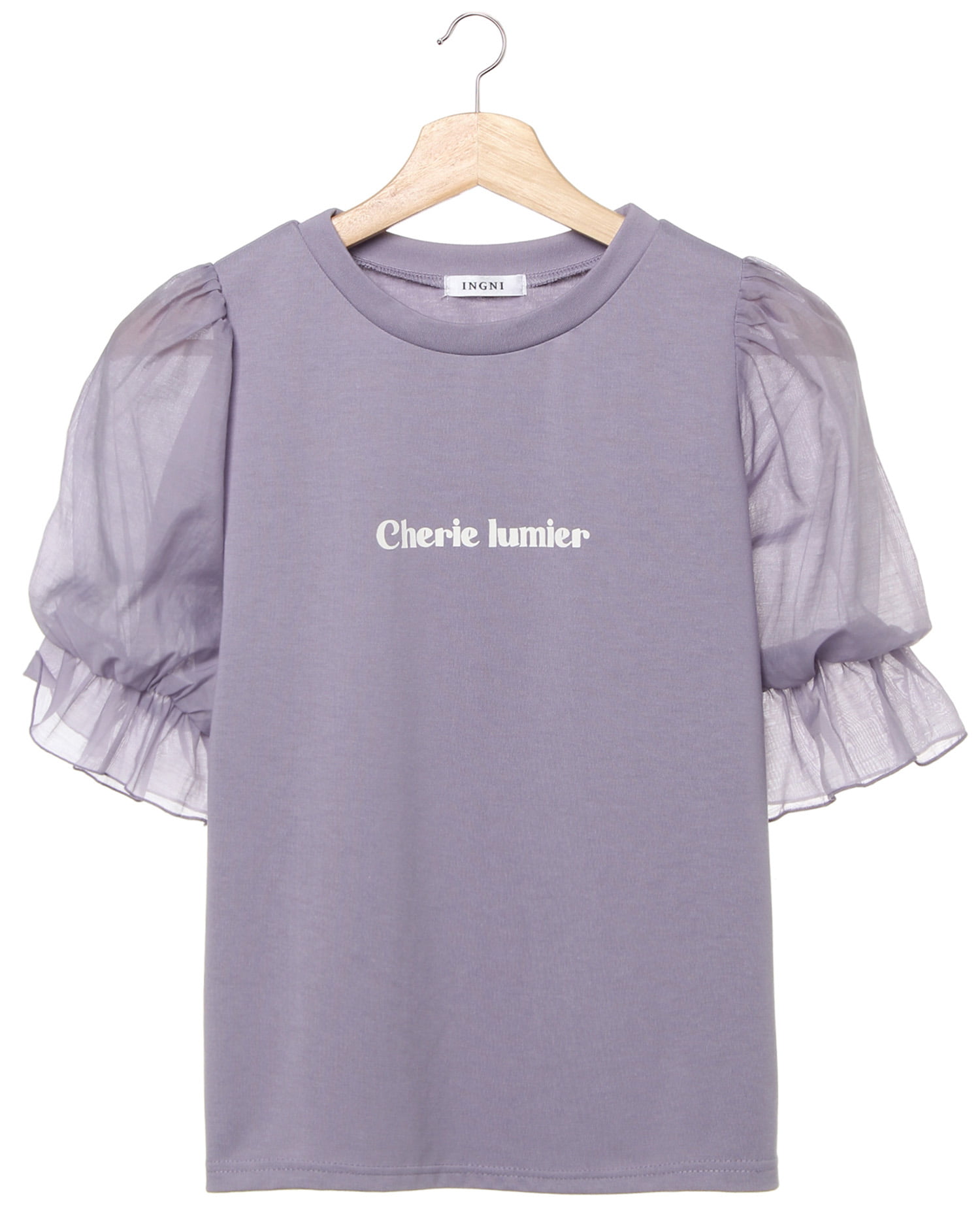 異素材で切り替えたボリュームスリーブがトレンドライクなTシャツ。ナチュラルな柔らかい素材とチュールを重ねたふんわりスリーブはほんのり肌が透けるシアー感がポイント。ボディ部分はフロントのロゴのみでシンプルに仕上げています。どんなボトムスにも合わせやすいのでデイリーに活躍。トップスインスタイルで着こなすのもおすすめです。