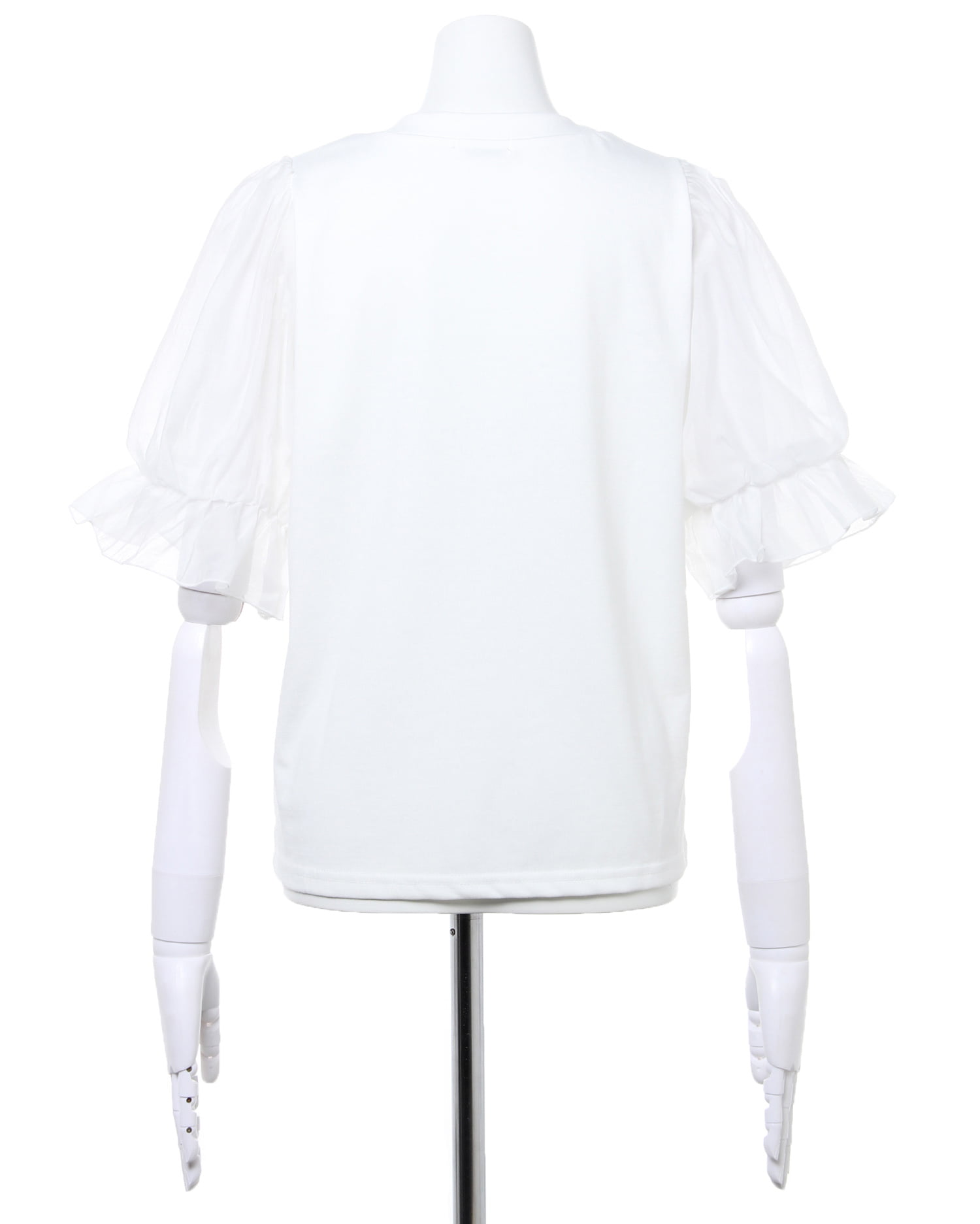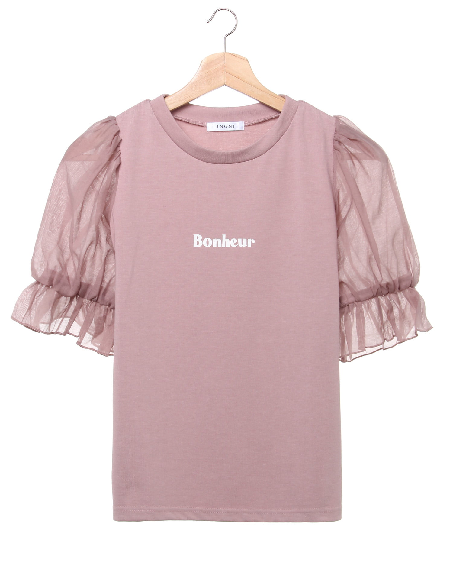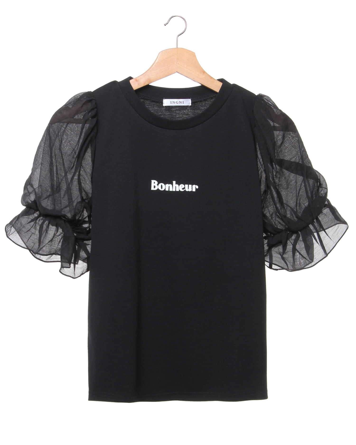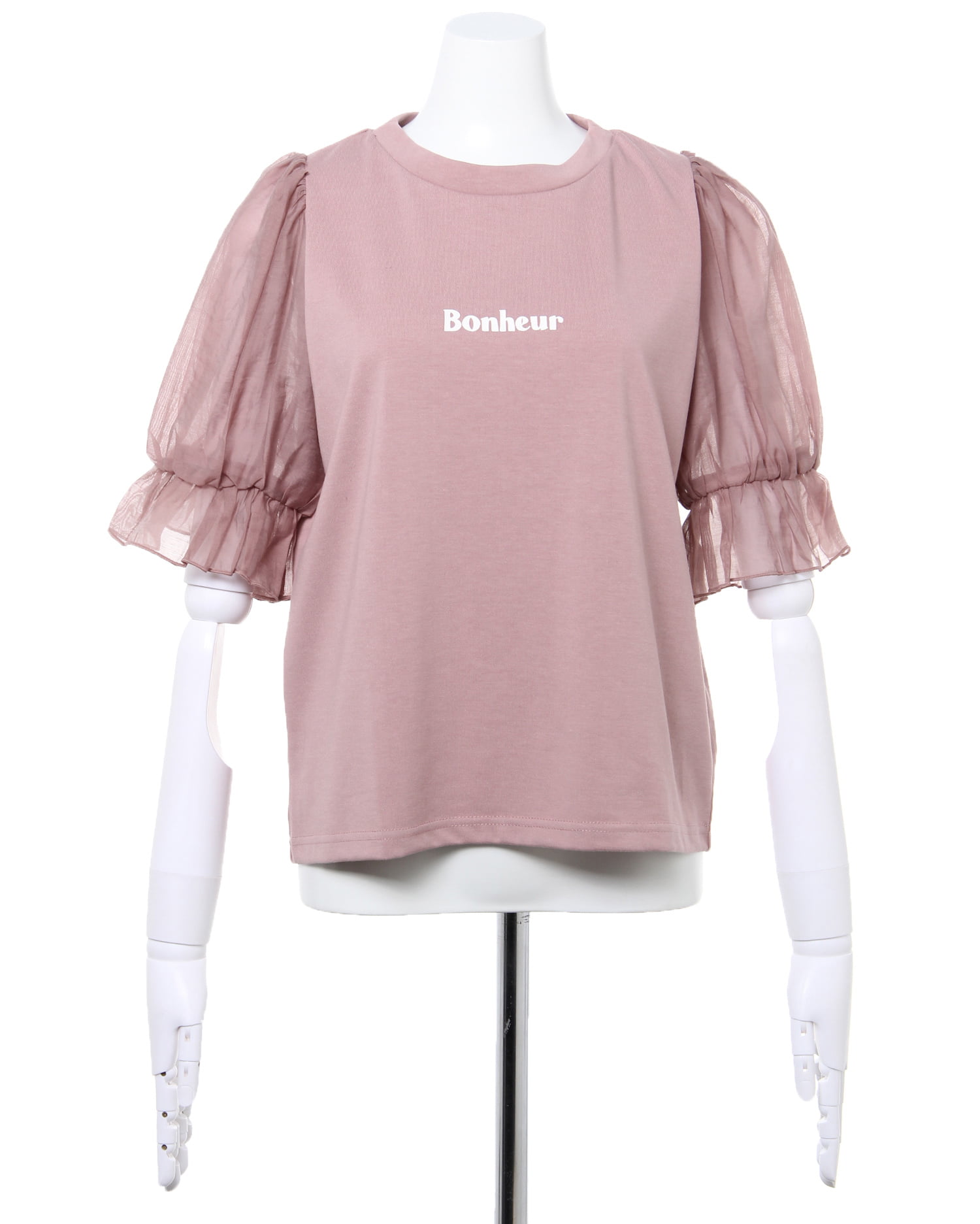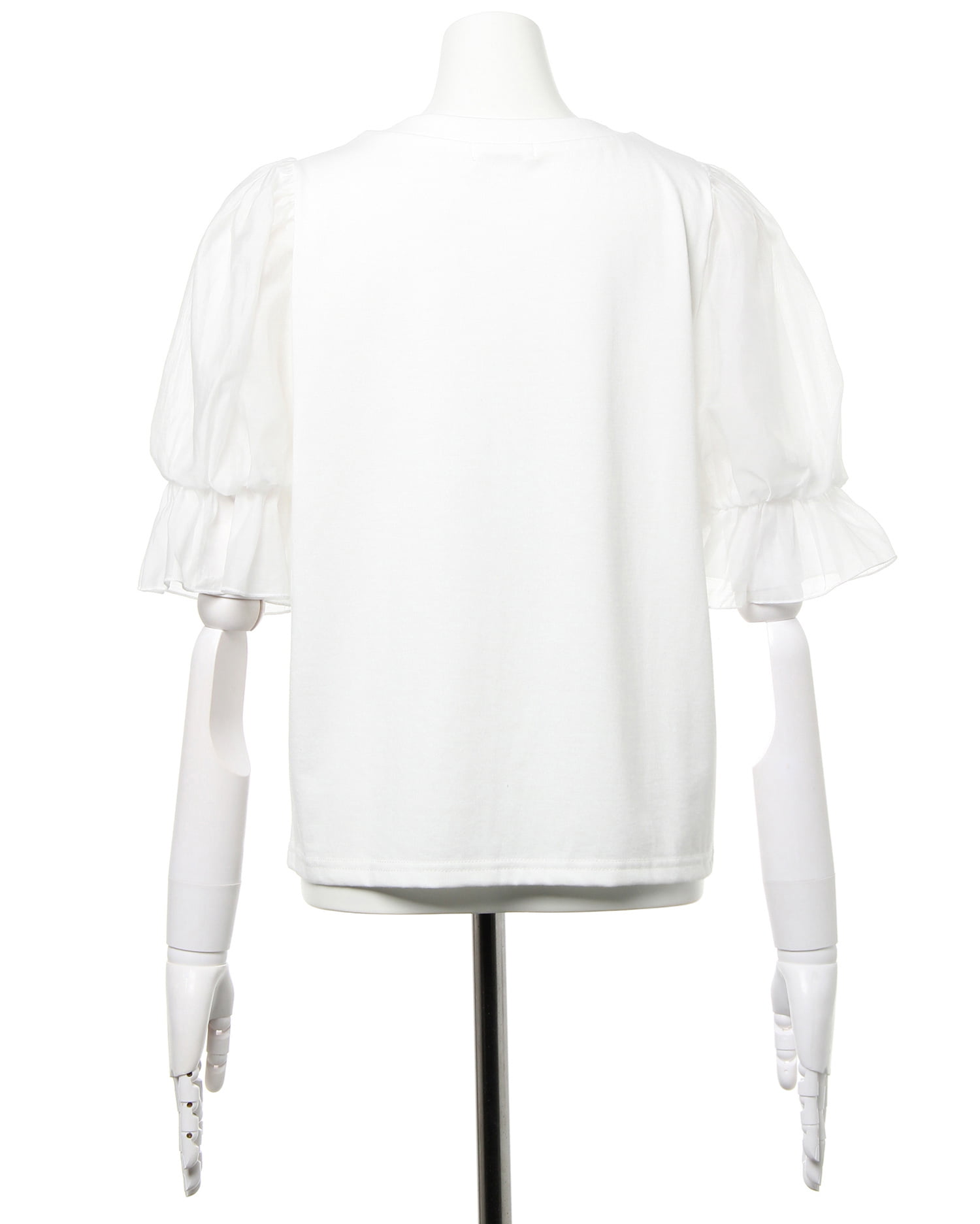 異素材で切り替えたボリュームスリーブがトレンドライクなTシャツ。ナチュラルな柔らかい素材とチュールを重ねたふんわりスリーブはほんのり肌が透けるシアー感がポイント。ボディ部分はフロントのロゴのみでシンプルに仕上げています。どんなボトムスにも合わせやすいのでデイリーに活躍。トップスインスタイルで着こなすのもおすすめです。