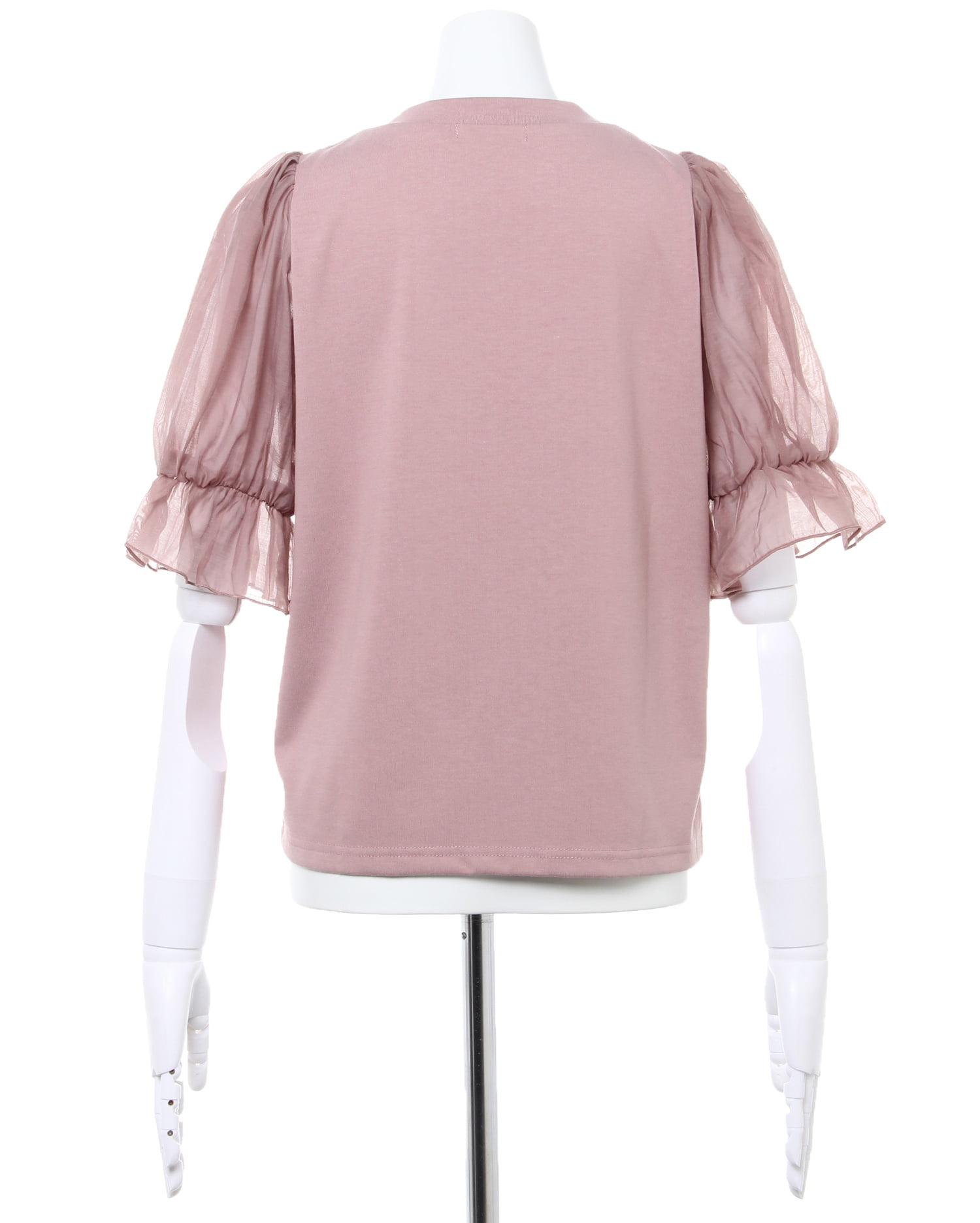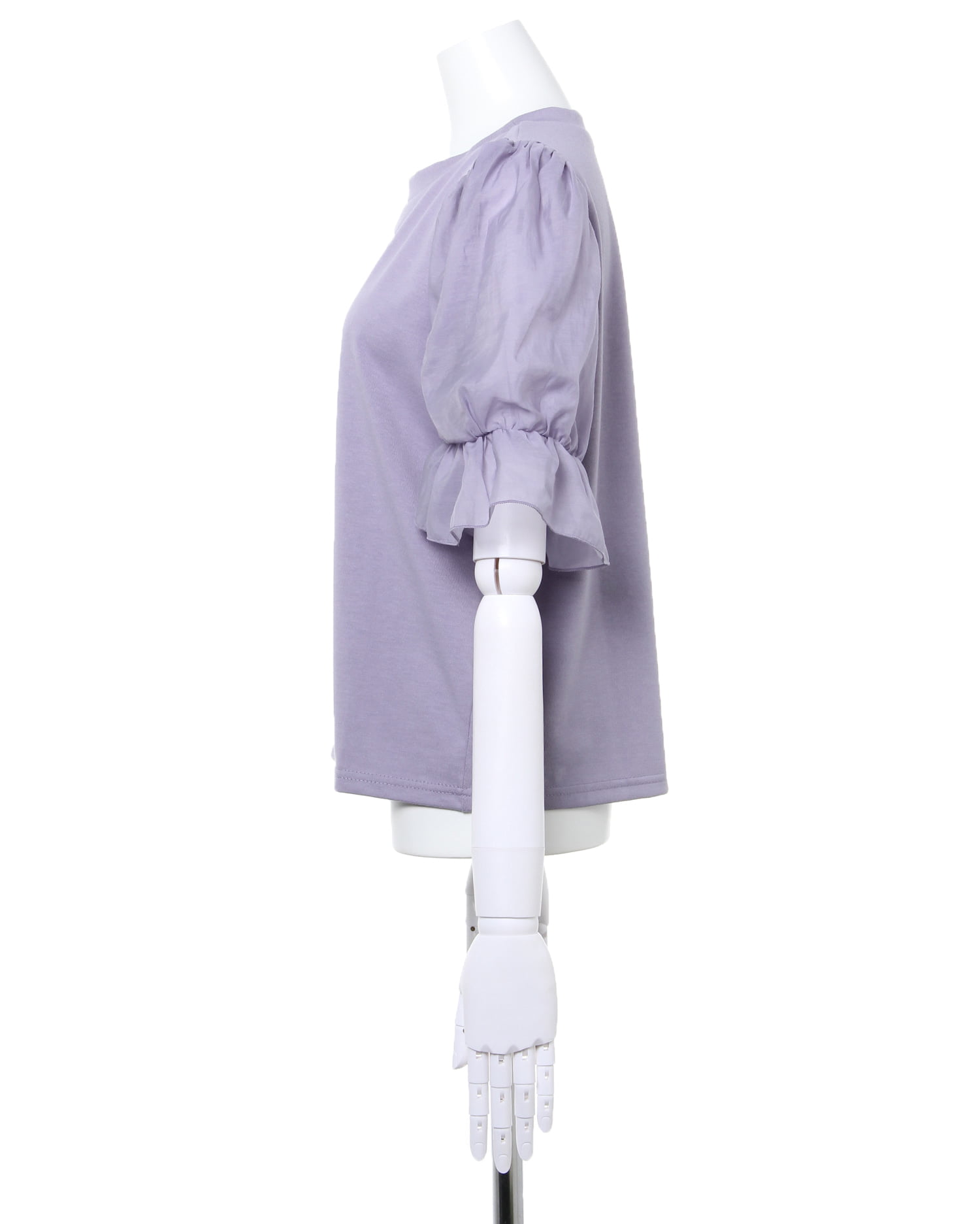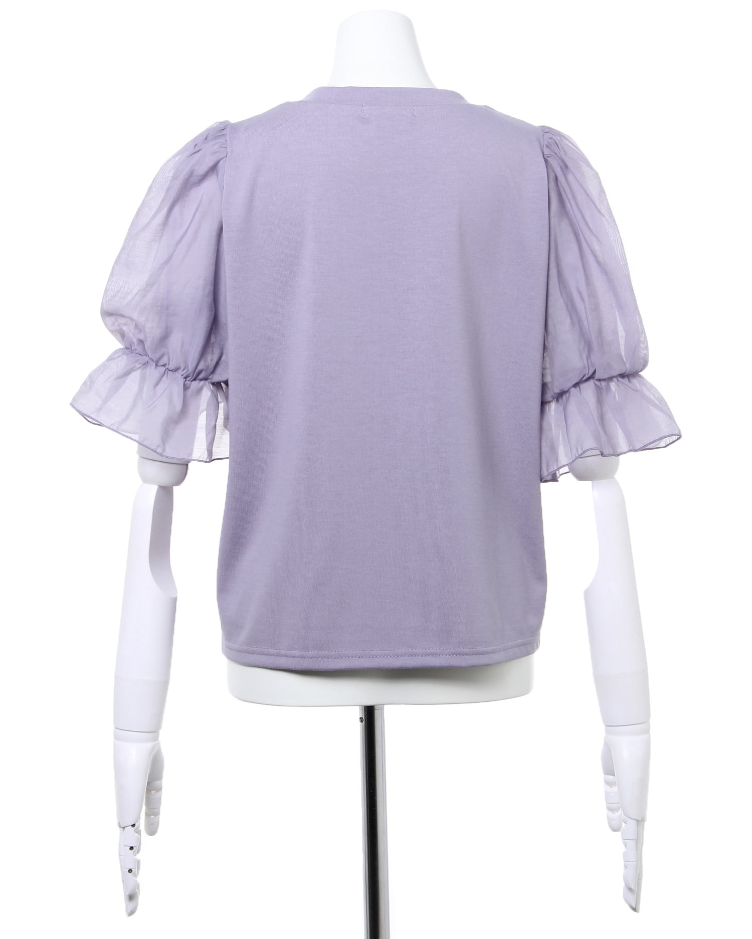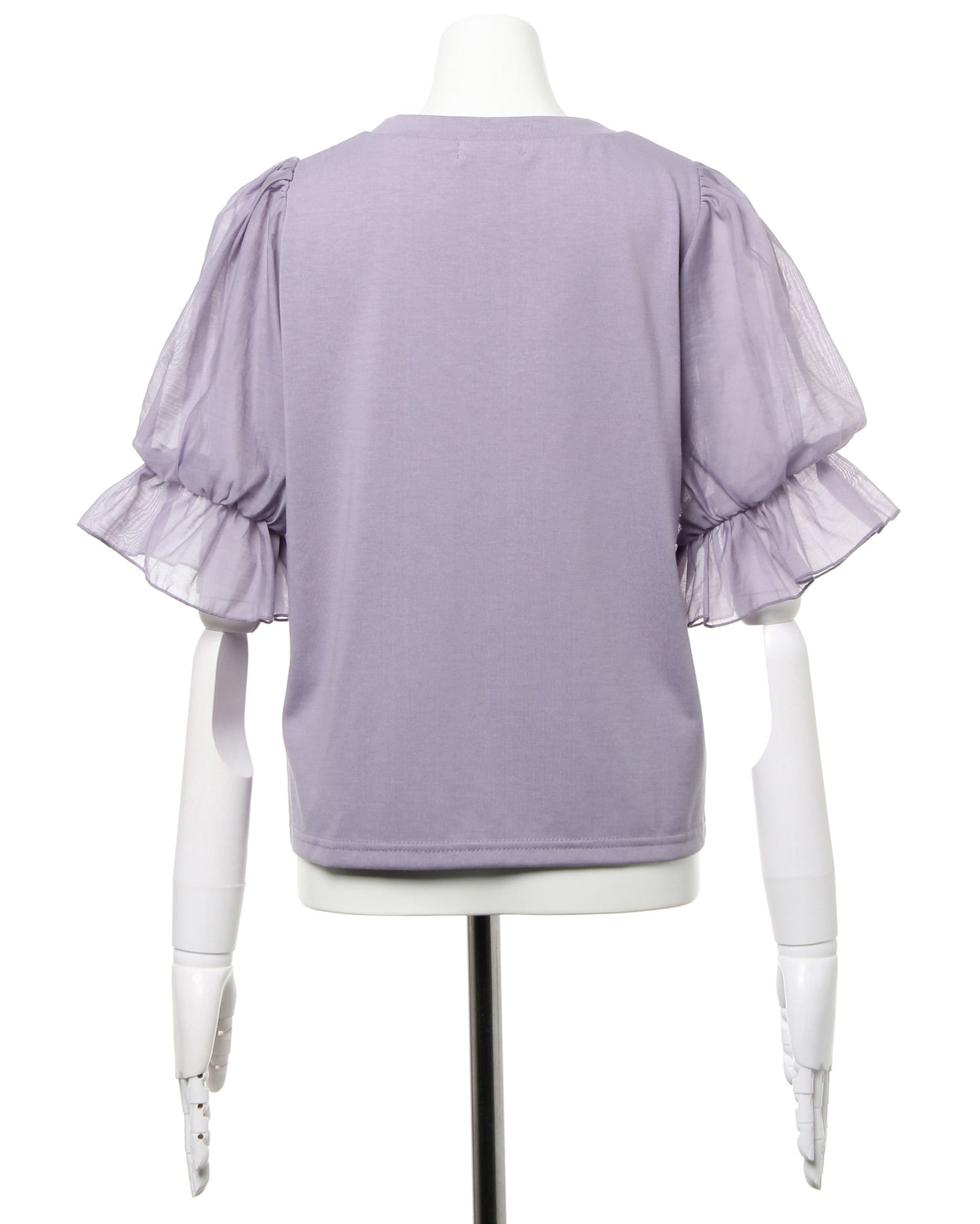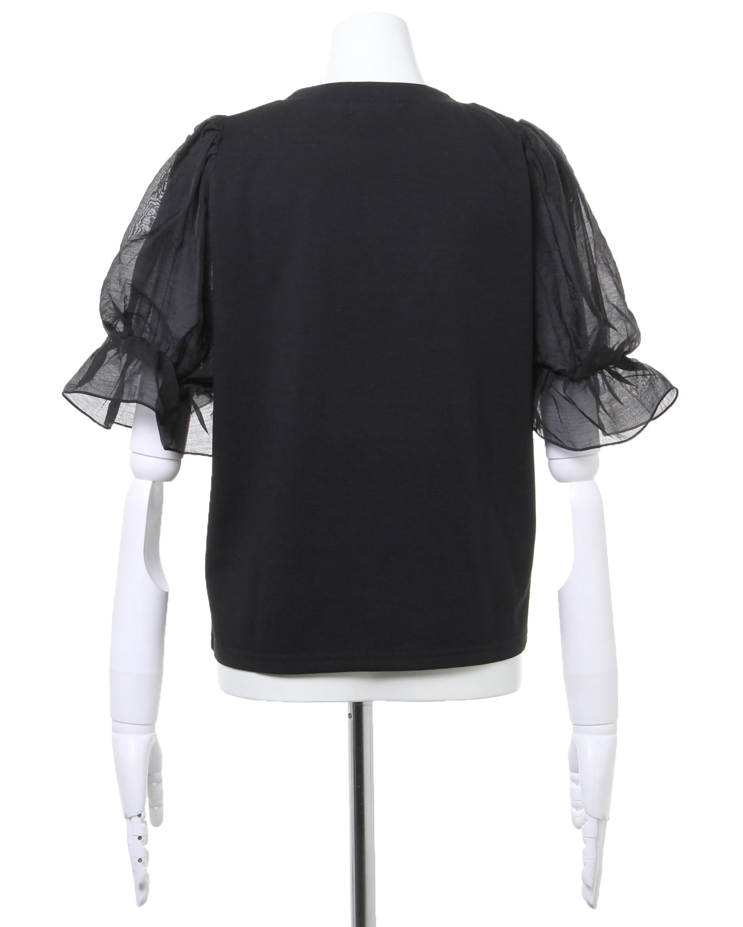 異素材で切り替えたボリュームスリーブがトレンドライクなTシャツ。ナチュラルな柔らかい素材とチュールを重ねたふんわりスリーブはほんのり肌が透けるシアー感がポイント。ボディ部分はフロントのロゴのみでシンプルに仕上げています。どんなボトムスにも合わせやすいのでデイリーに活躍。トップスインスタイルで着こなすのもおすすめです。